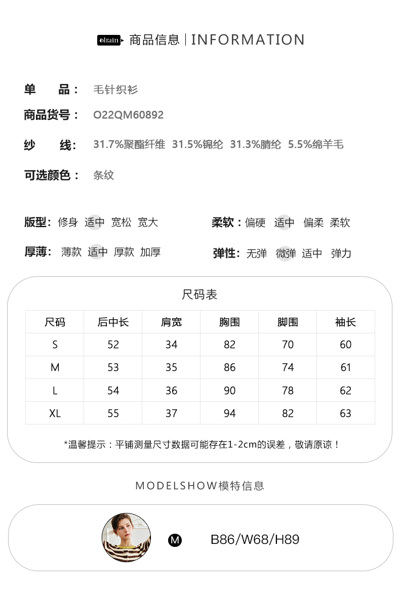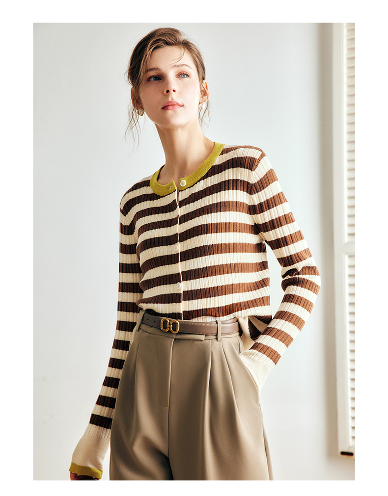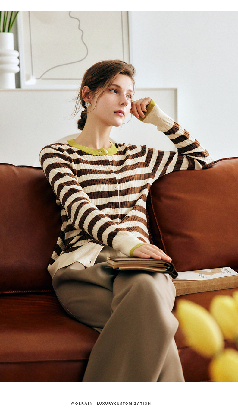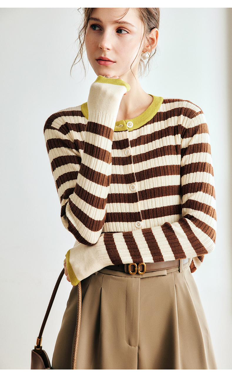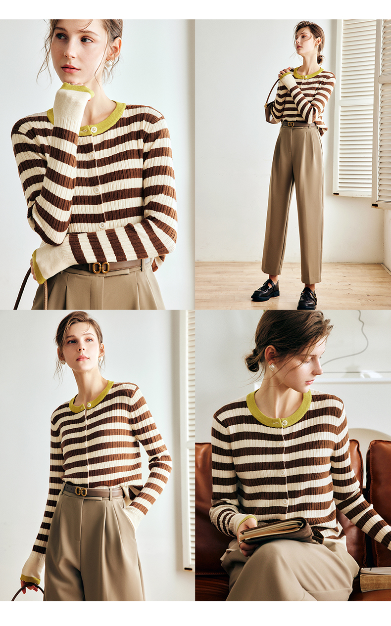 OLrain欧芮儿法式条纹针织开衫女早秋2022新款慵懒风撞色圆领上衣