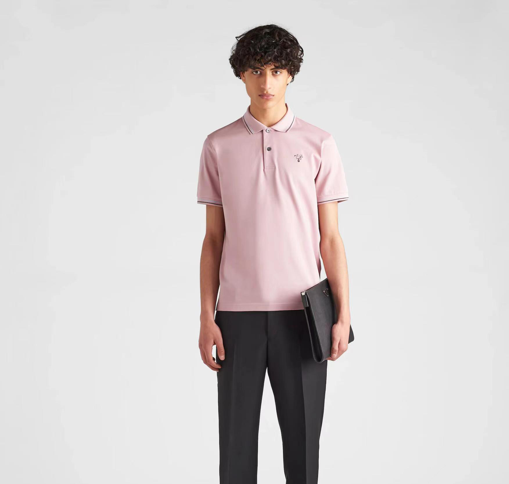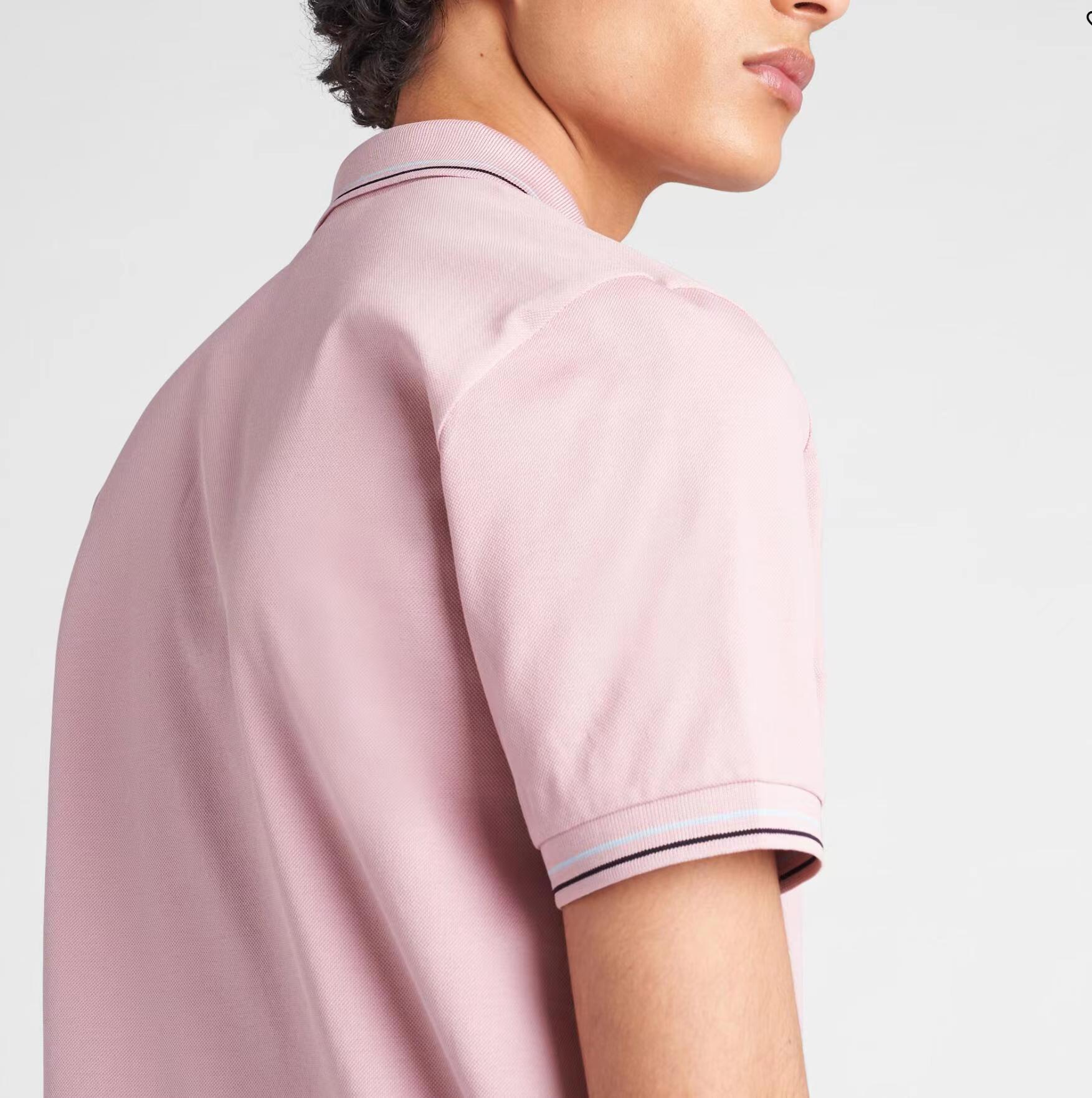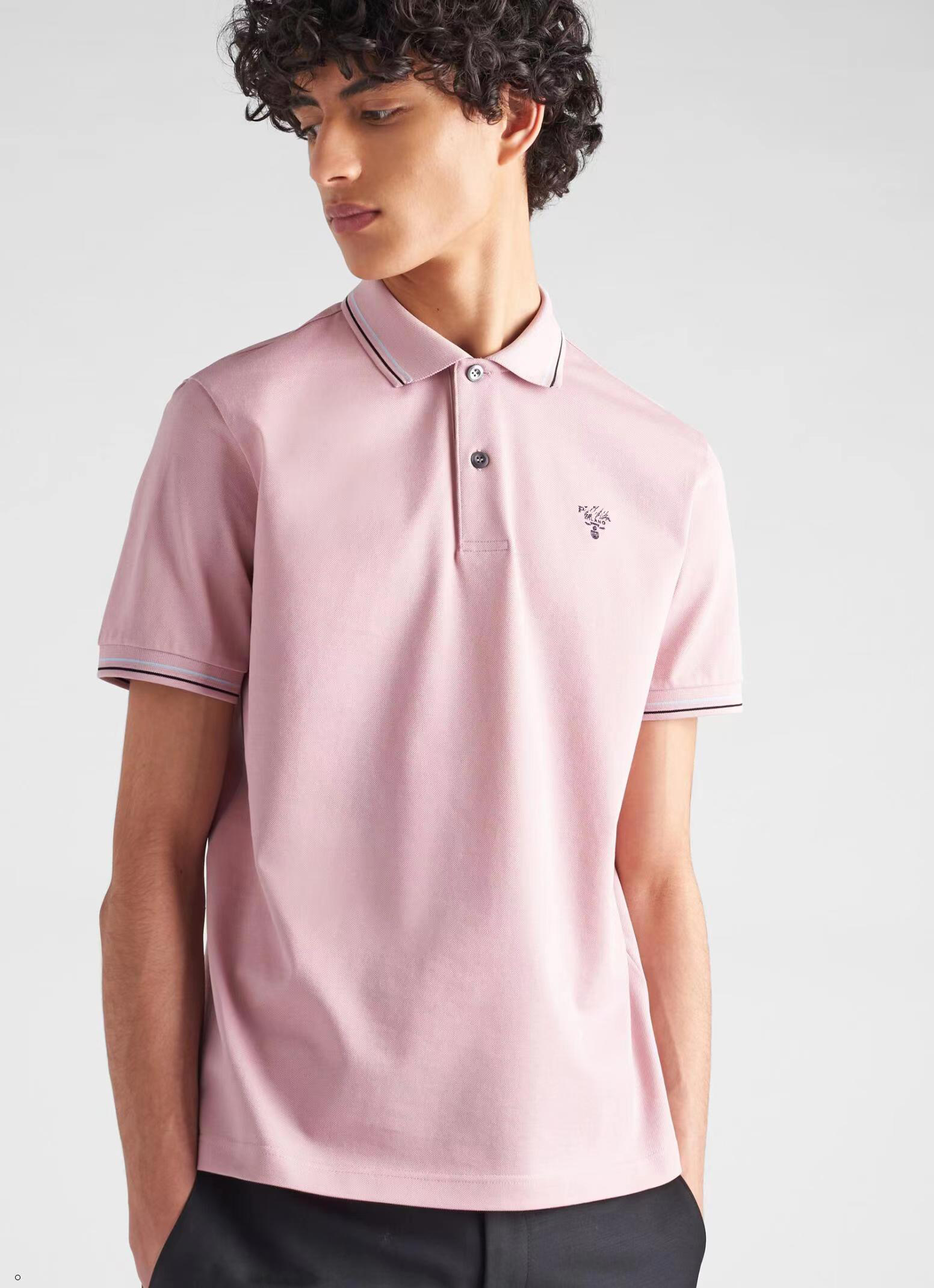 简约POLO衫小绣花春夏普拉达休闲翻领衫官网同款上架,50支双精梳丝光棉小蜂窝朱地定制面料,官网同款,洗水定型后240G.,低饱和度的色系撞色经典浅蓝色线条,经典耐看,低调奢华中上身休闲又不失商务风度,标志点缀,纯棉的材质,舒适耐穿。
