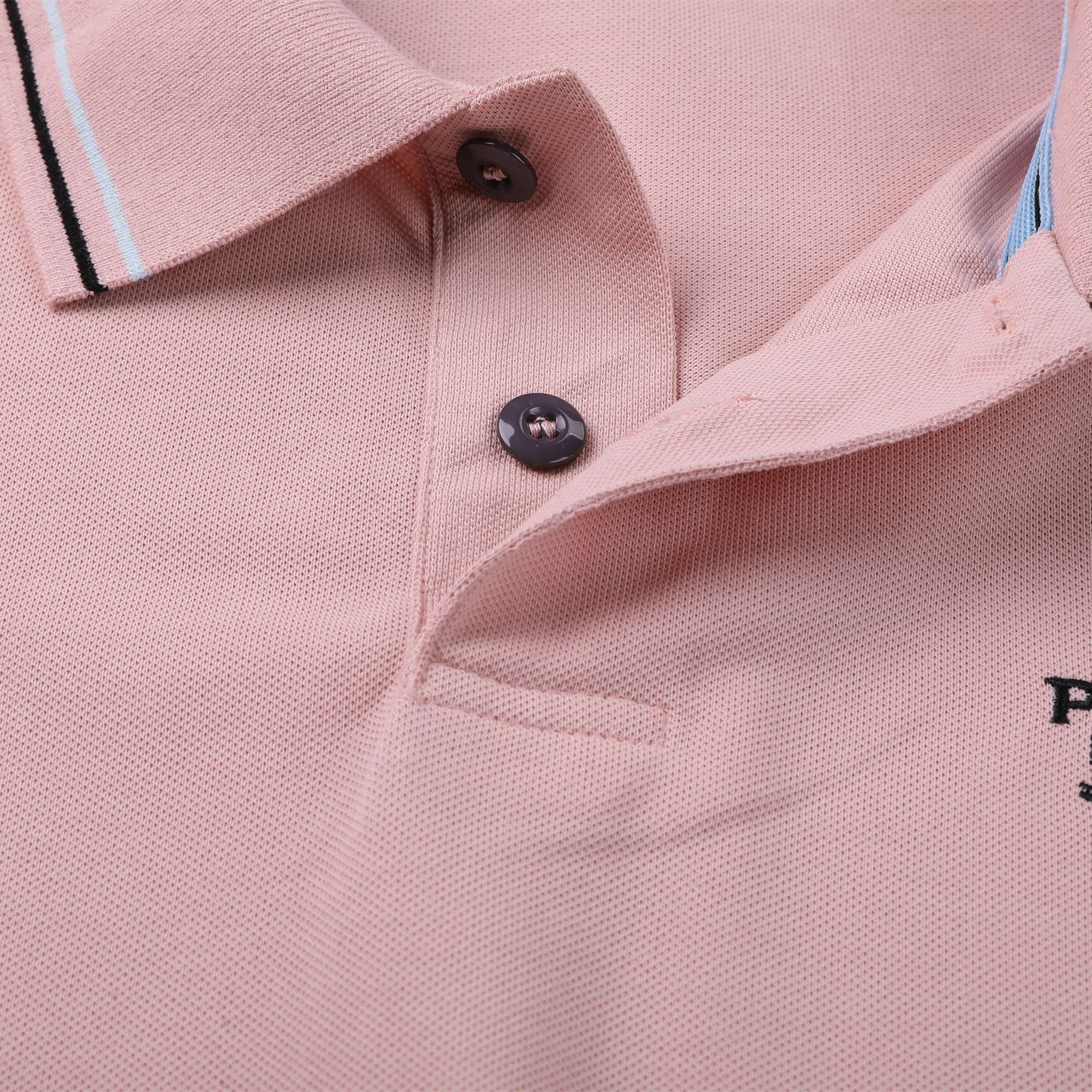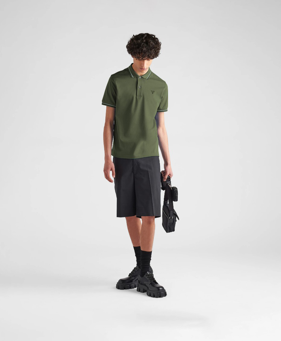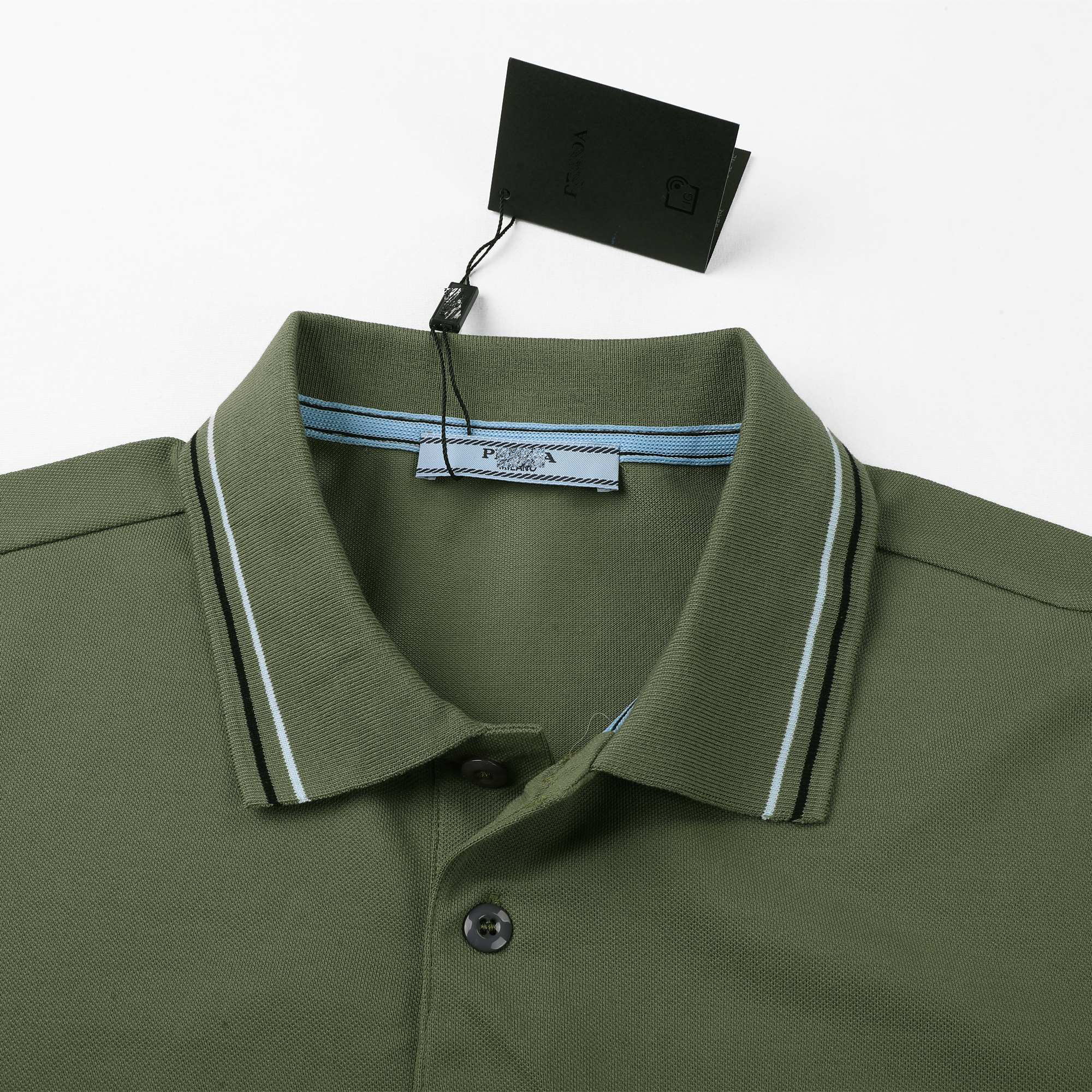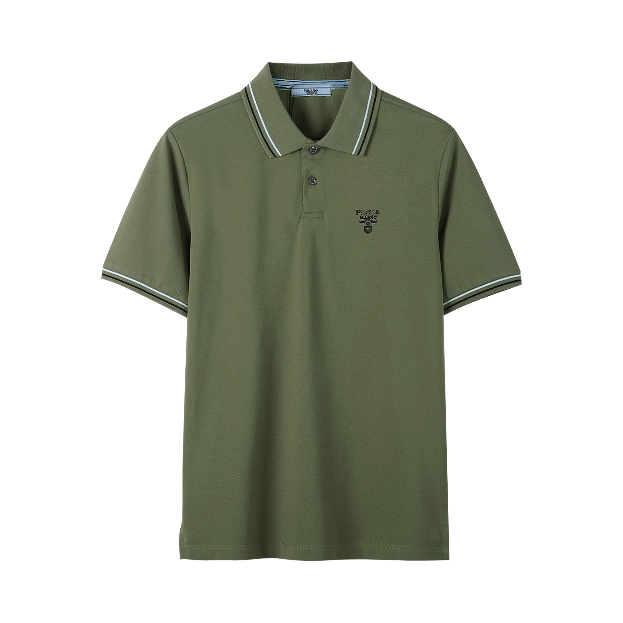 简约POLO衫小绣花春夏普拉达休闲翻领衫官网同款上架,50支双精梳丝光棉小蜂窝朱地定制面料,官网同款,洗水定型后240G.,低饱和度的色系撞色经典浅蓝色线条,经典耐看,低调奢华中上身休闲又不失商务风度,标志点缀,纯棉的材质,舒适耐穿。