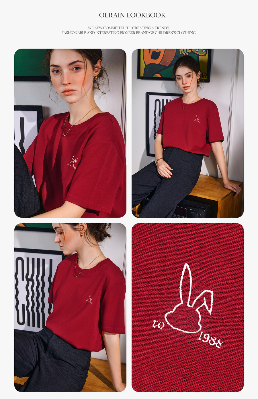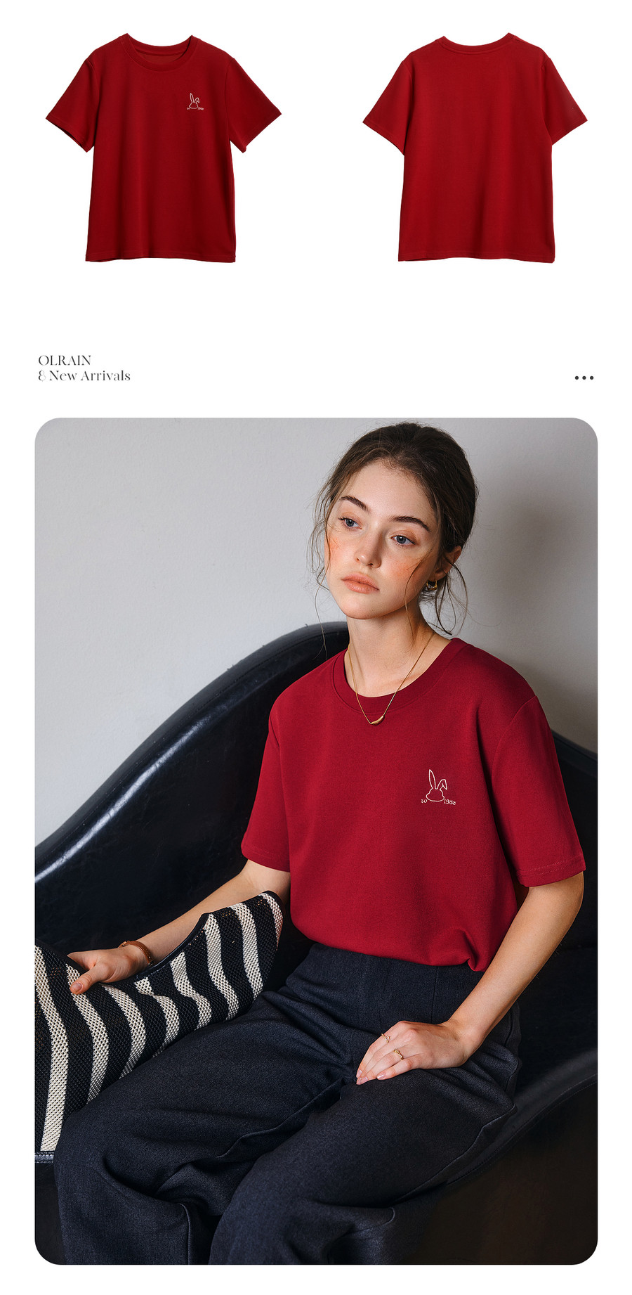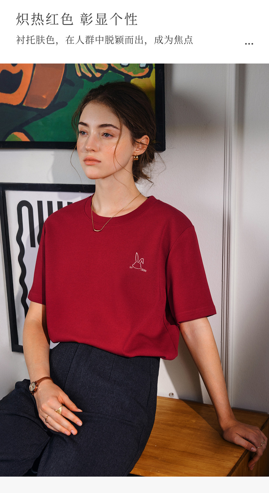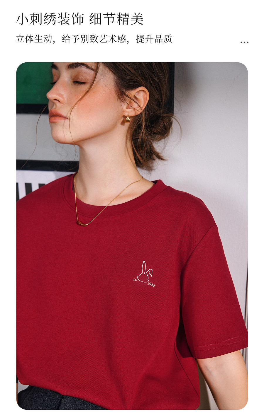 欧芮儿2026年新款夏季红色绣花设计感圆领宽松短袖休闲简约T恤女