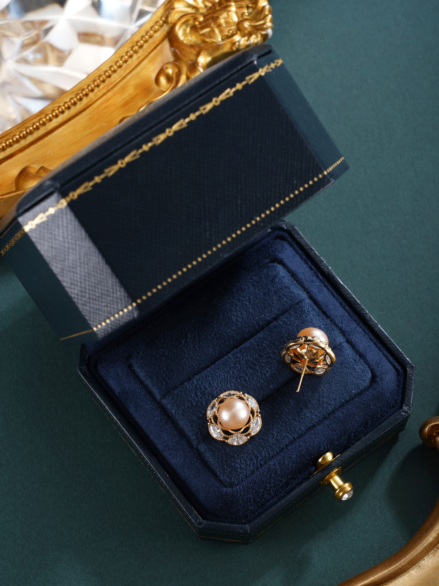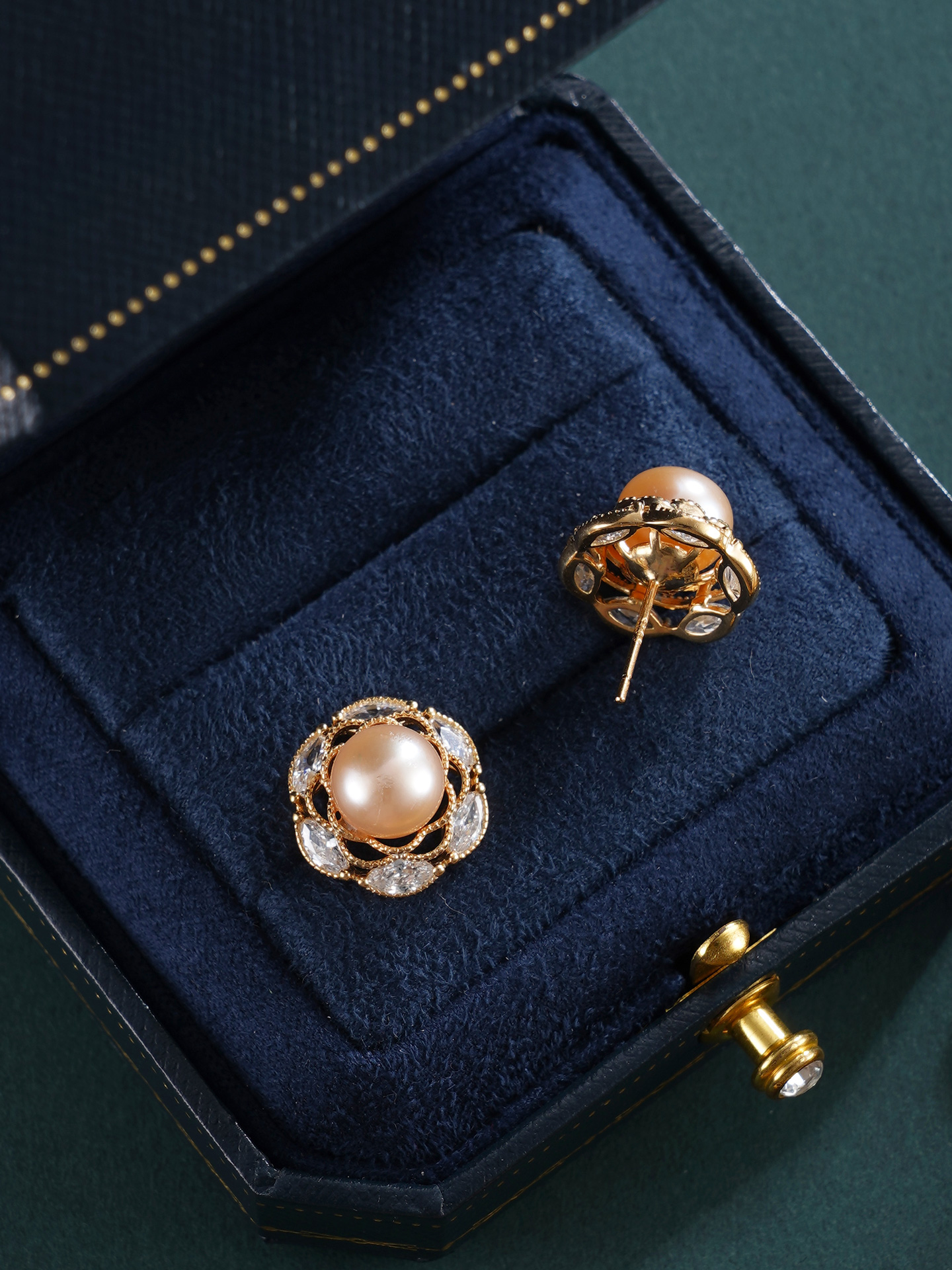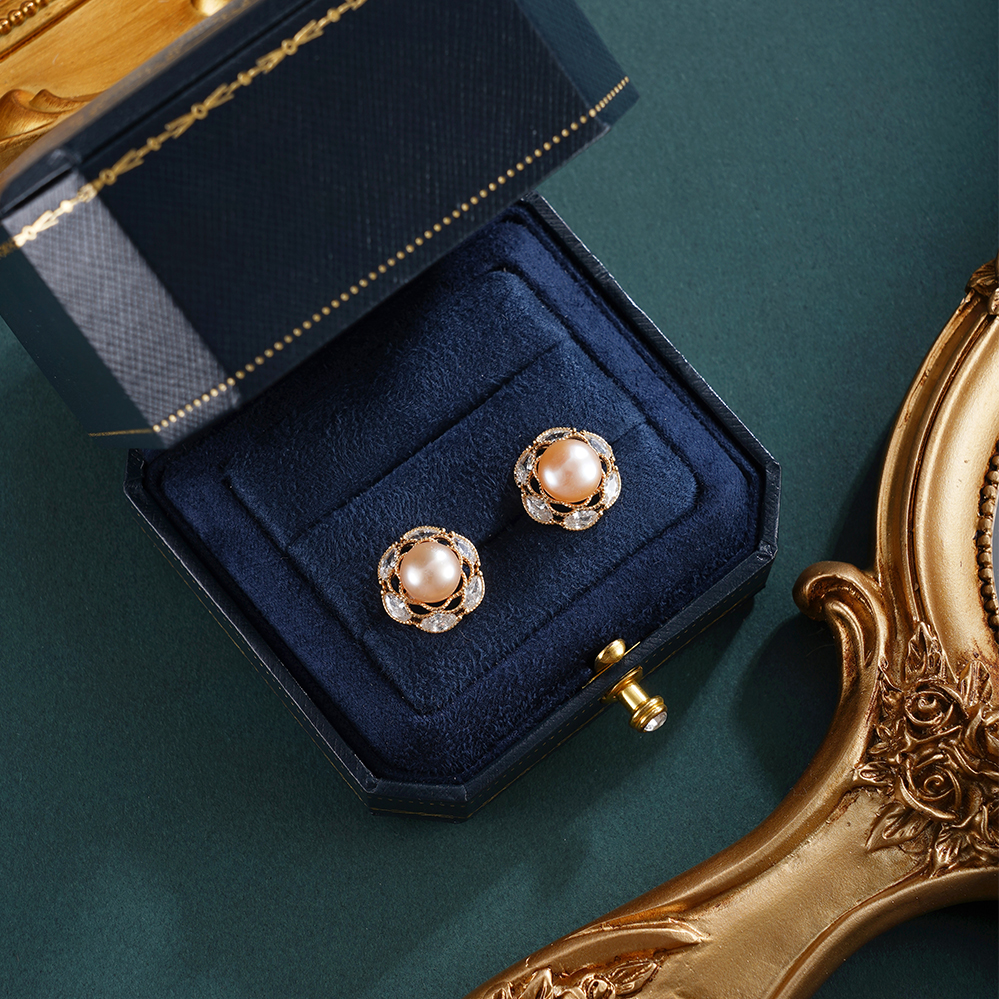 子佩集【沁园秀色】银S925珍珠惜王妃耳钉【E4739】8.5mm珠镀金花绕六瓣花2601