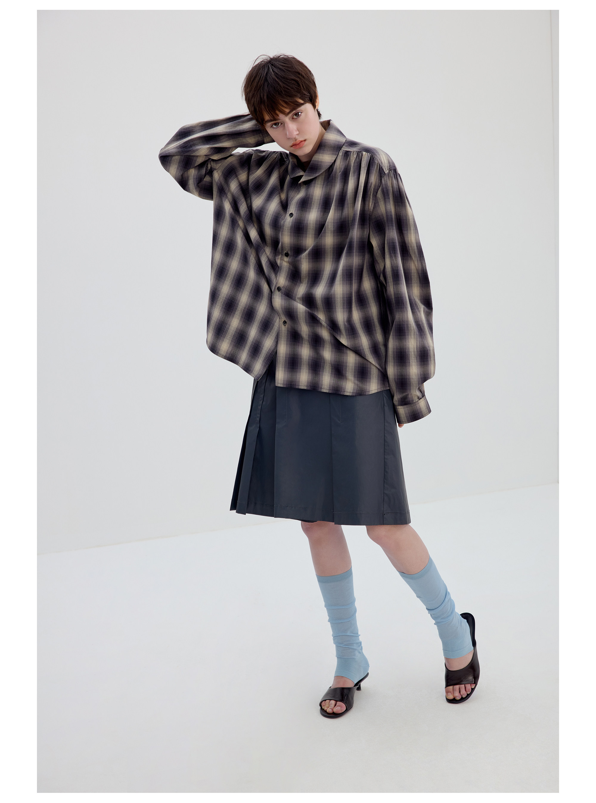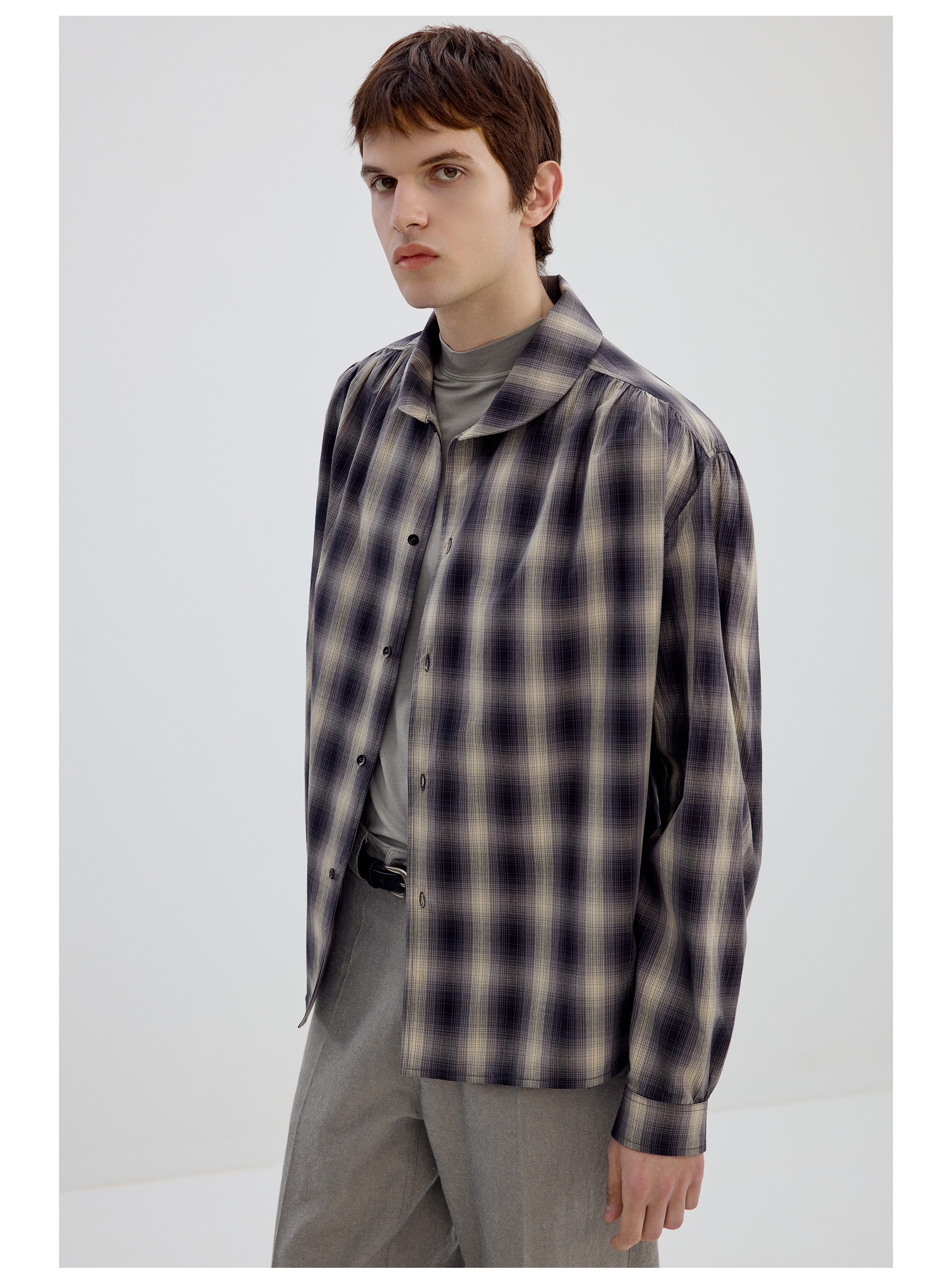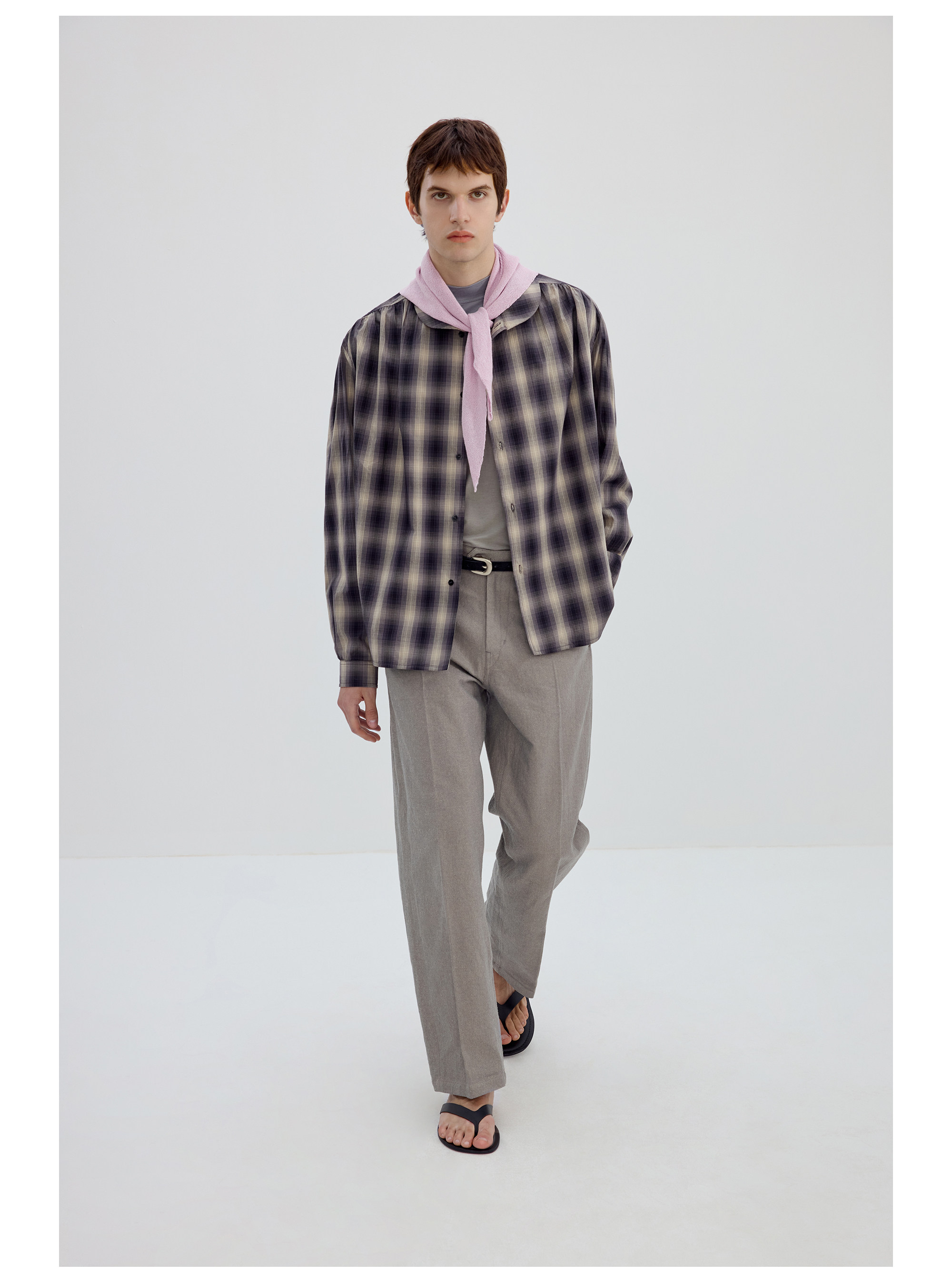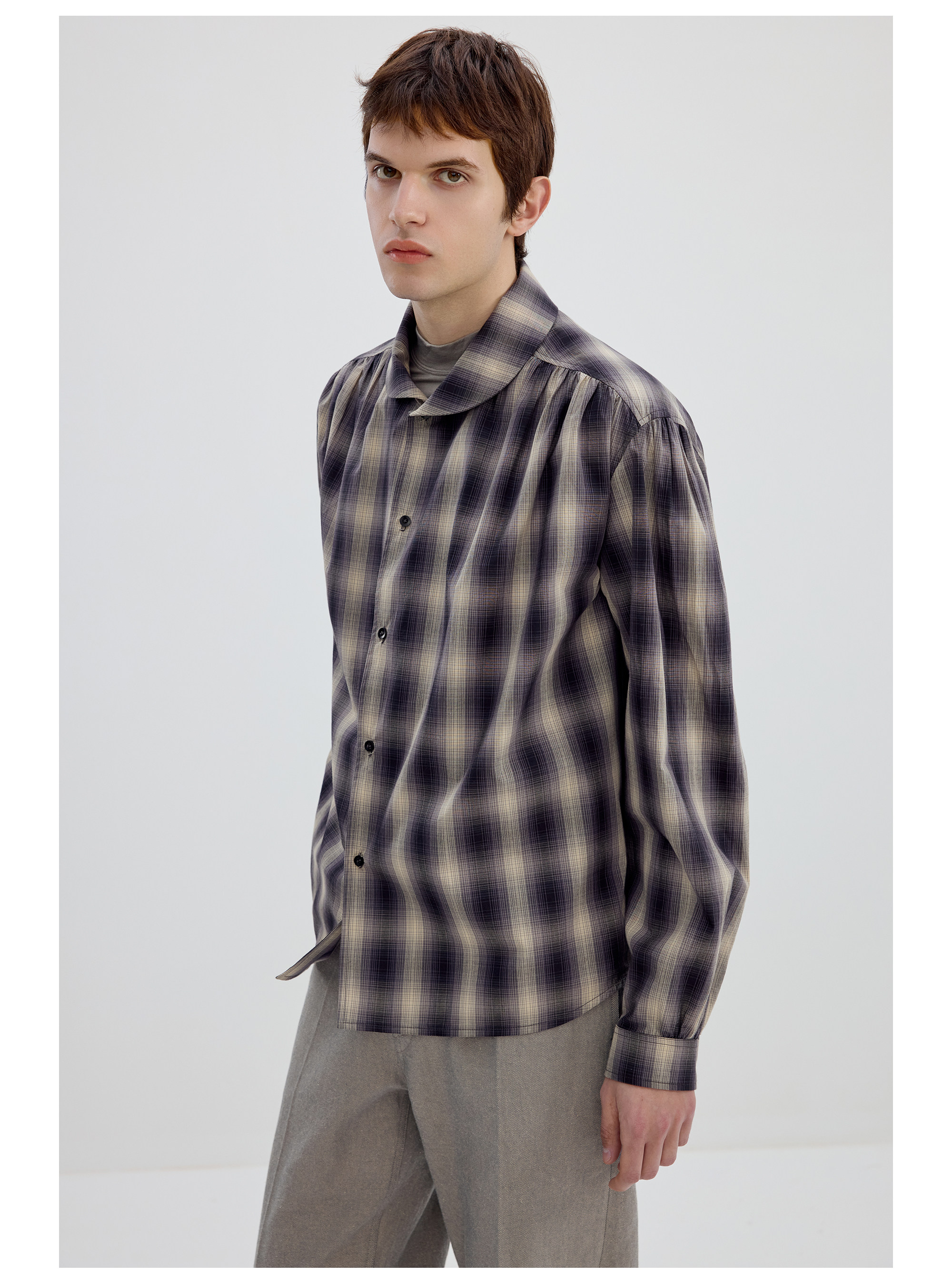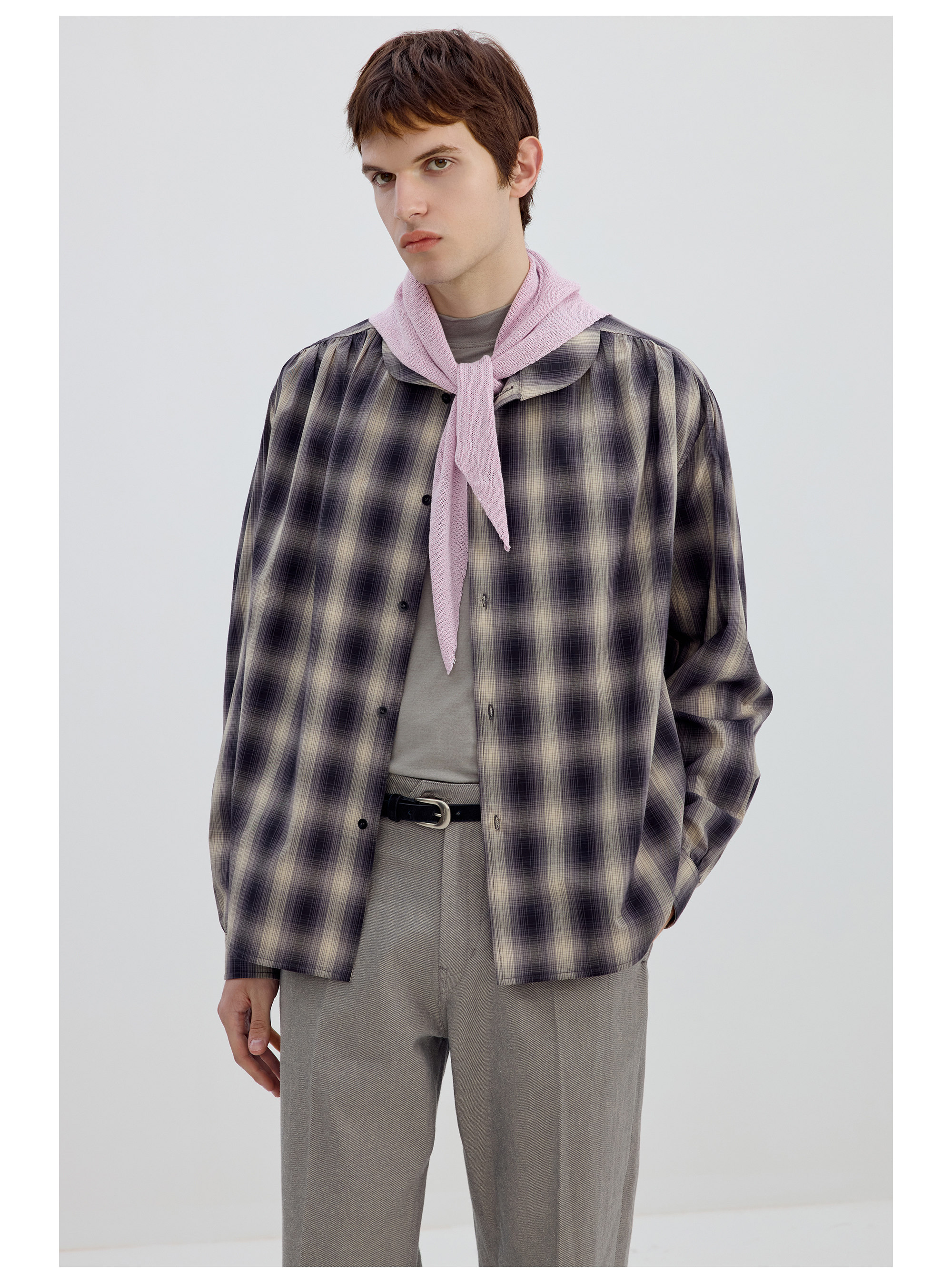 Simple Project/Y2633/青果领紫米格纹抽皱衬衫
