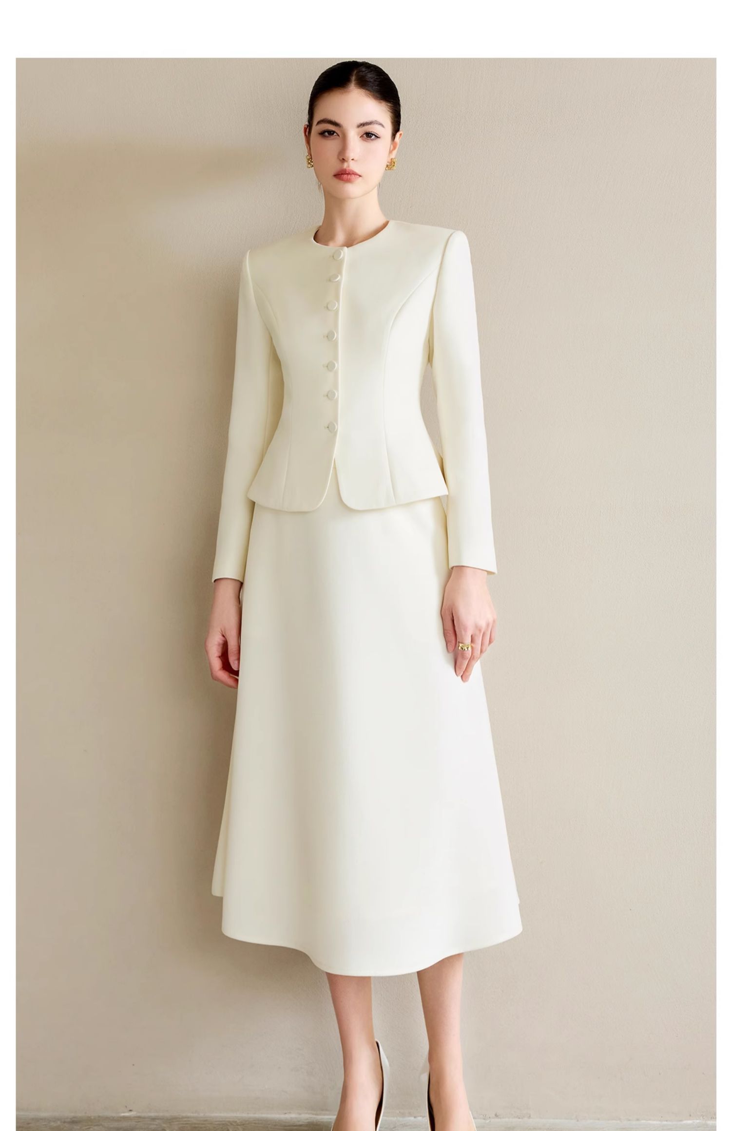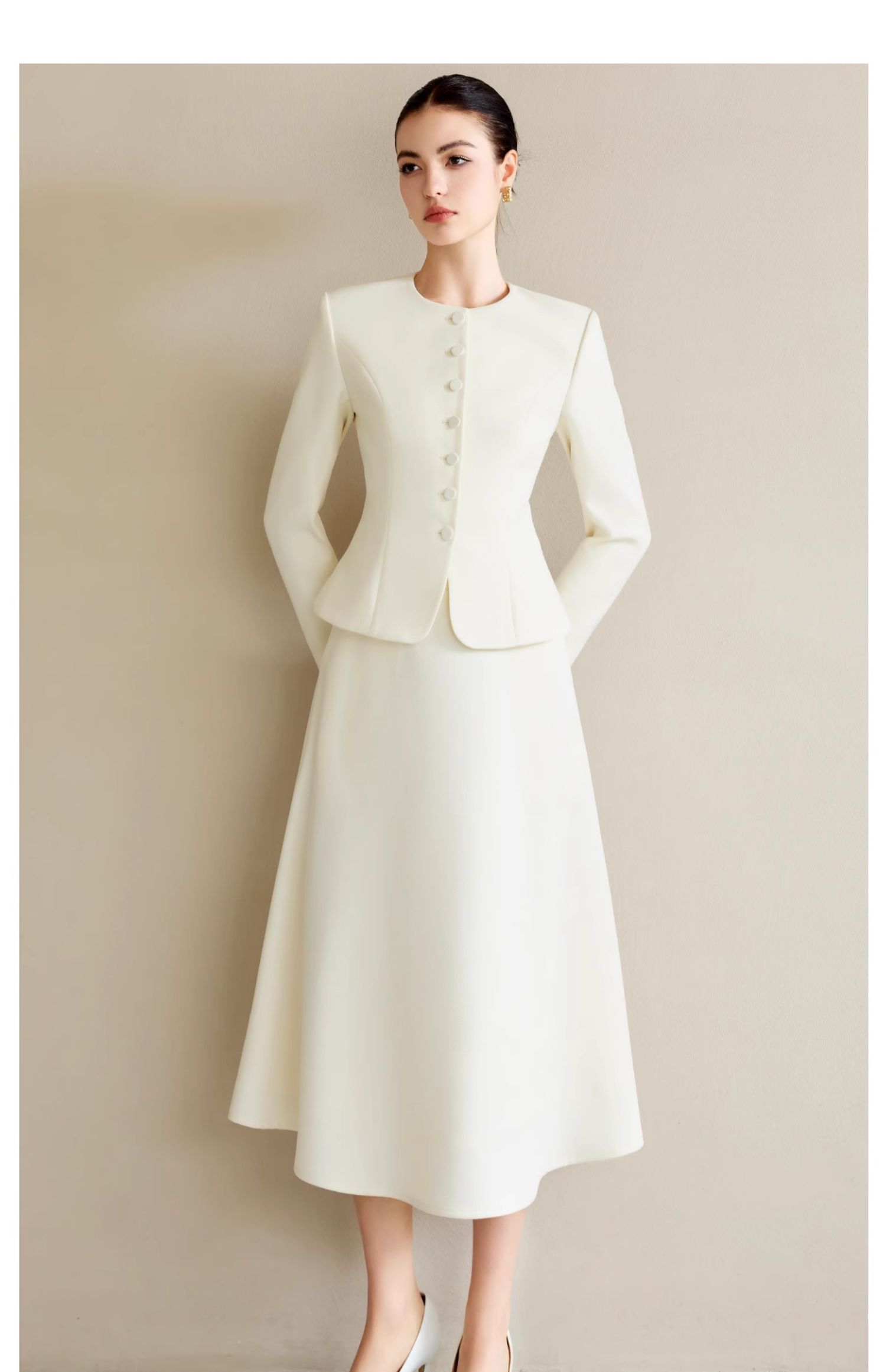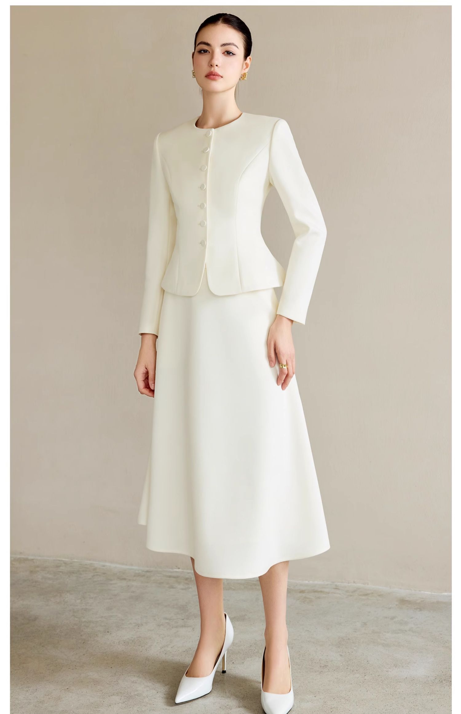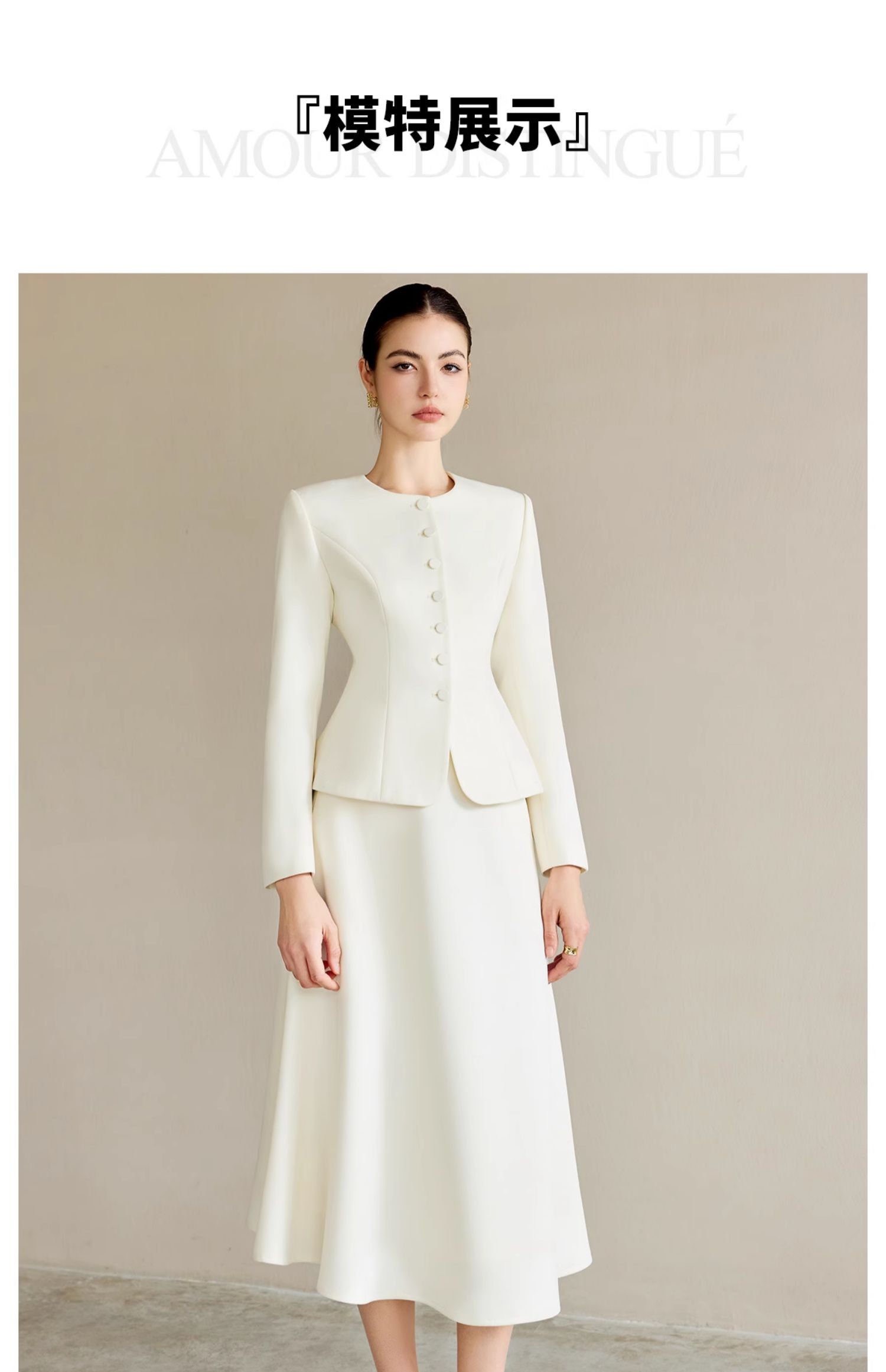 IWY/米白色职业装气质女神范套装女高端细闪银丝圆领西装正装伞裙两件套C2103-M+S2112