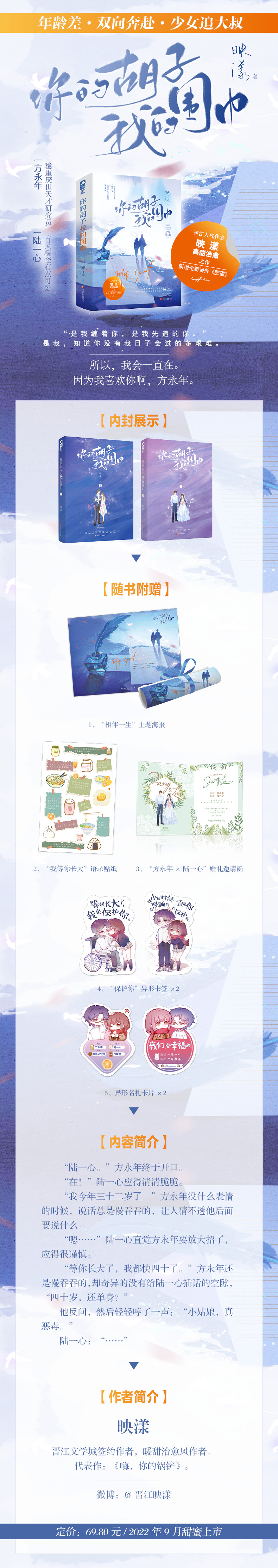 1、古灵精怪有点可爱•陆一心 × 稳重厌世天才研究员•方永年 的神仙爱情。女主是人见人爱、走到哪就把光彩散发到哪的小太阳,男主是被残疾拖入黑暗、却终究还是为爱重回光明的天才科研家,美好温暖的爱情故事。 2、少女追大叔的年龄差文,制药行业背景的文,稍微带一点悬疑元素,萝莉VS大叔。单纯又坚定的感情治愈人心。网络数据很好。 3、 晋江人气作者映漾,擅长描写治愈系的都市爱情故事,已签约出版小说《嗨,你的锅铲!》《下一座岛屿》《可是,我想你》《阿南与阿蛮》《妻不可攀》《她他》《盛夏》,其中《嗨,你的锅铲》签约繁体海外出版,作品影视版权五部。 4、 随书赠品丰富。 随书附赠—— 1、“相伴一生”主题海报 2、“我等你长大”语录贴纸 3、“方永年 × 陆一心”婚礼邀请函 4、“保护你”异形书签×2 5、异形名札卡片×2