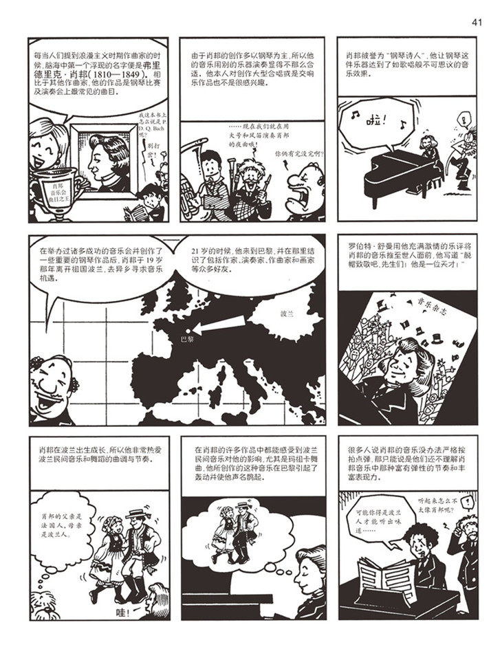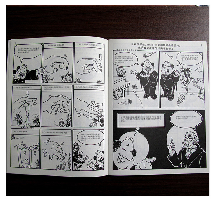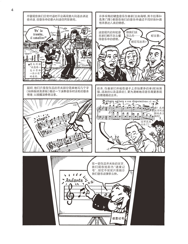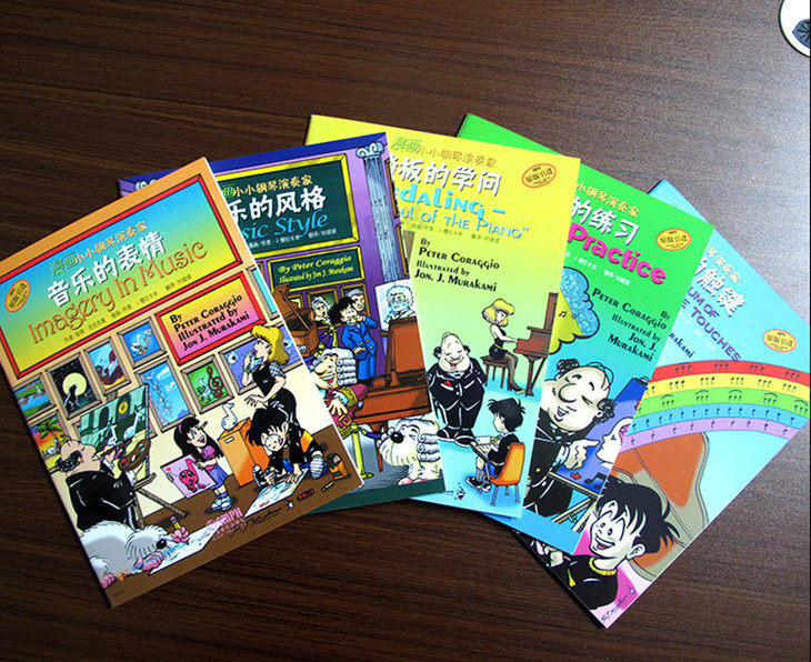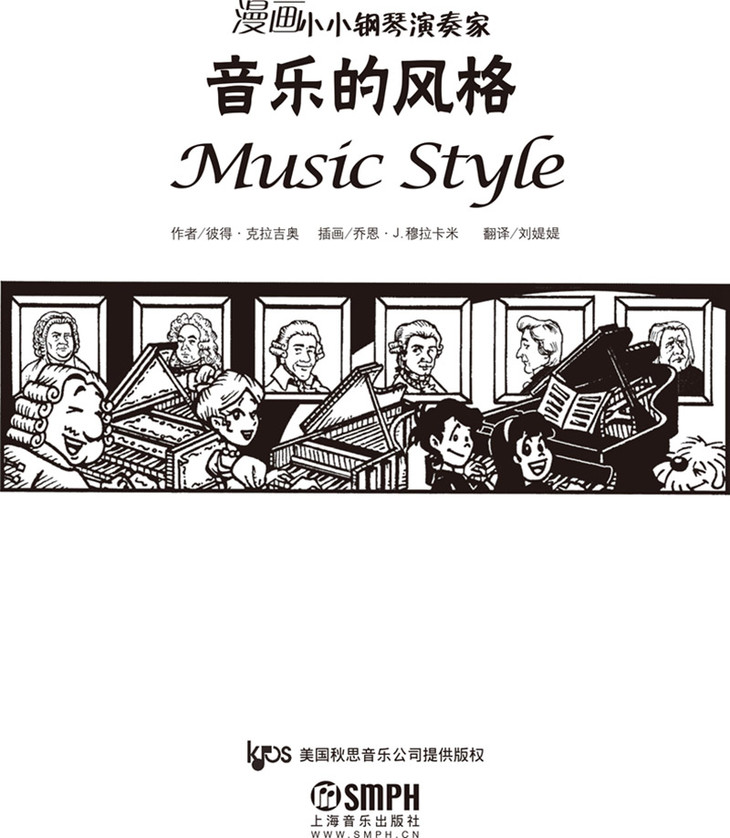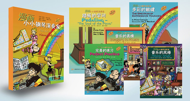 “漫画小小钢琴演奏家”是上海音乐出版社引进自美国秋思音乐公司的一套音乐漫画,共分为5册,分别是《音乐的风格》《音乐的表情》《踏板的学问》《完美的练习》和《多彩的触键》,它们实际上从音乐史、音乐记号、踏板使用、练习方法和表演实践5个方面对钢琴学习者进行了全方位的指导。如今,很多钢琴教师、琴童及家长都知道国内幼儿钢琴教材的三大国际品牌:“巴斯蒂安”系列教材、“汤普森”系列教材和“快乐钢琴”系列教材,但大家对这些教材的出版社──特别是原出版社了解并不多。实际上,近年来在国内钢琴教育界极具影响力的“巴斯蒂安”系列正是由秋思音乐公司出版的。这家出版社在幼儿钢琴教育和音乐早教方面拥有一支国际上顶尖的教师、作者团队,他们在平日的教学中,非常擅于用最能让孩子们接受并喜爱的方式来引导孩子学习钢琴和音乐,而当前这套漫画更是将最权威的钢琴音乐知识和最无厘头的美式幽默相结合,使孩子能在快乐中获得对他们学习钢琴十分有益的知识。