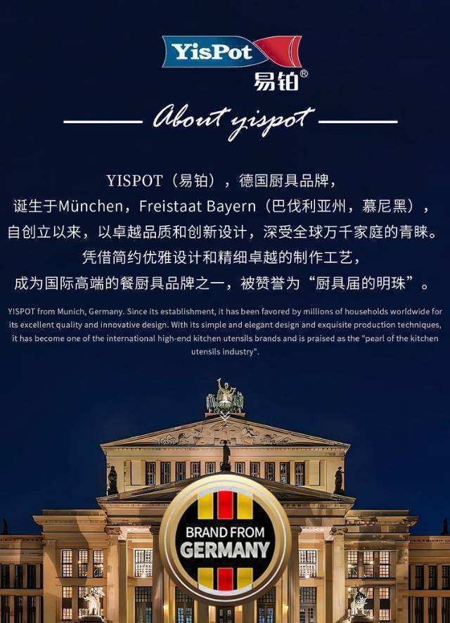 YISPOT(易铂),德国厨具品牌,诞生于München,FreistaatBayern(巴伐利亚州,慕尼黑),自创立以来,以卓越品质和创新设计,深受全球万千家庭的青睐。 凭借简约优雅设计和精细卓越的制作工艺,成为国际高端的餐厨具品牌之一,被赞誉为“厨具届的明珠”。