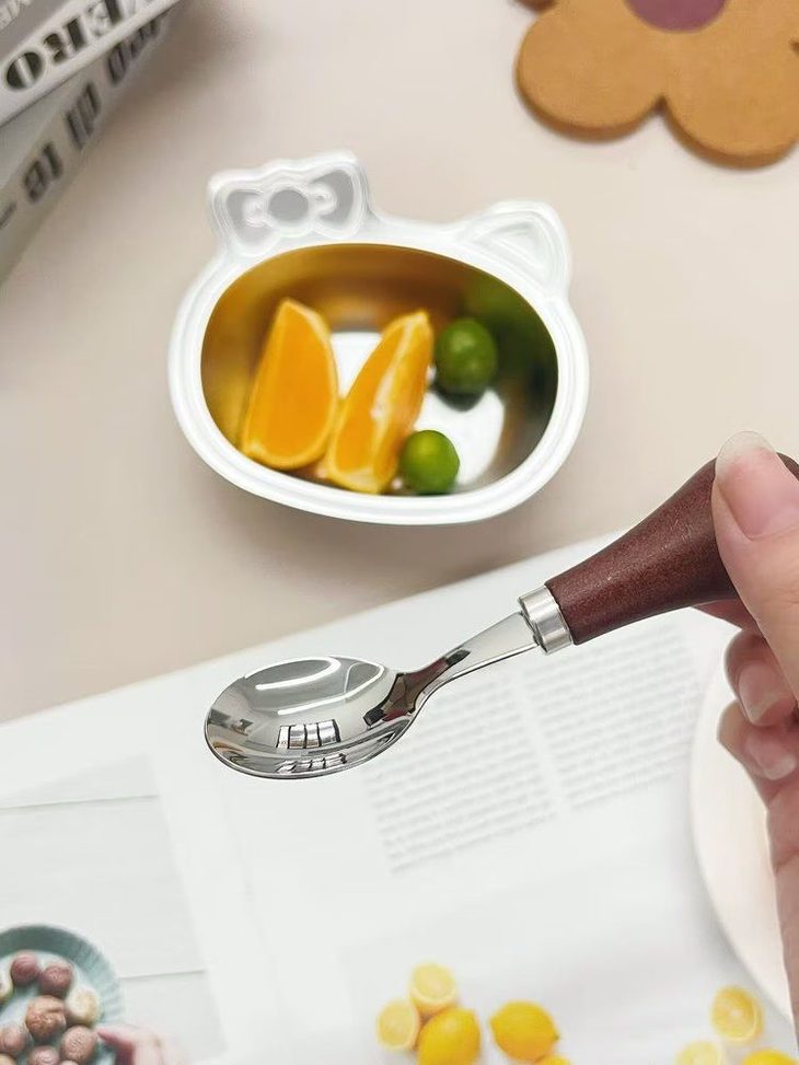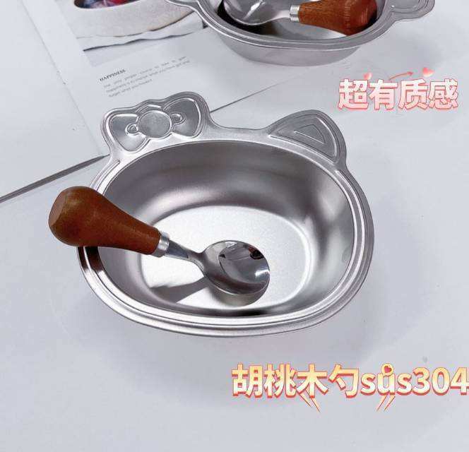 易铂YISPOT 304不锈钢Kitty猫小食碗+胡桃木勺套装