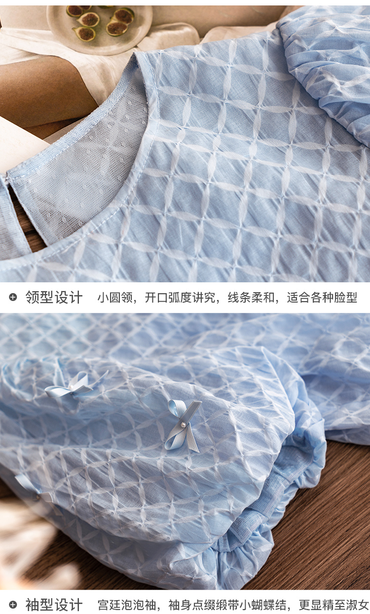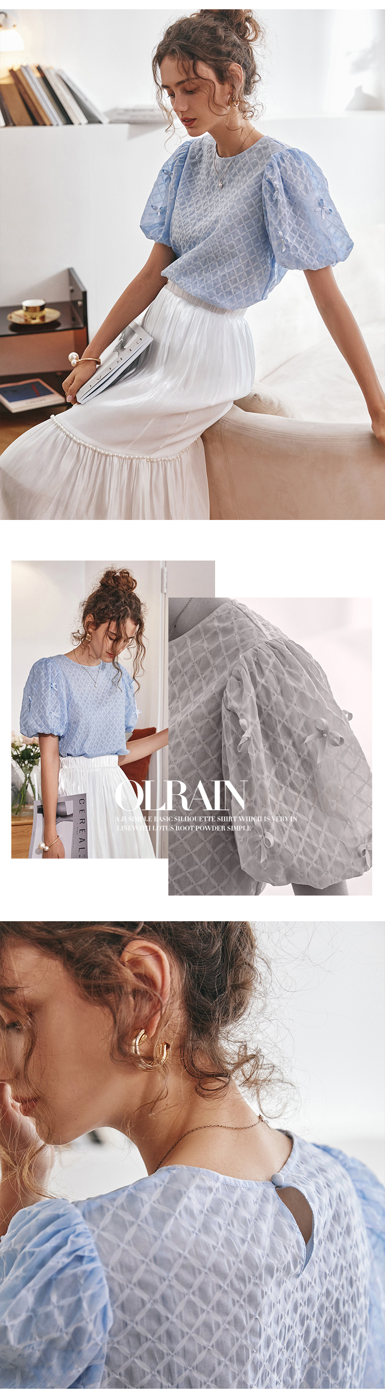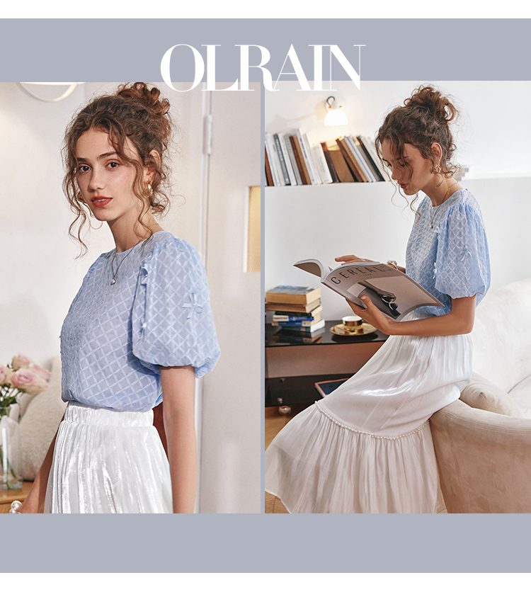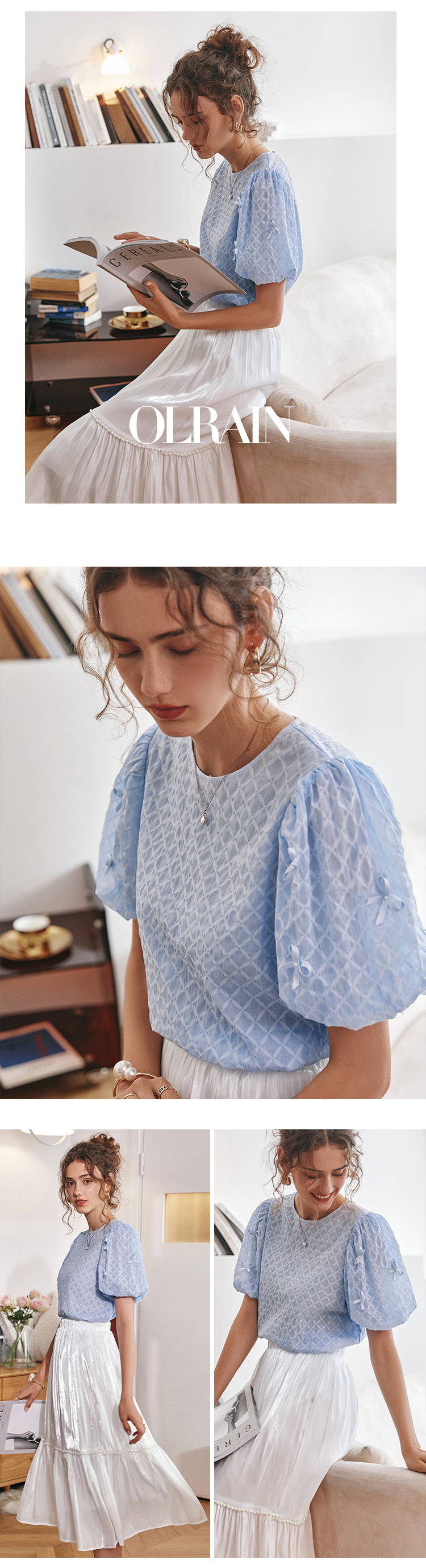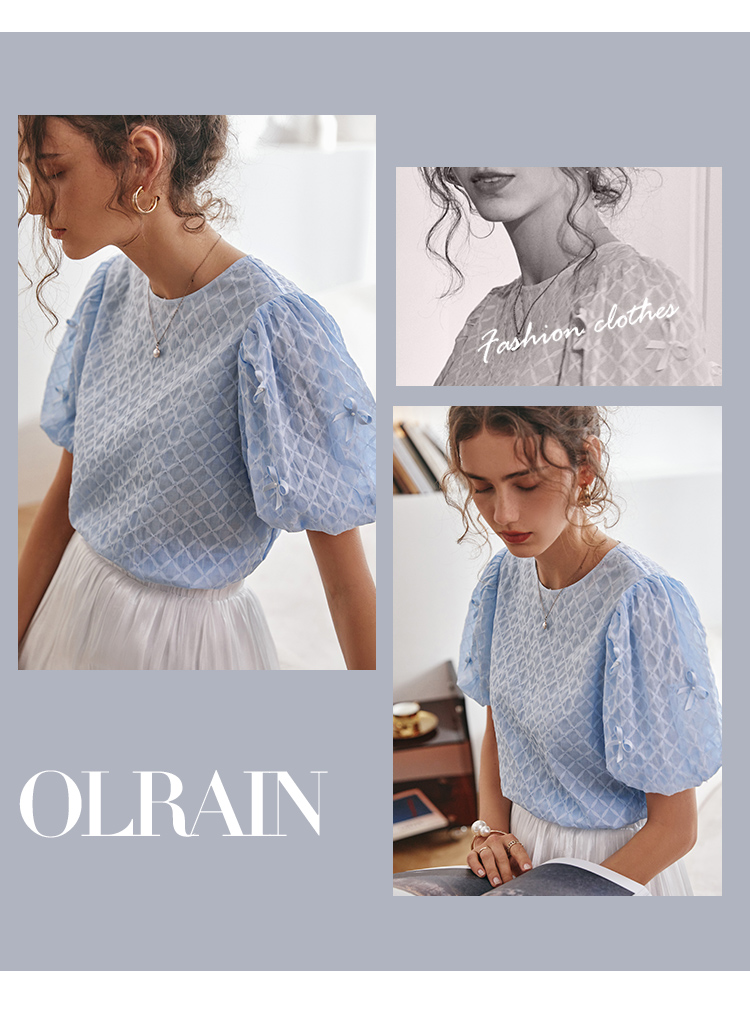 欧芮儿蓝色衬衫女2021新款圆领泡泡袖宫廷风法式洋气短袖上衣