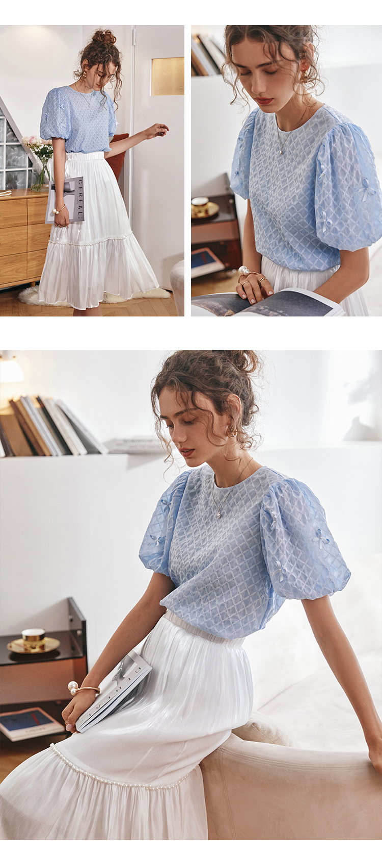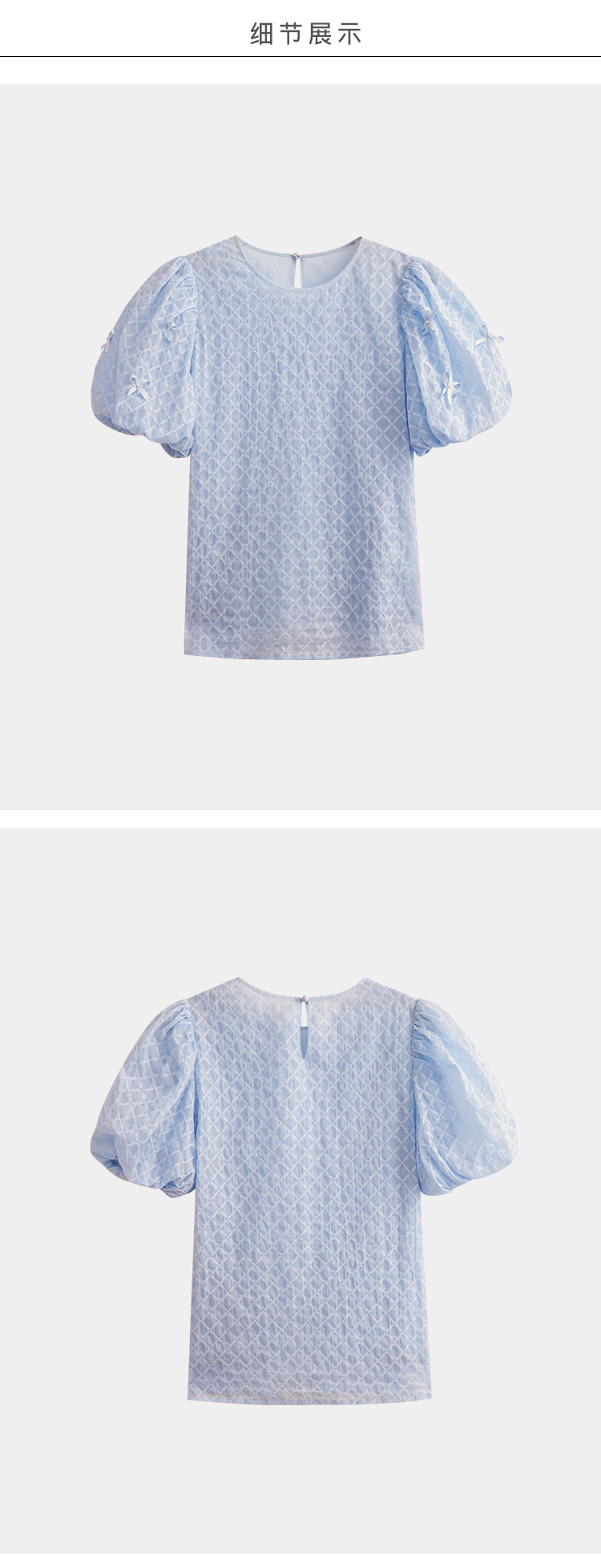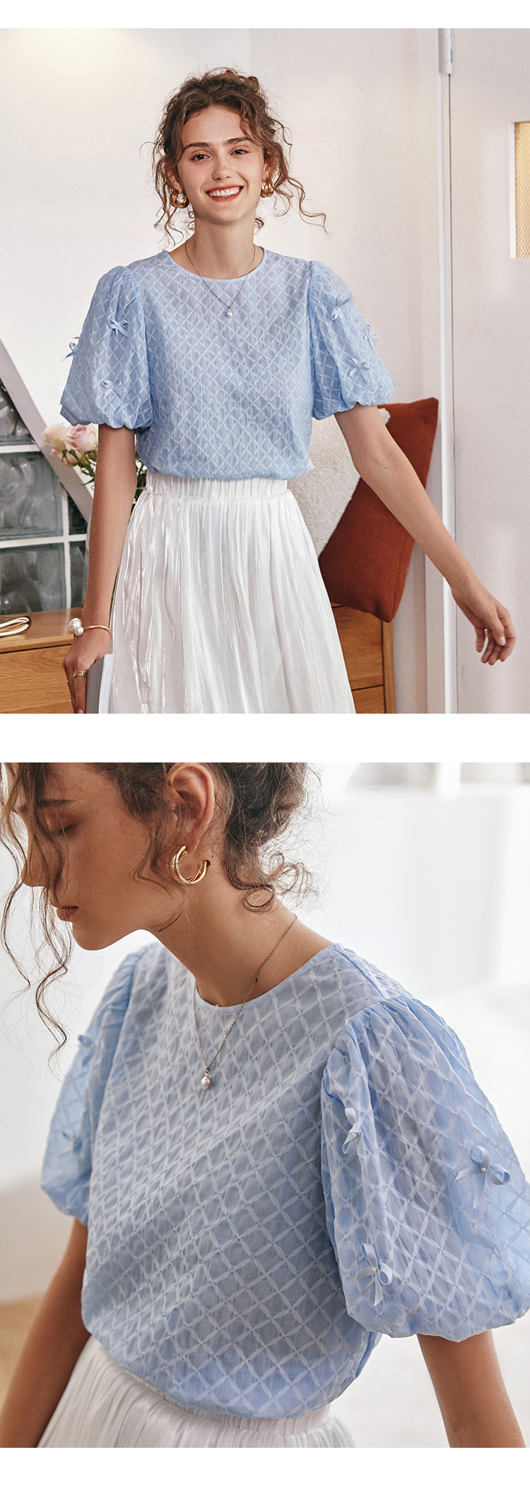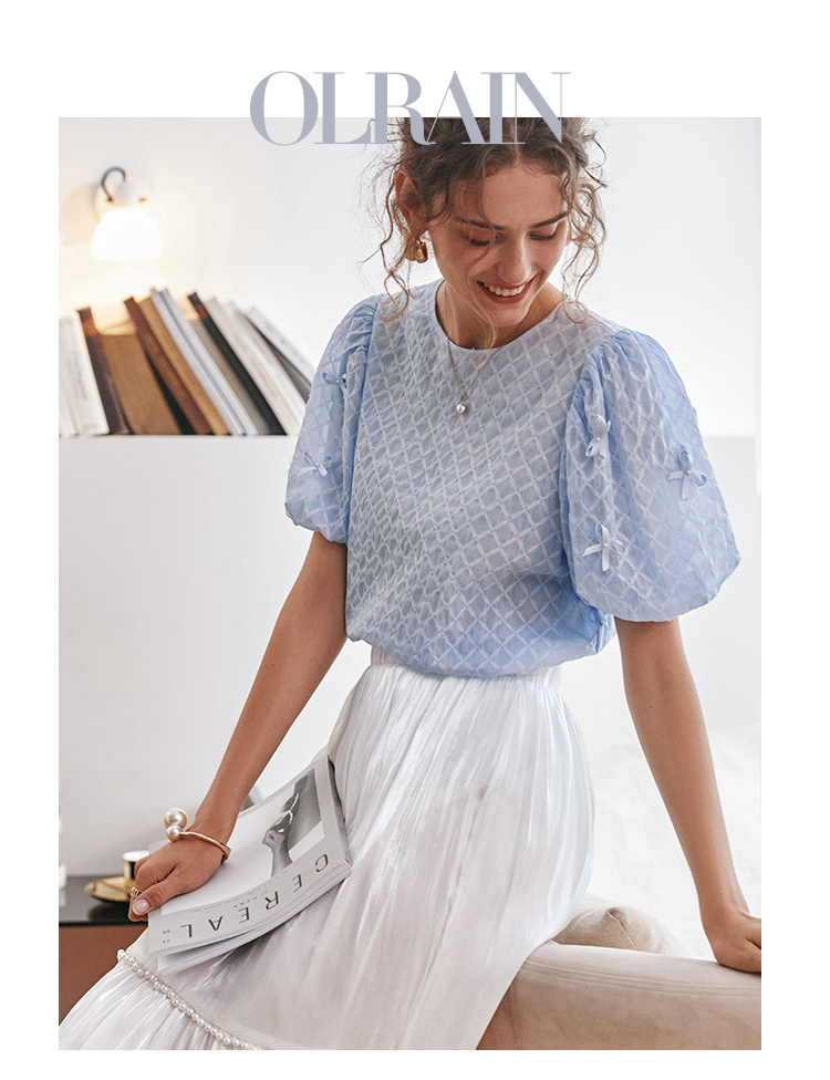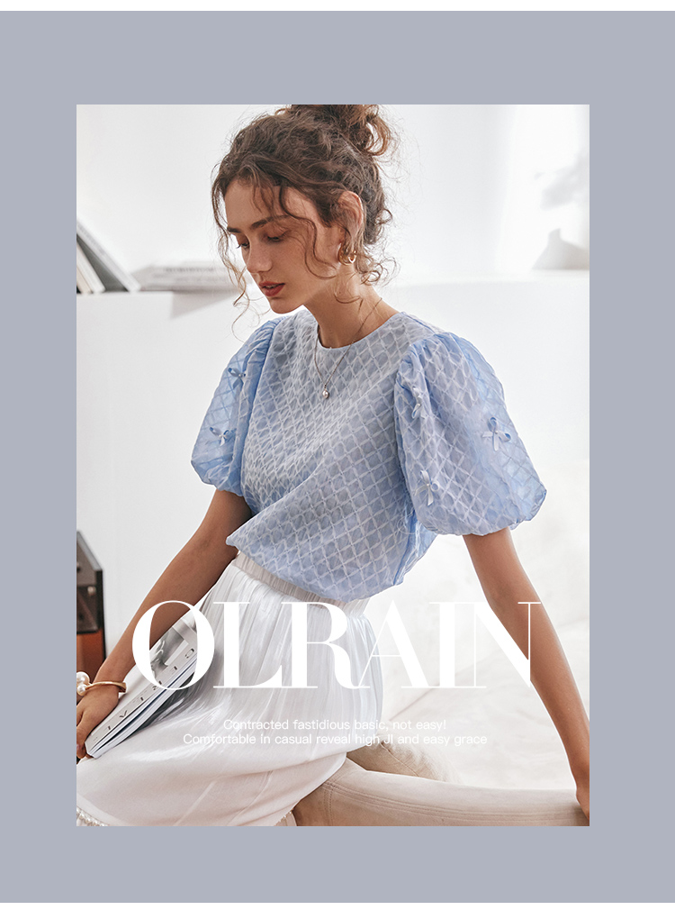 欧芮儿蓝色衬衫女2021新款圆领泡泡袖宫廷风法式洋气短袖上衣