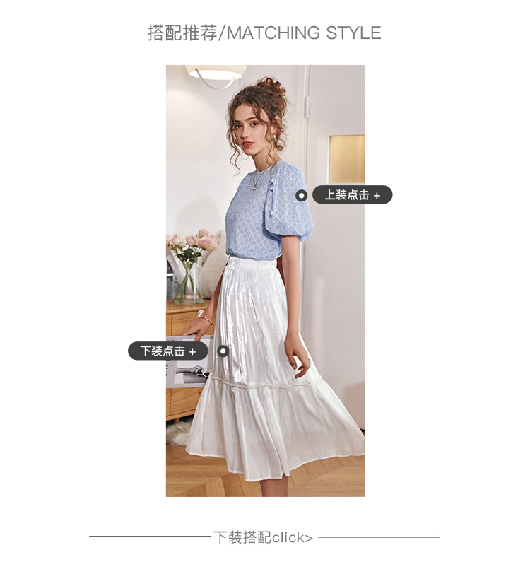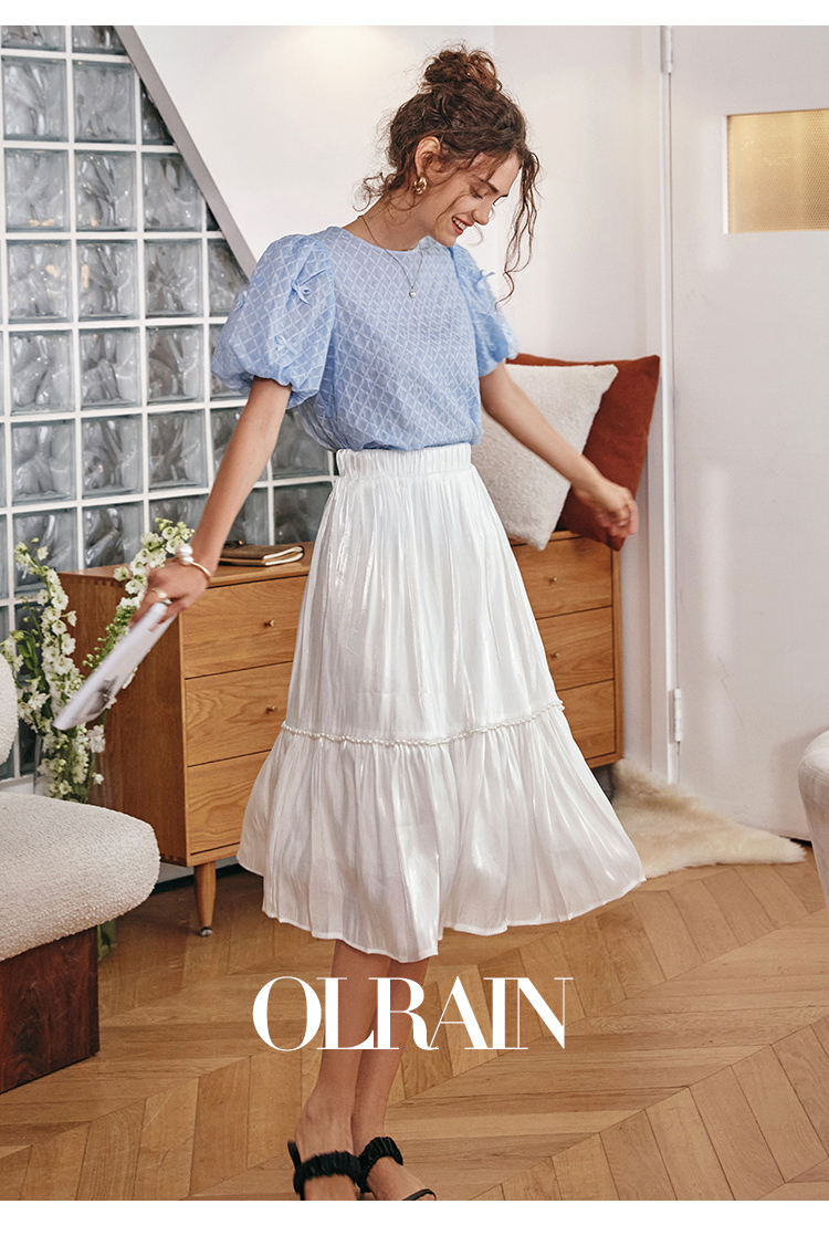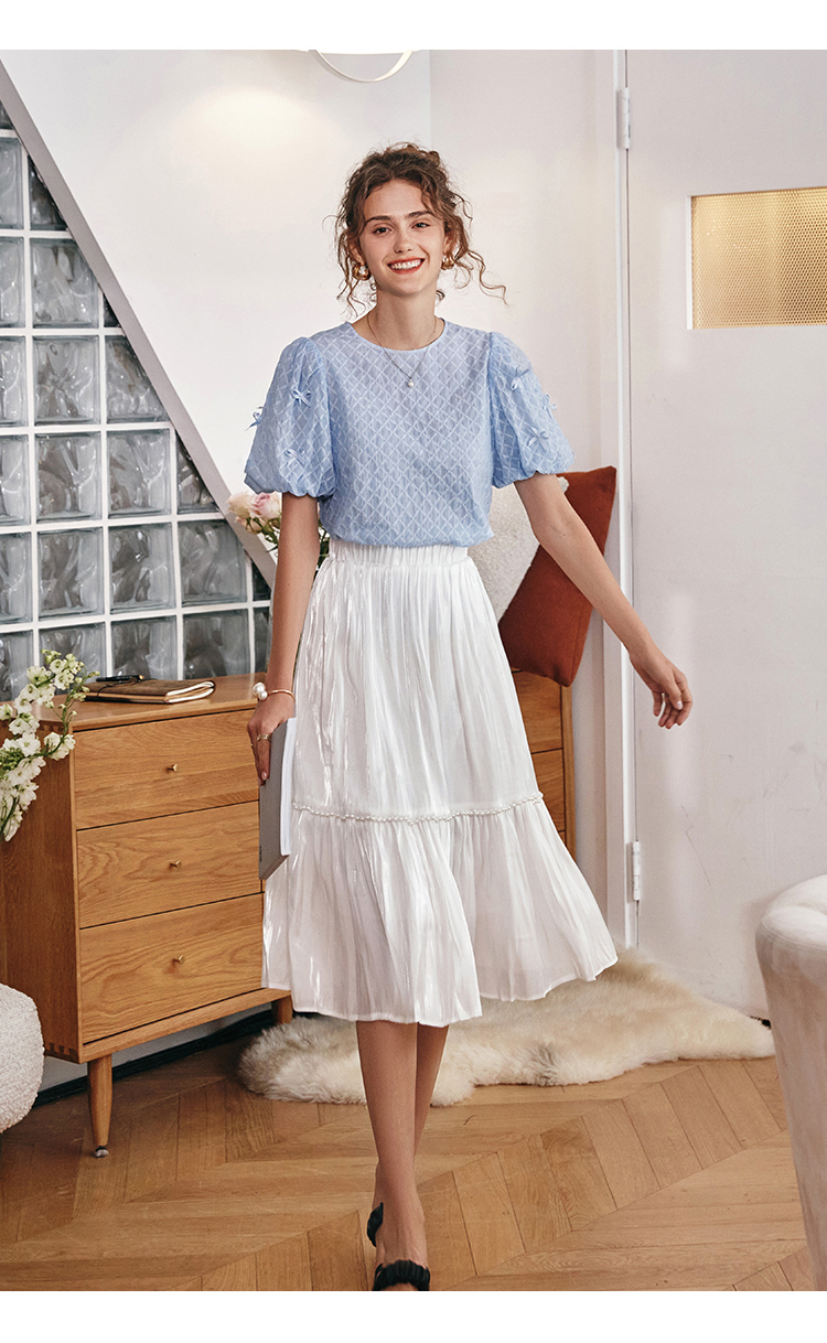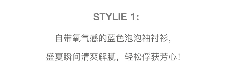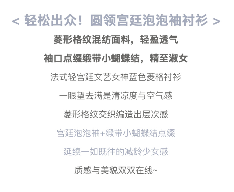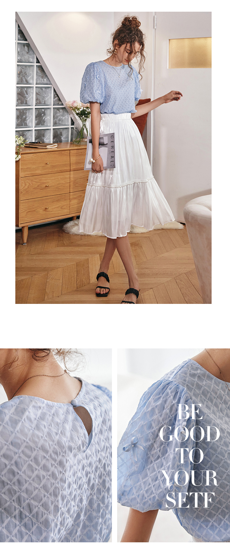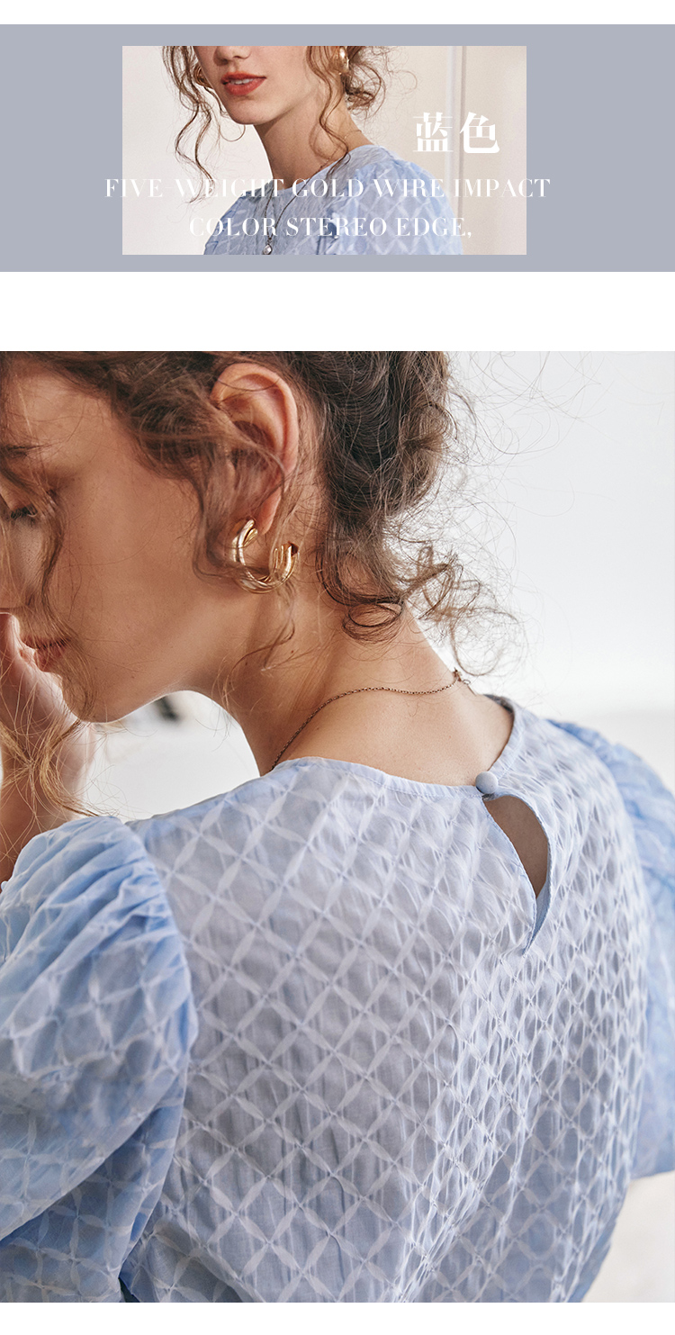 欧芮儿蓝色衬衫女2021新款圆领泡泡袖宫廷风法式洋气短袖上衣