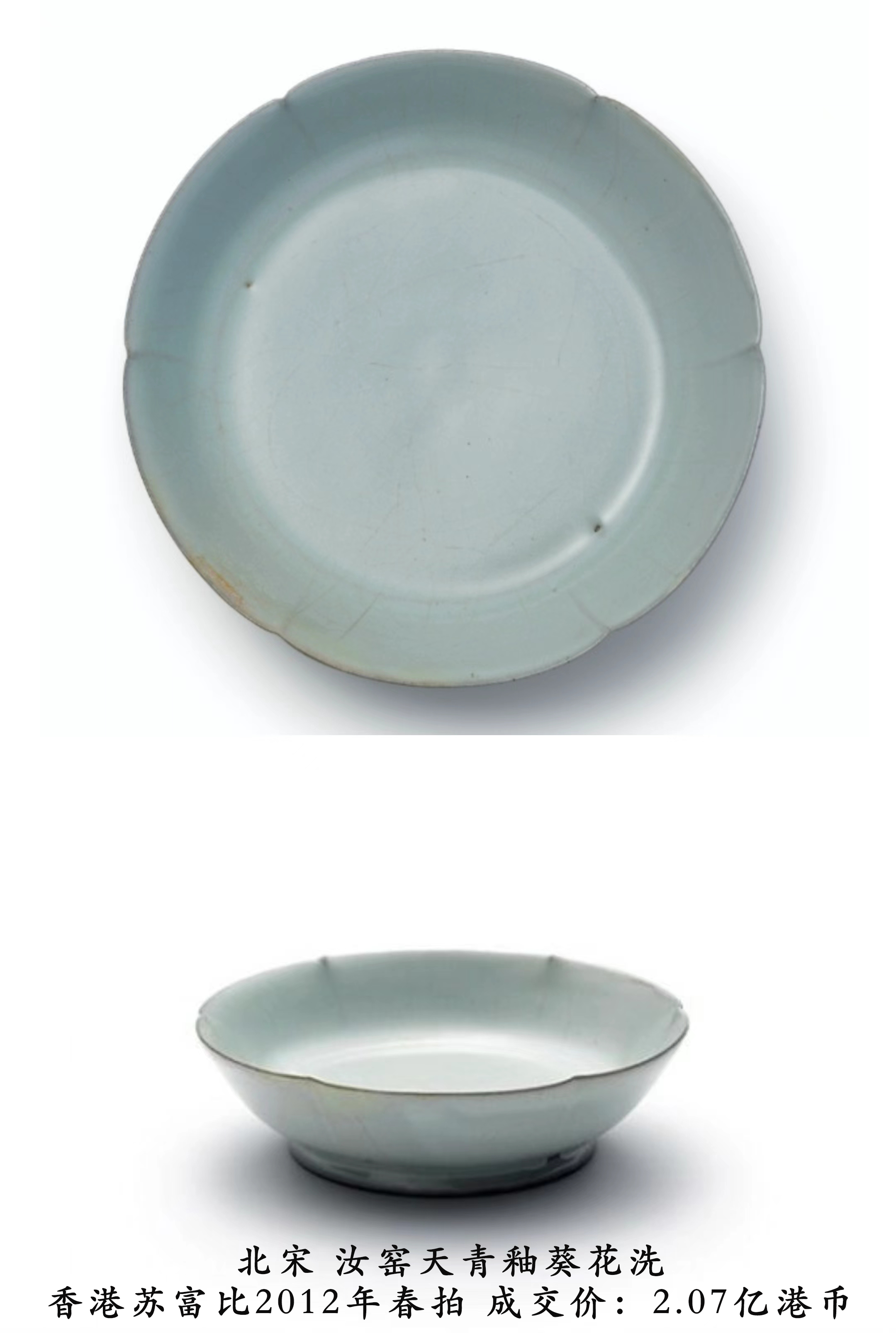 如今存世的汝窑洗的完整器,绝大部分是圆形的,花口形的完整器极为罕见。最出名的两件,一件存于大英博物馆,另一件则于2012年在香港苏富比拍卖会上以超过2亿港元的高价成交。