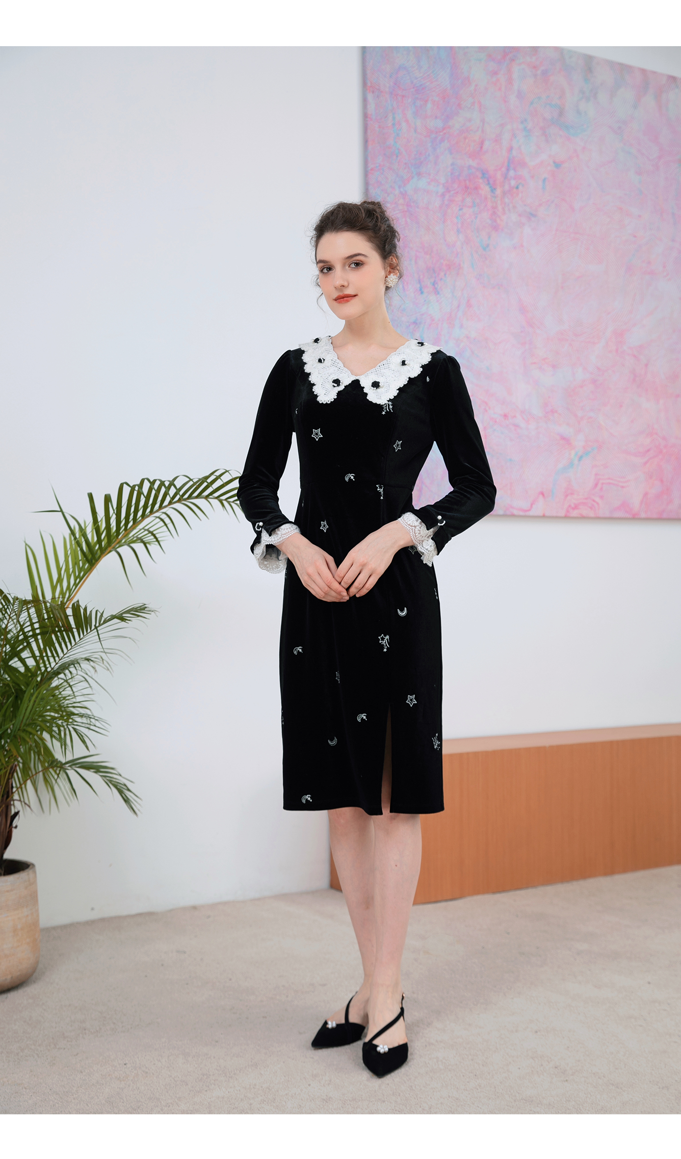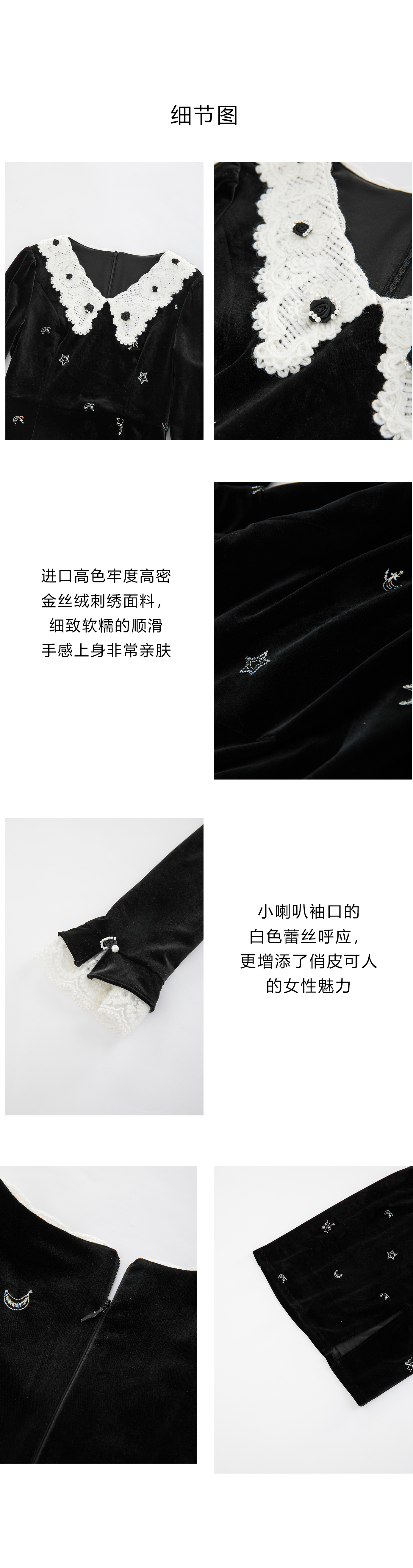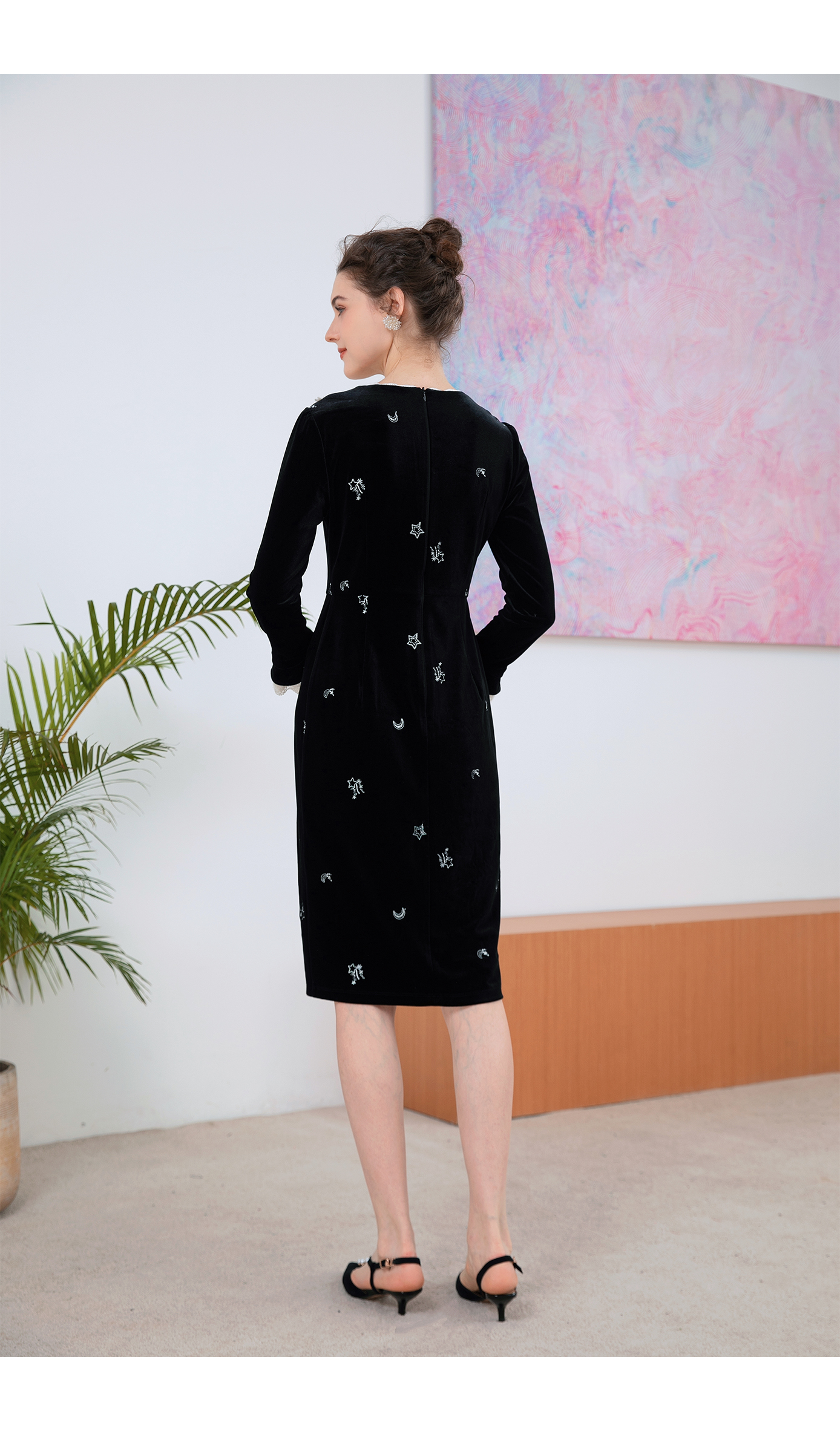 司歌金丝绒刺绣连衣裙长袖弹力收腰秋冬A901008X