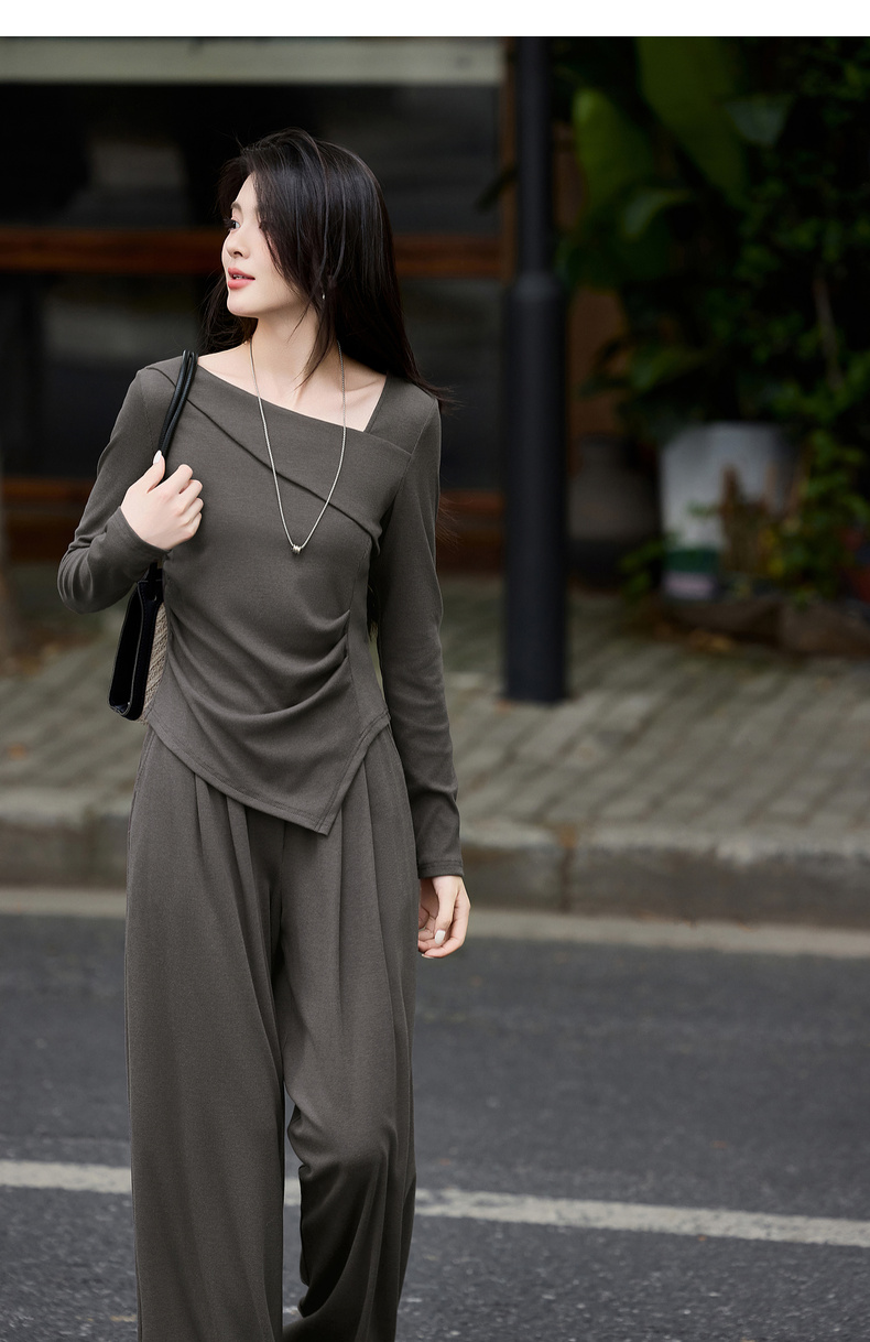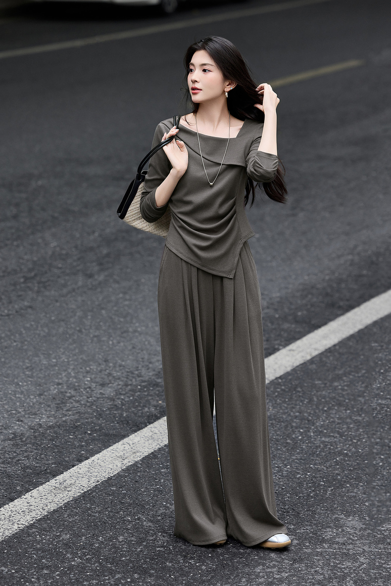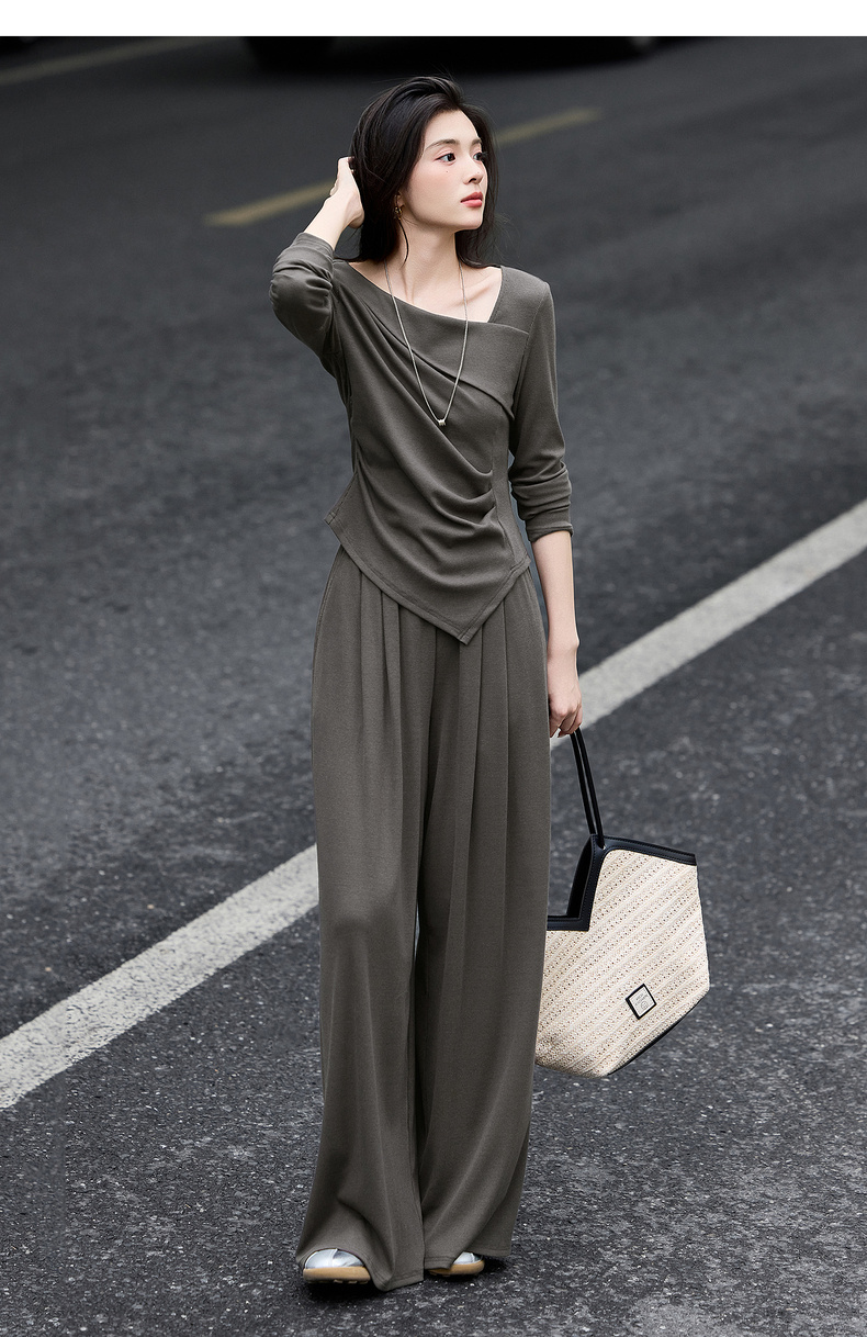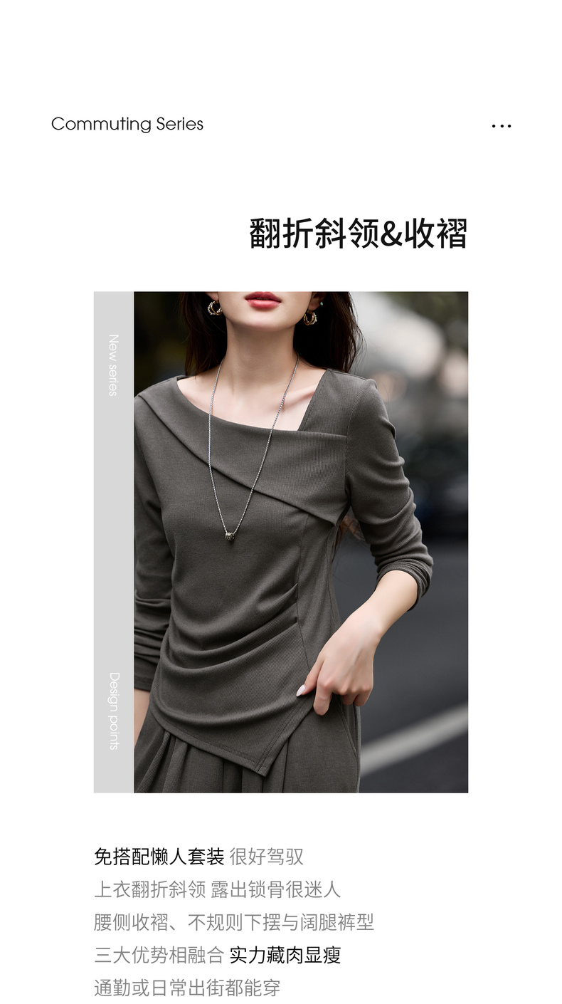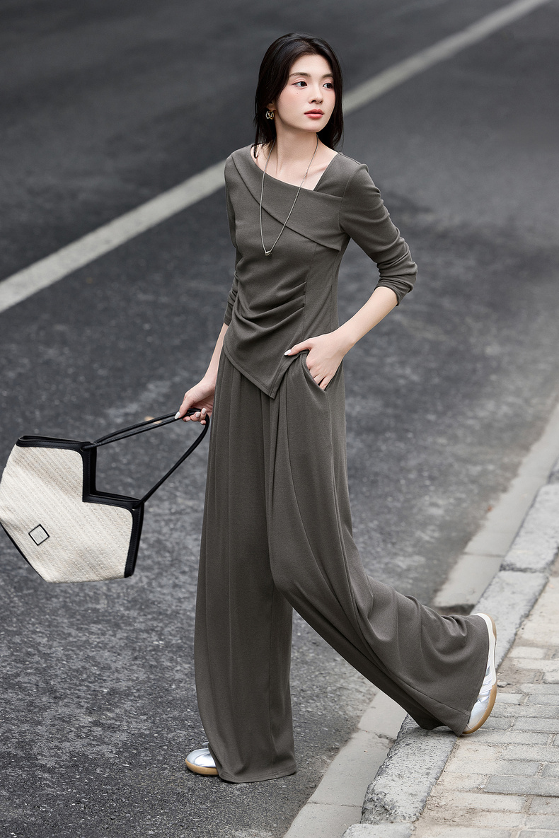 【内购】通勤斜领腰侧收褶不规则下摆修身上衣&松紧腰宽松阔腿长裤-153ZF2307