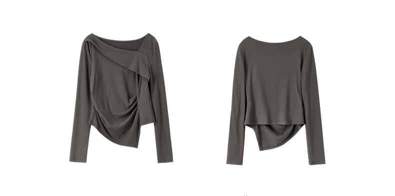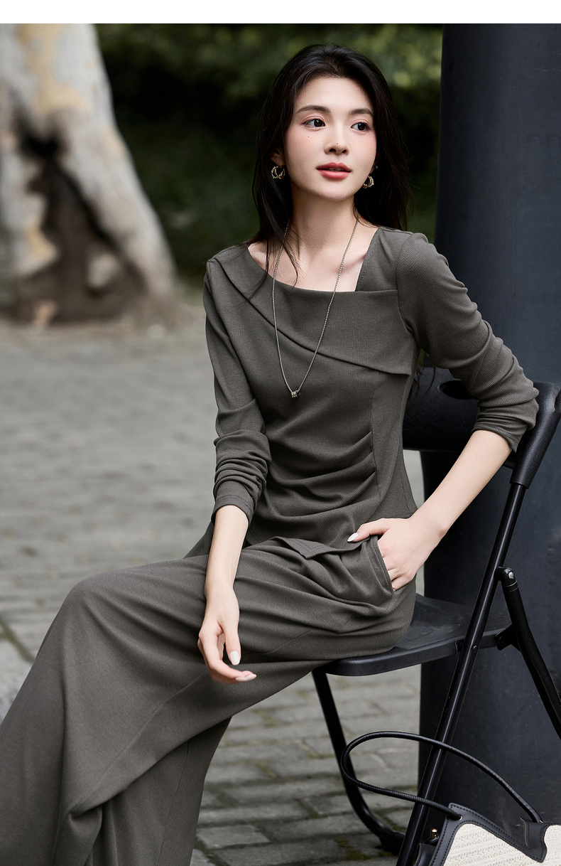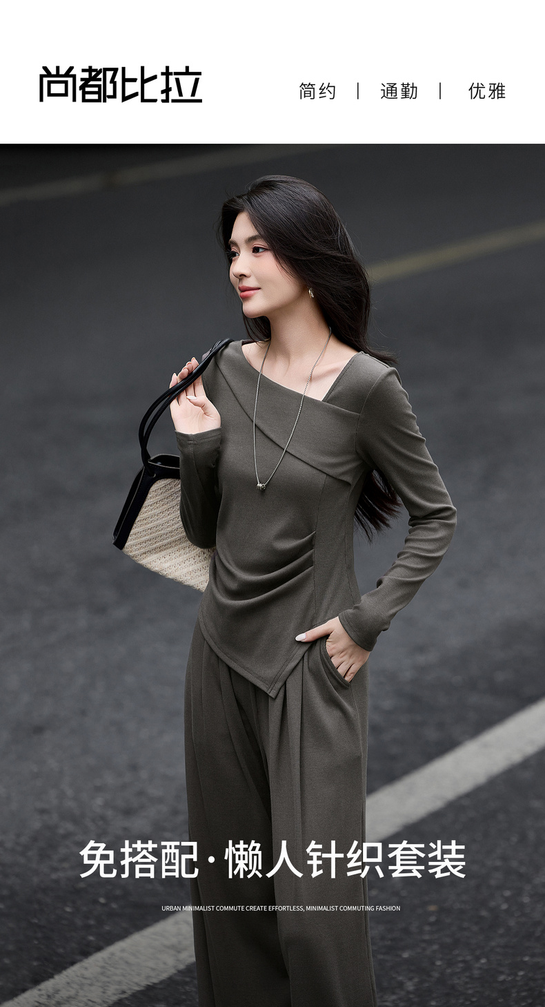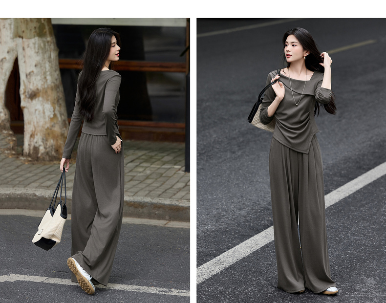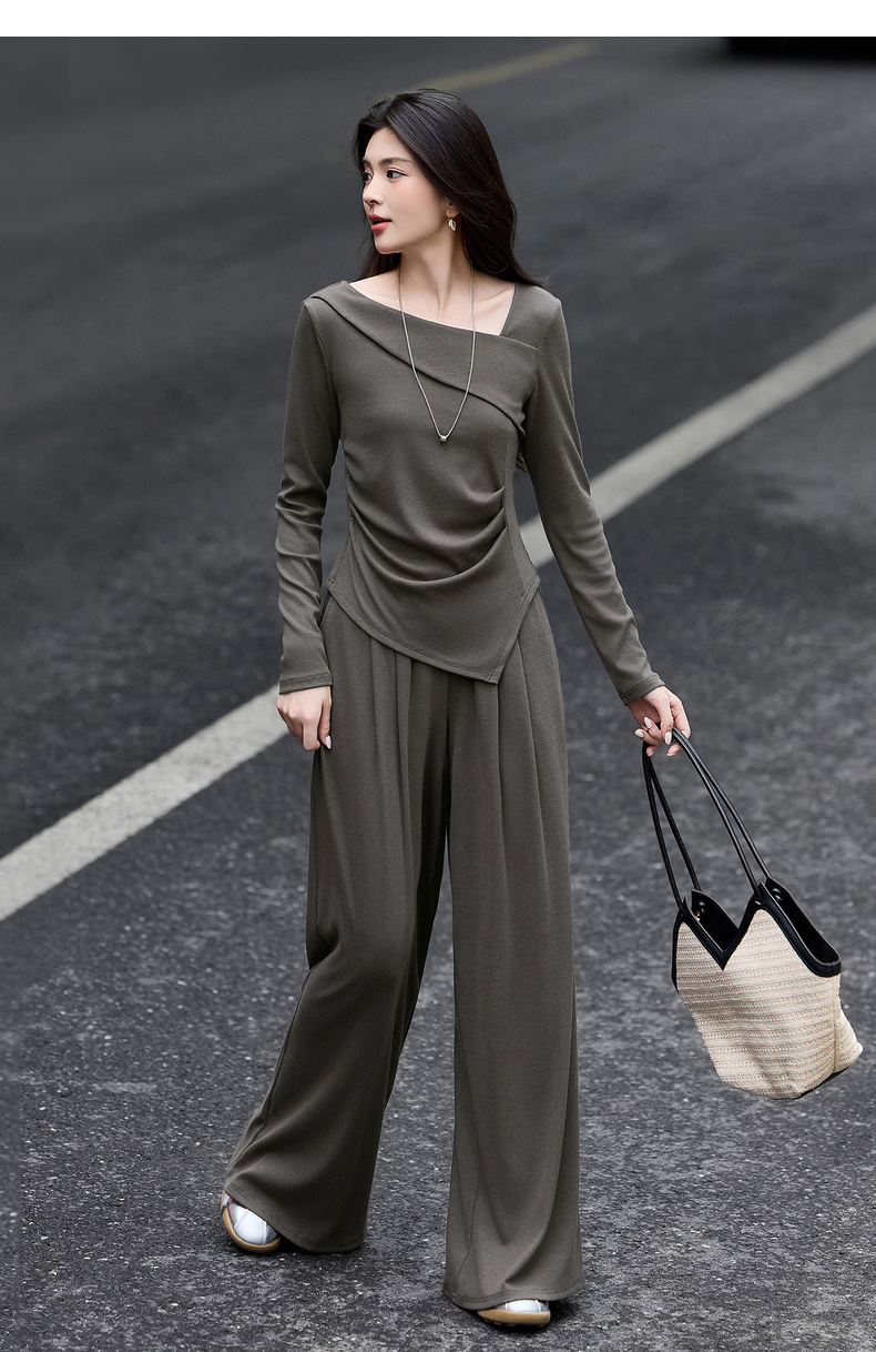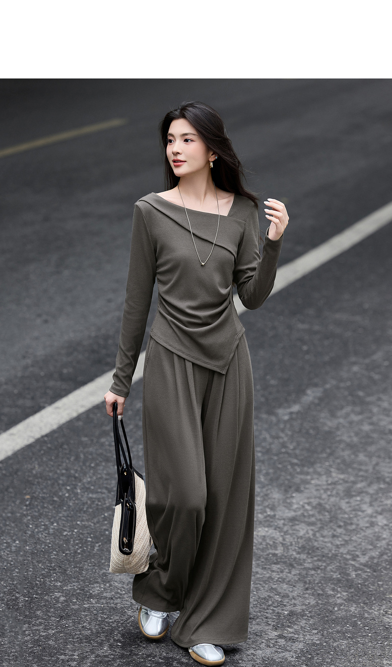 【内购】通勤斜领腰侧收褶不规则下摆修身上衣&松紧腰宽松阔腿长裤-153ZF2307
