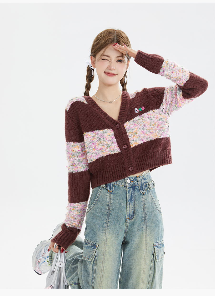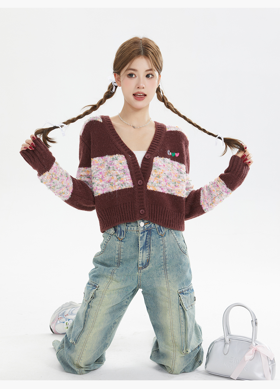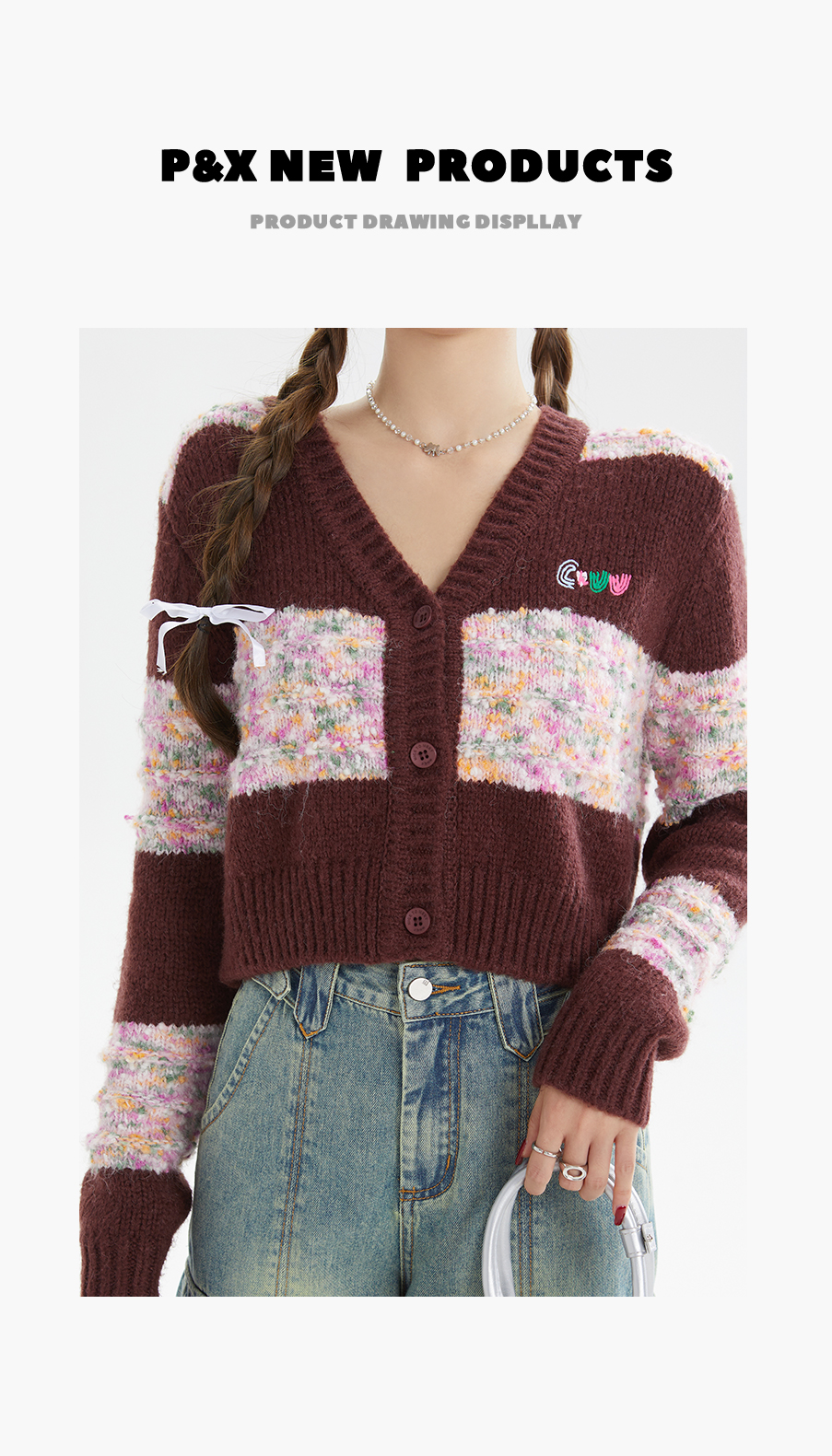 P&X设计师女装秋季宽松拼色毛织短款外套 824313290 酒红