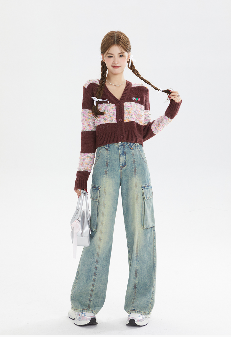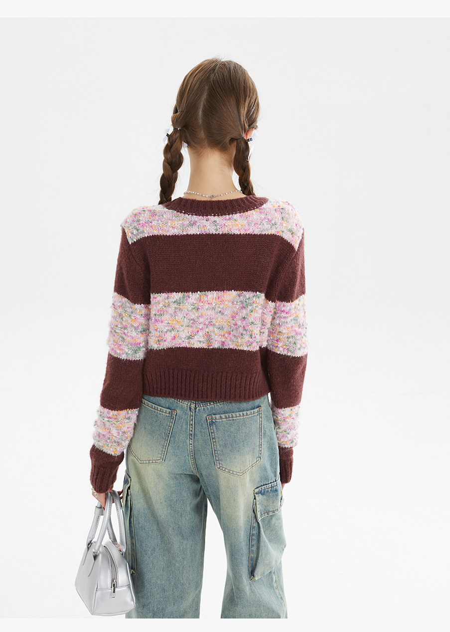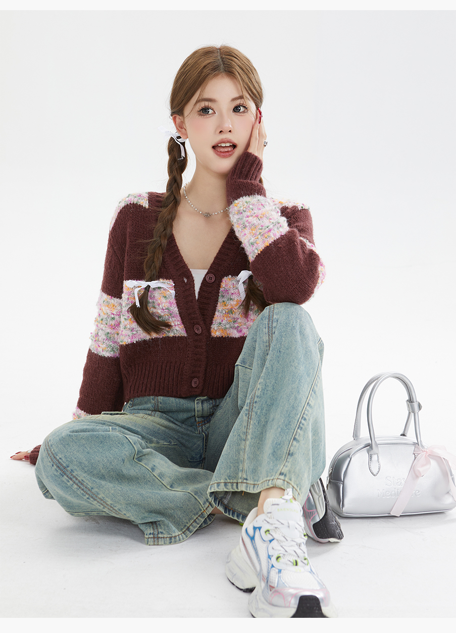 P&X设计师女装秋季宽松拼色毛织短款外套 824313290 酒红