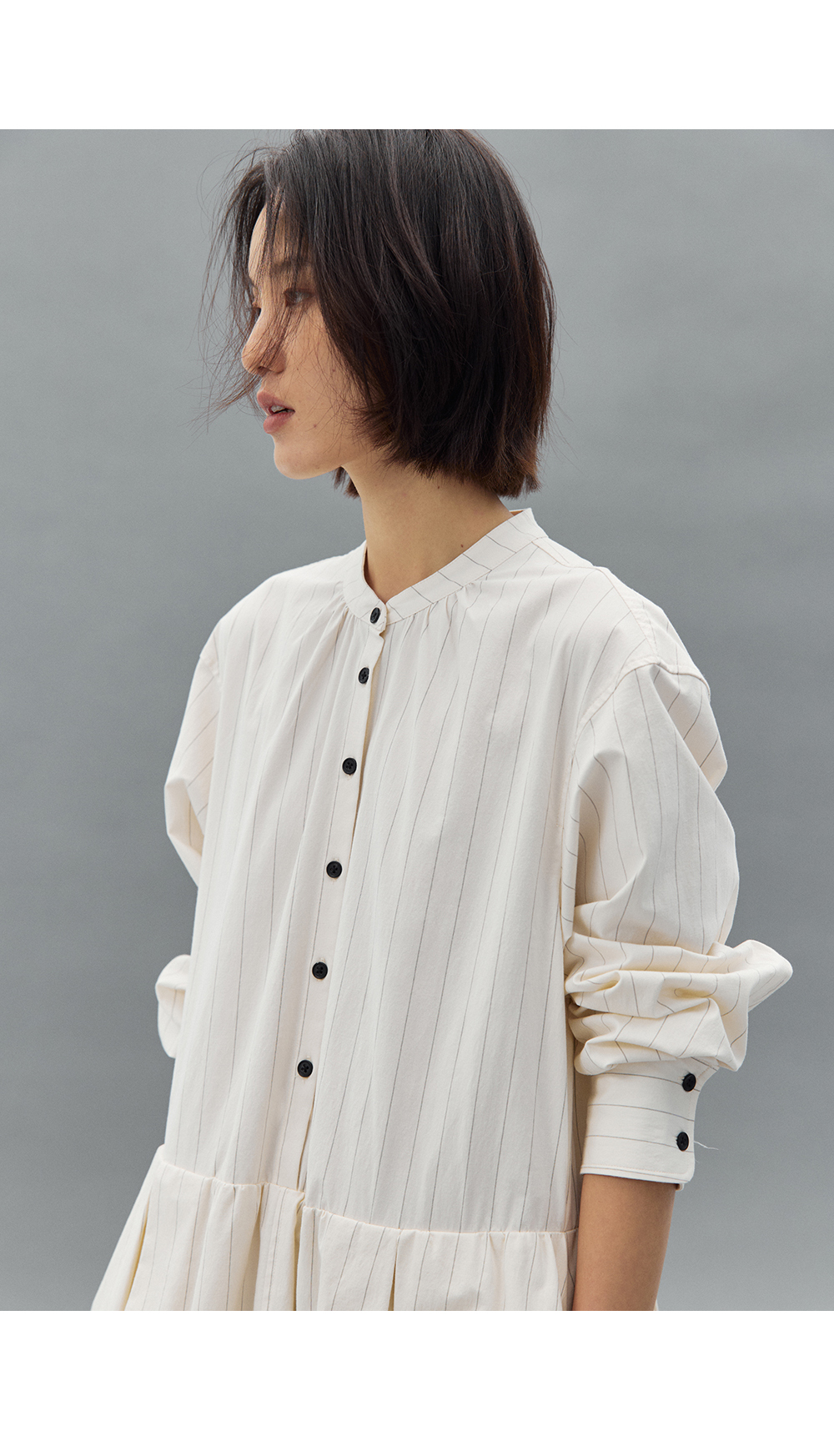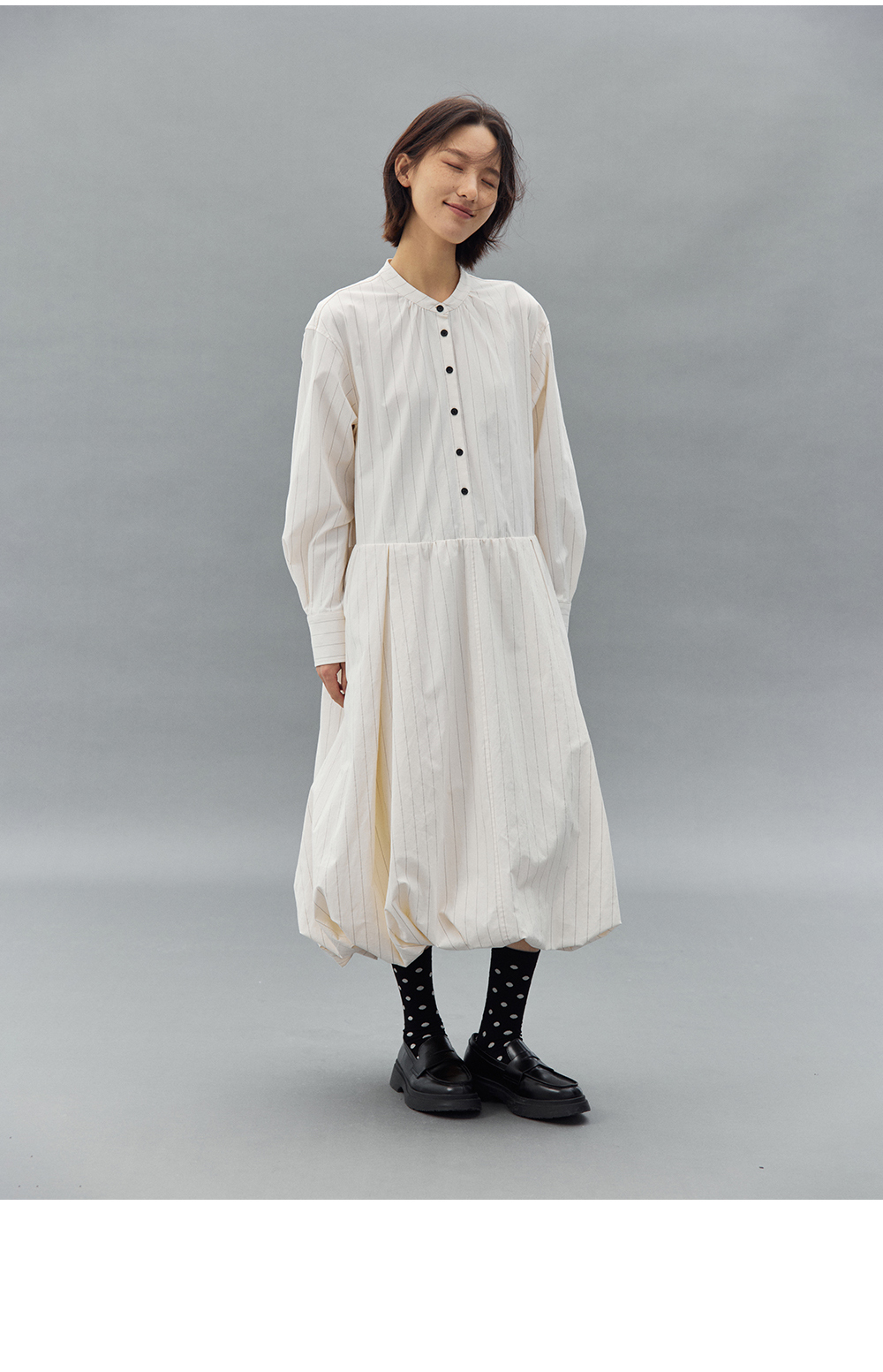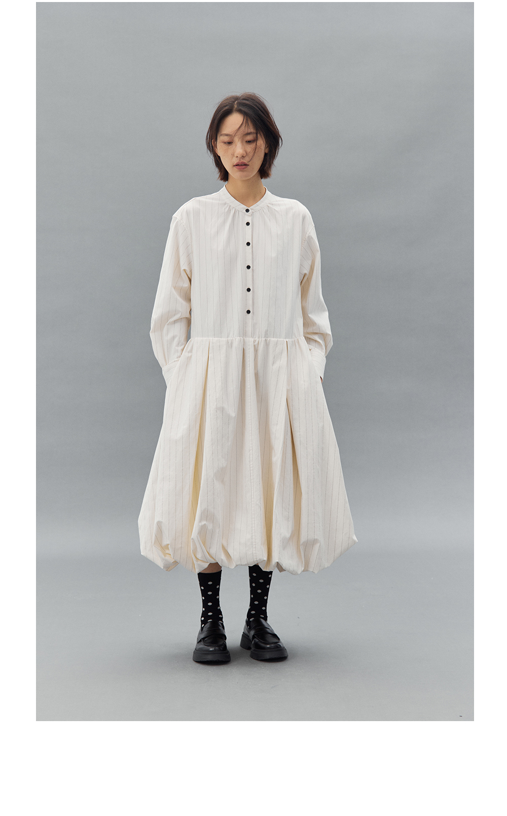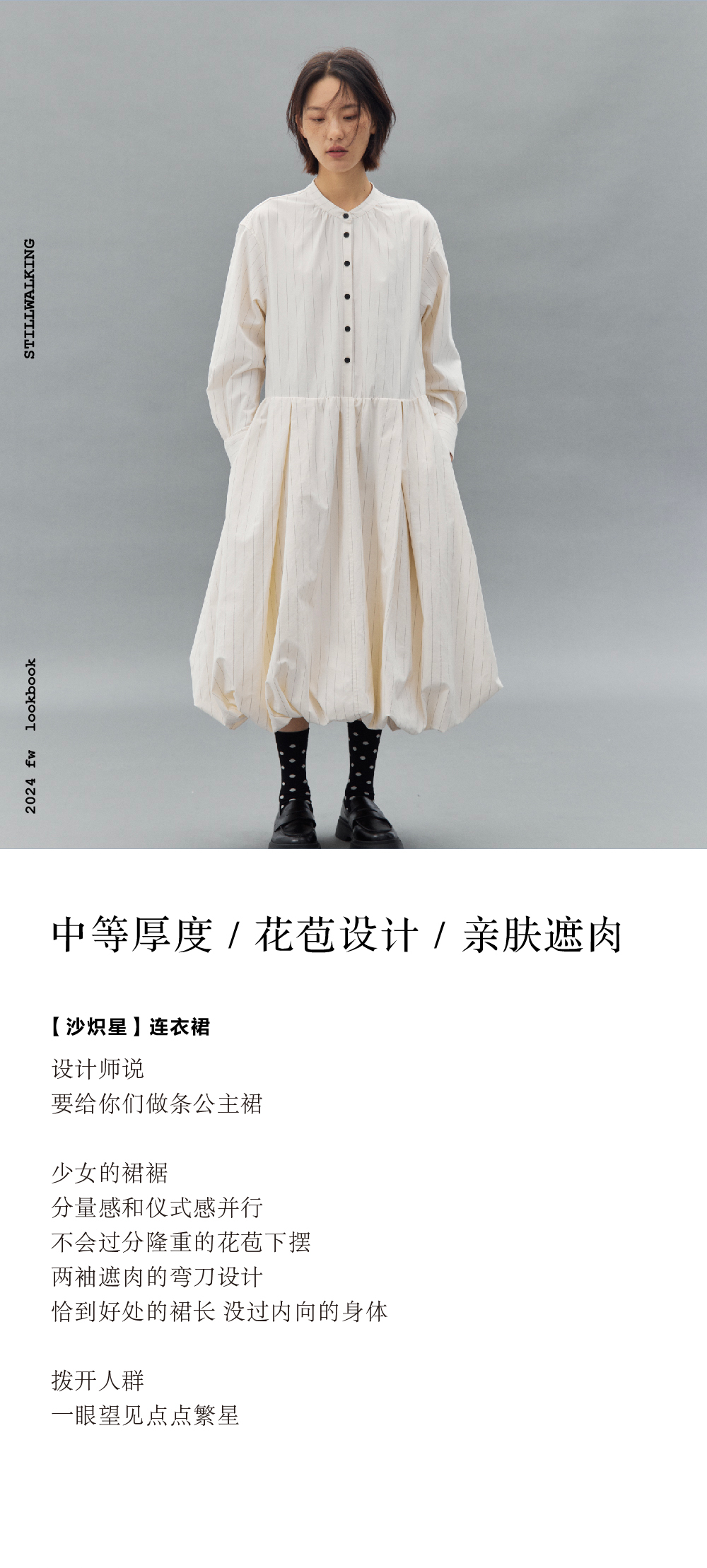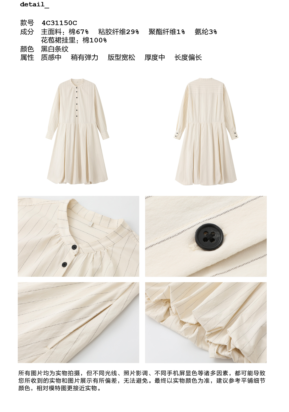 步履不停/4C31150C/花苞灯笼蛋糕裙小立领黑白条纹中长款连衣裙
