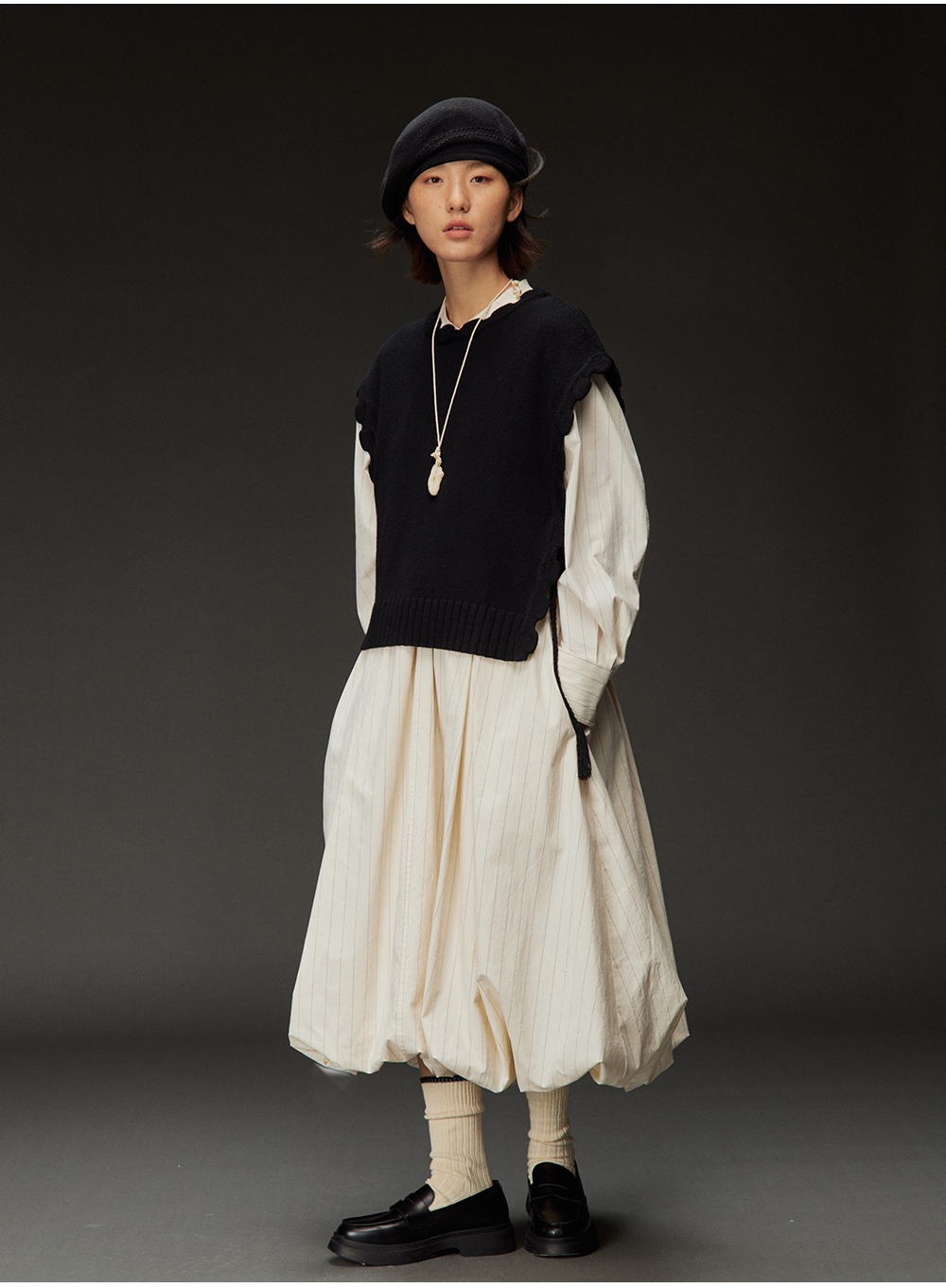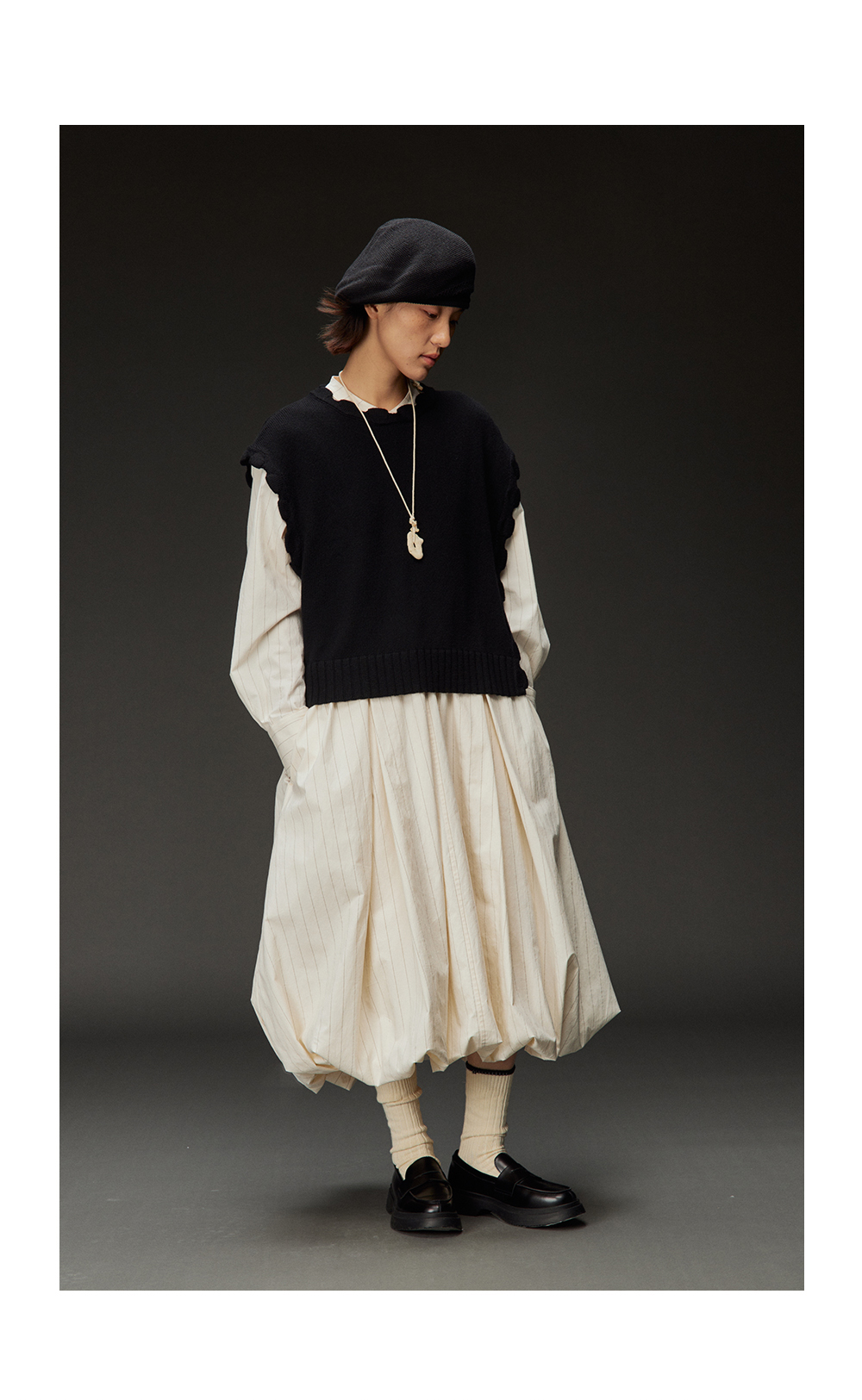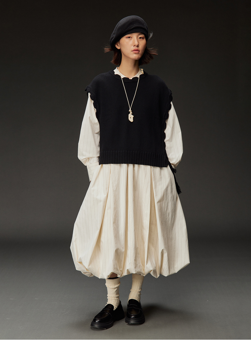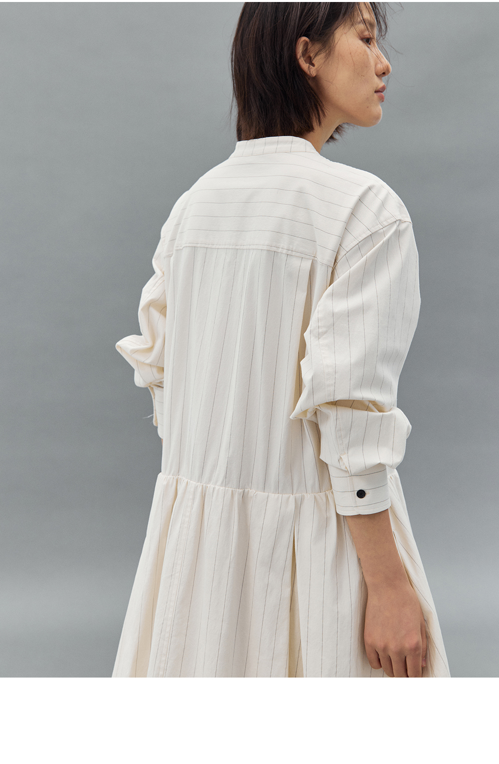 步履不停/4C31150C/花苞灯笼蛋糕裙小立领黑白条纹中长款连衣裙