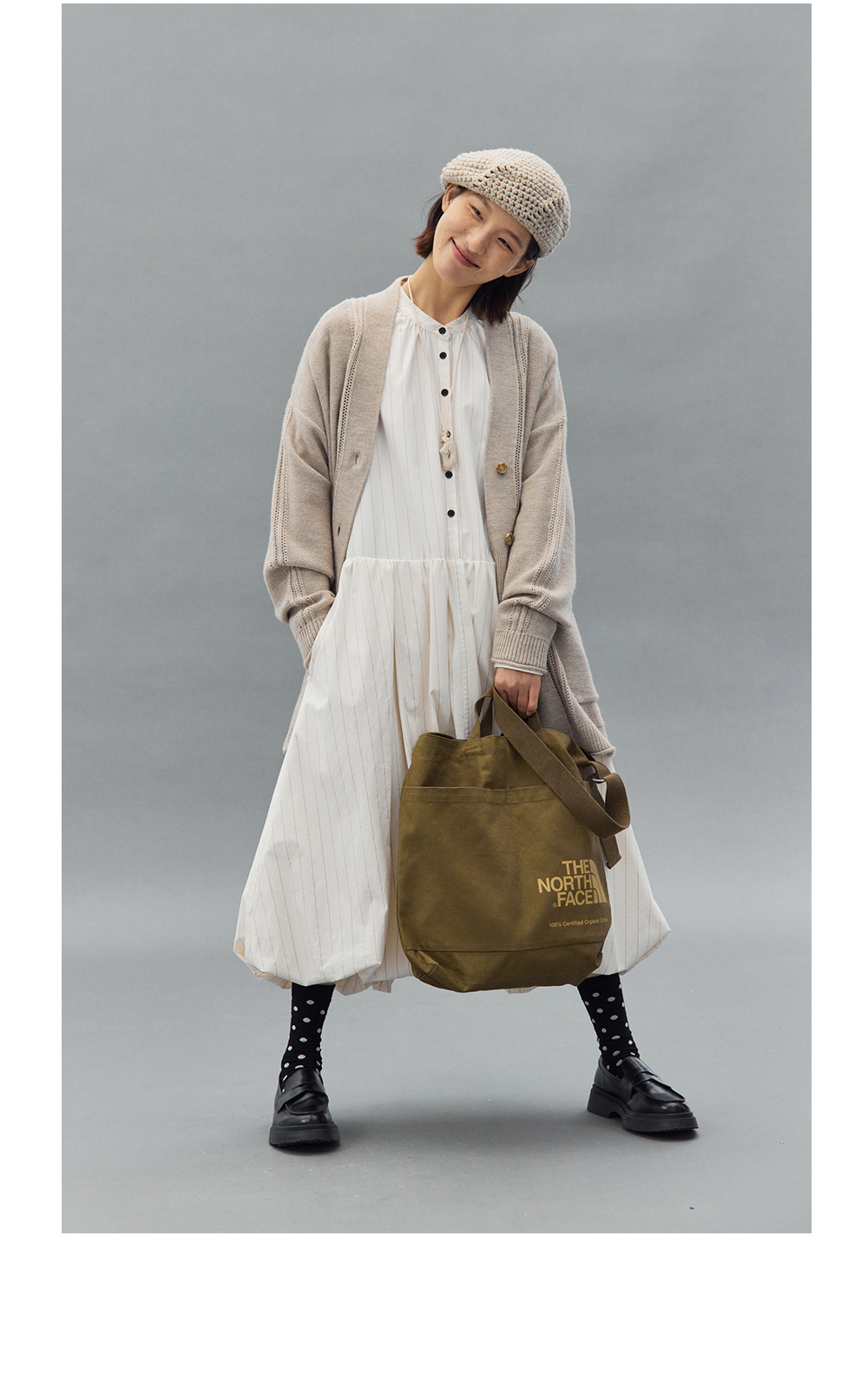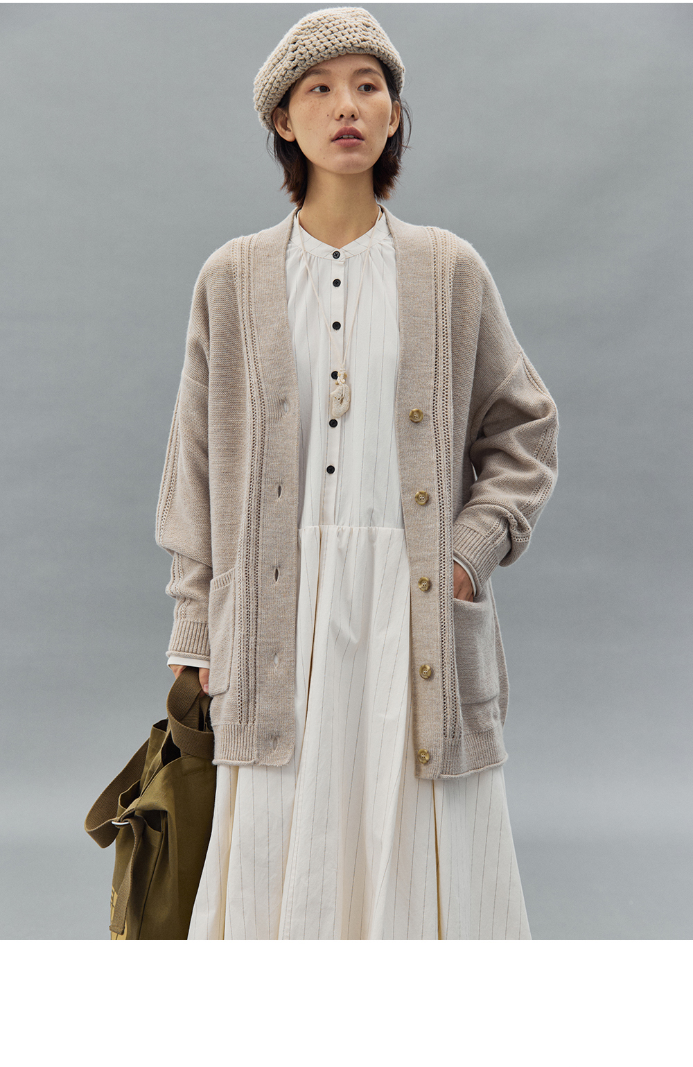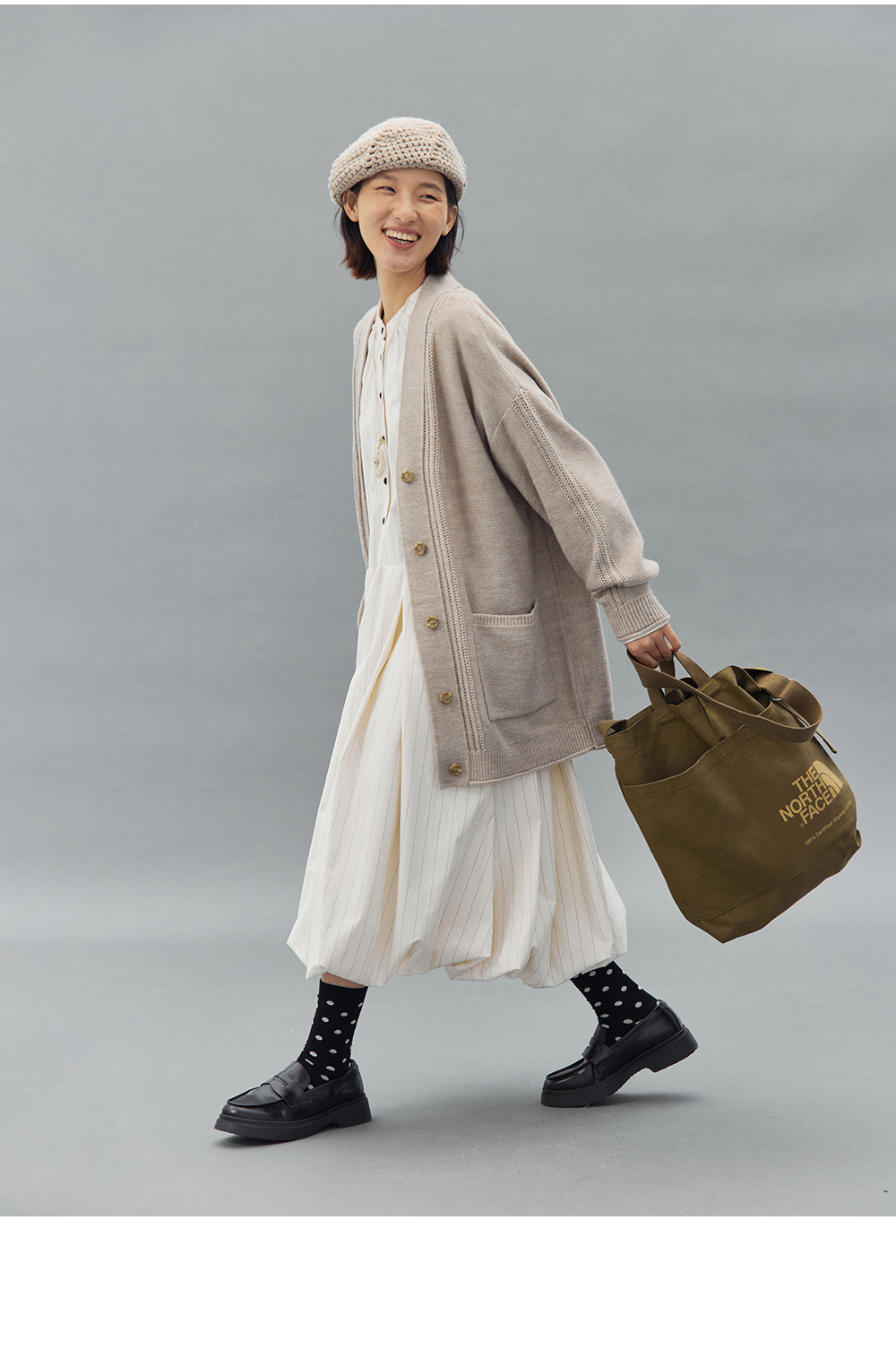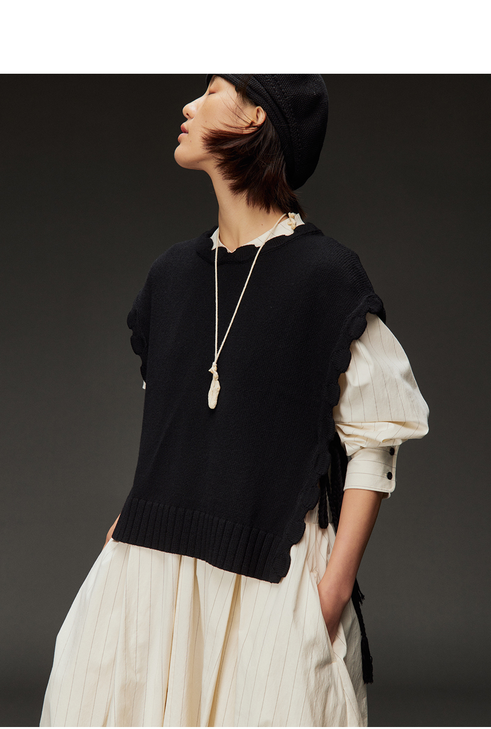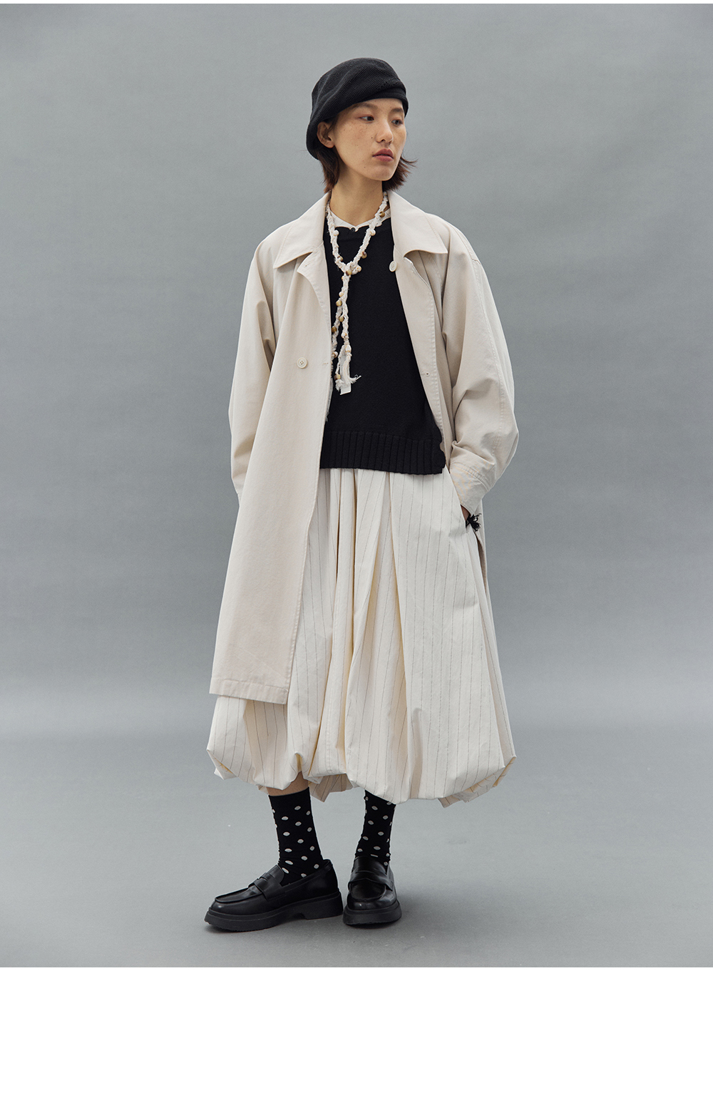 步履不停/4C31150C/花苞灯笼蛋糕裙小立领黑白条纹中长款连衣裙