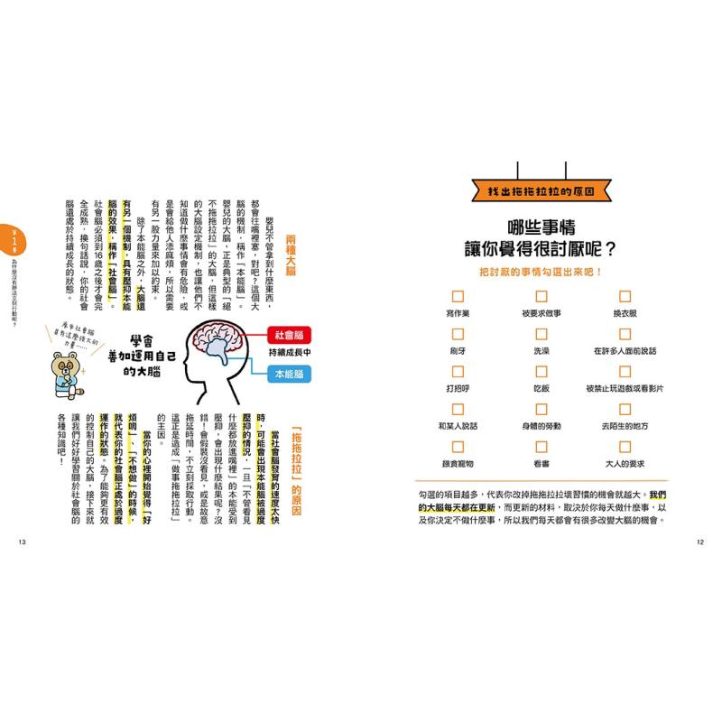作者首先以婴儿的大脑为例,说明「做事拖拖拉拉」的主因。婴儿不管拿到什么东西都会往嘴里塞,这样的大脑称作「本能脑」,也就是「绝不拖拖拉拉」的大脑。但大脑还有另一个会压抑「本能脑」的「社会脑」。当本能脑被压抑,我们对事物就会假装没看见,或是故意拖延时间,不立刻采取行动。