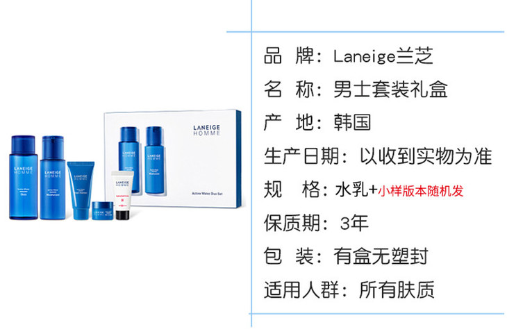 【韩国直邮】LANEIGE 兰芝男士清爽保湿两件套装(小样版本随机发)180ml+125ml【一个身份证一个订单】