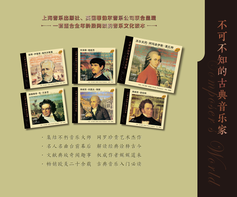 本系列丛书包含六本音乐读物,对贝多芬、莫扎特、海顿、舒伯特、柴科夫斯基和德彪西的生平及音乐作品均进行了深入浅出的讲解。图书配有大量精美图片,中文版出版时将请茅为蕙为书中呈现的所有乐谱录制配套演奏音频。