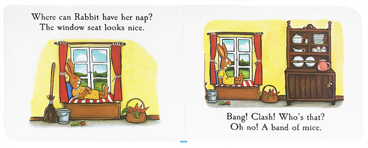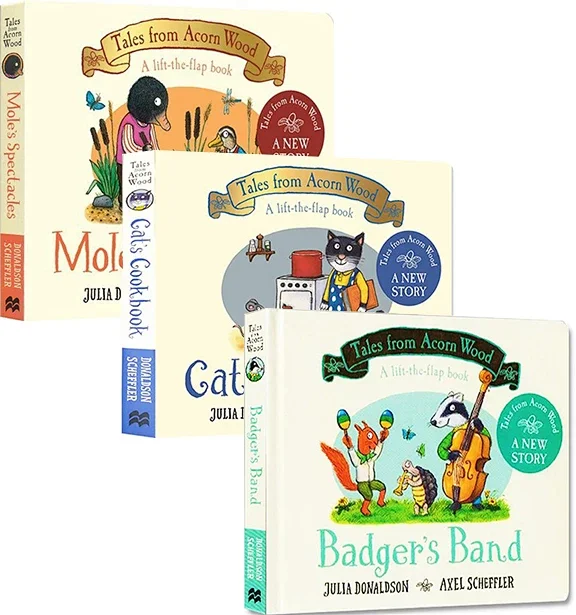 Tales from Acorn Wood系列绘本 ,以田园乡村为背景,不同主题以农村里的不同动物们做为主角。为了增加绘本的趣味性,说故事大师Julia Donaldson (怪兽古肥罗作家) 还设计了许多小翻页,一边看书一边猜图里面的内容,为平淡的阅读增添些许乐趣。 此系列的文字约2~3句,搭配上朗朗上口的押韵文字,适合初阶的孩子朗诵阅读。
