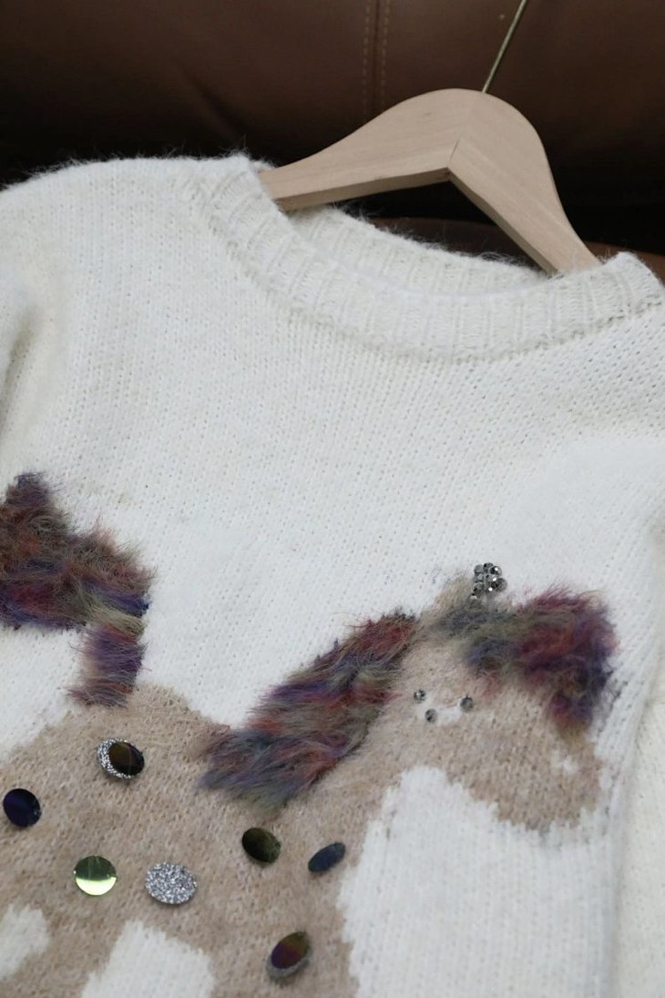 【手缝亮片长毛小马嵌花圆领毛衣】羊驼羊毛面料+彩色的毛绒+炫彩亮片+闪钻的装饰,让这件毛衣更有细节感WD