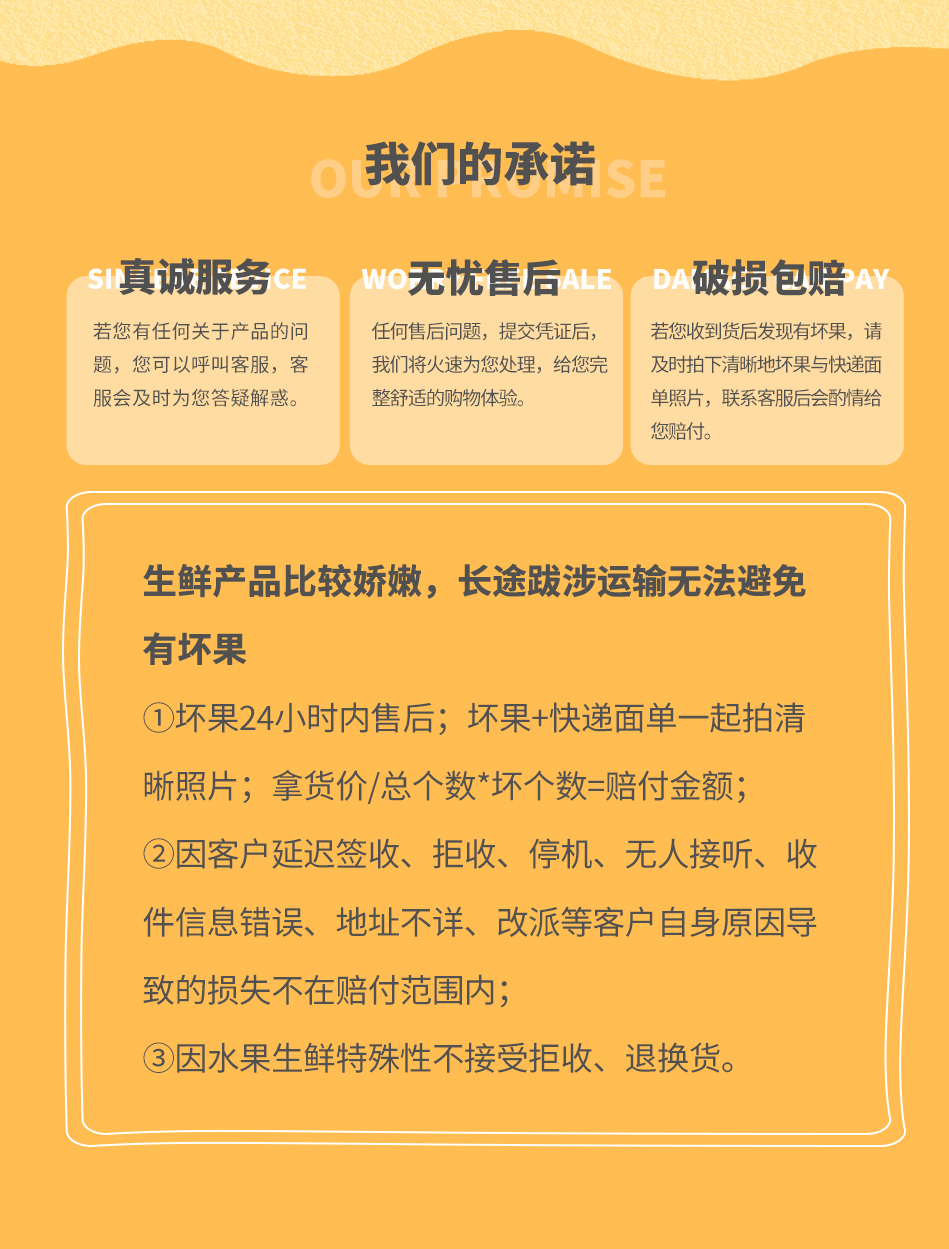 1、收到有坏的第一时间拍下坏果图和快递面单图联系客服售后处理,坏果一个按0.8元赔付