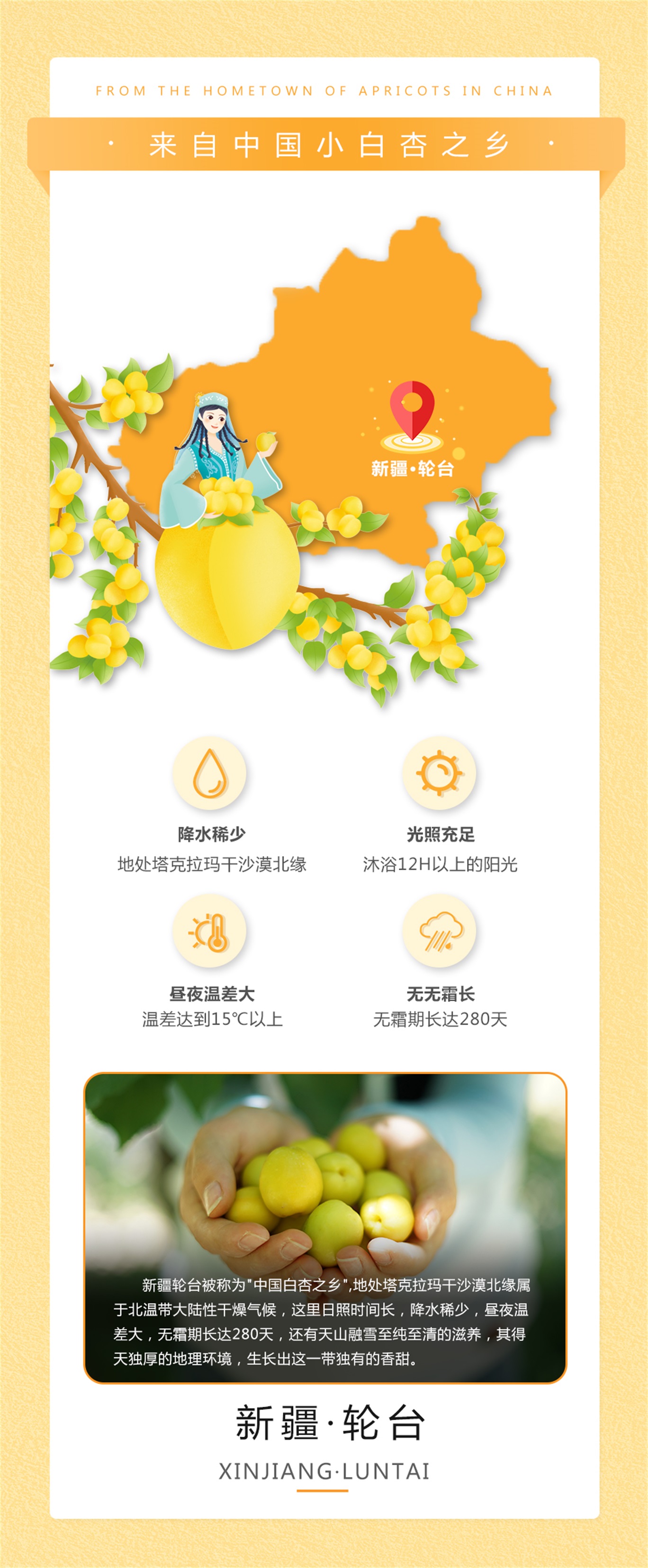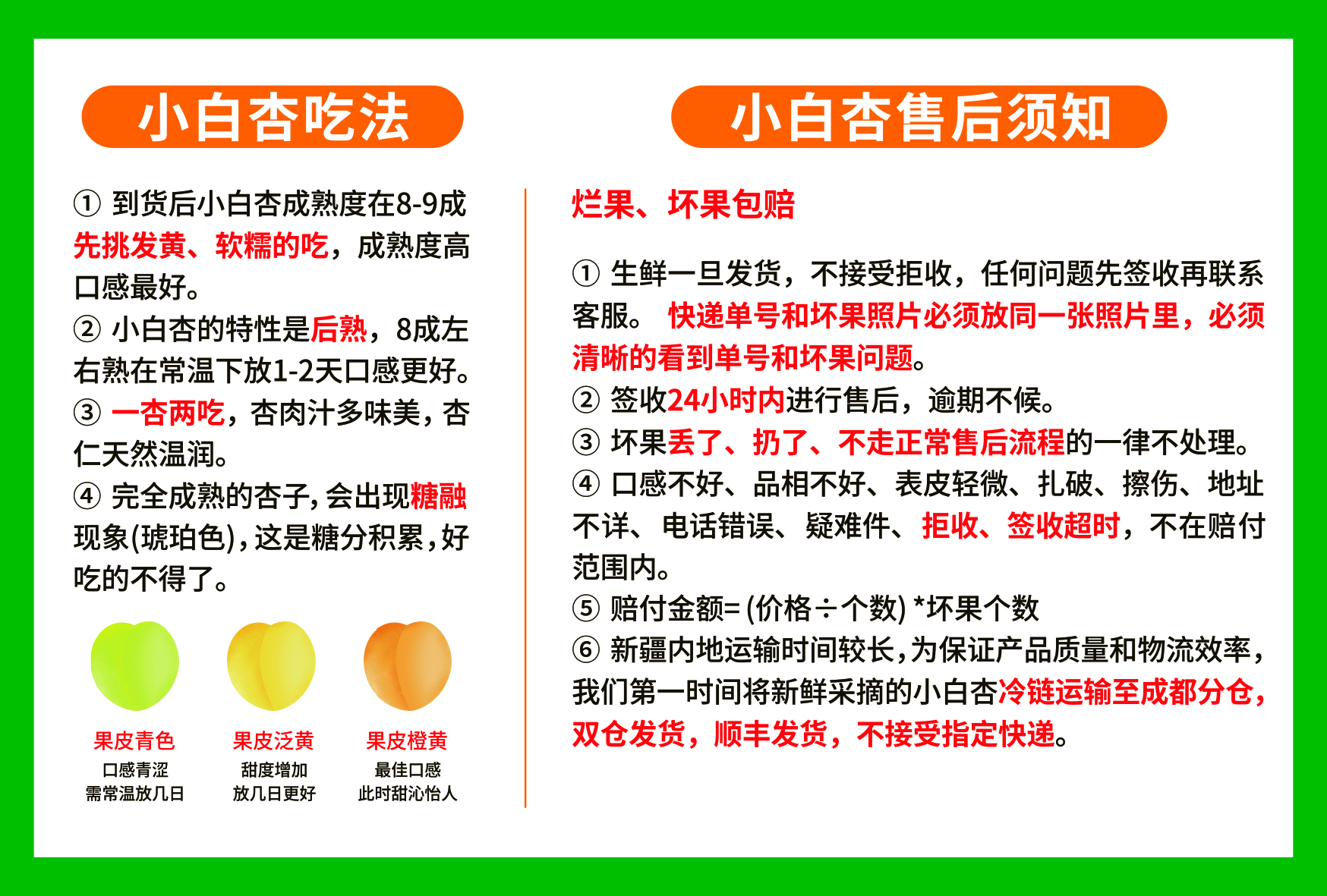 产品名称:新疆小白杏 规格:2斤礼盒/3斤礼盒/4斤礼盒 产地:新疆轮台/库车 发货地:成都/河北/新疆,多仓发货 发货快递:顺丰快递发货,不接受指定快递 不发货地区:西藏、港澳台、内蒙不发货 加运费地区:新疆+8元