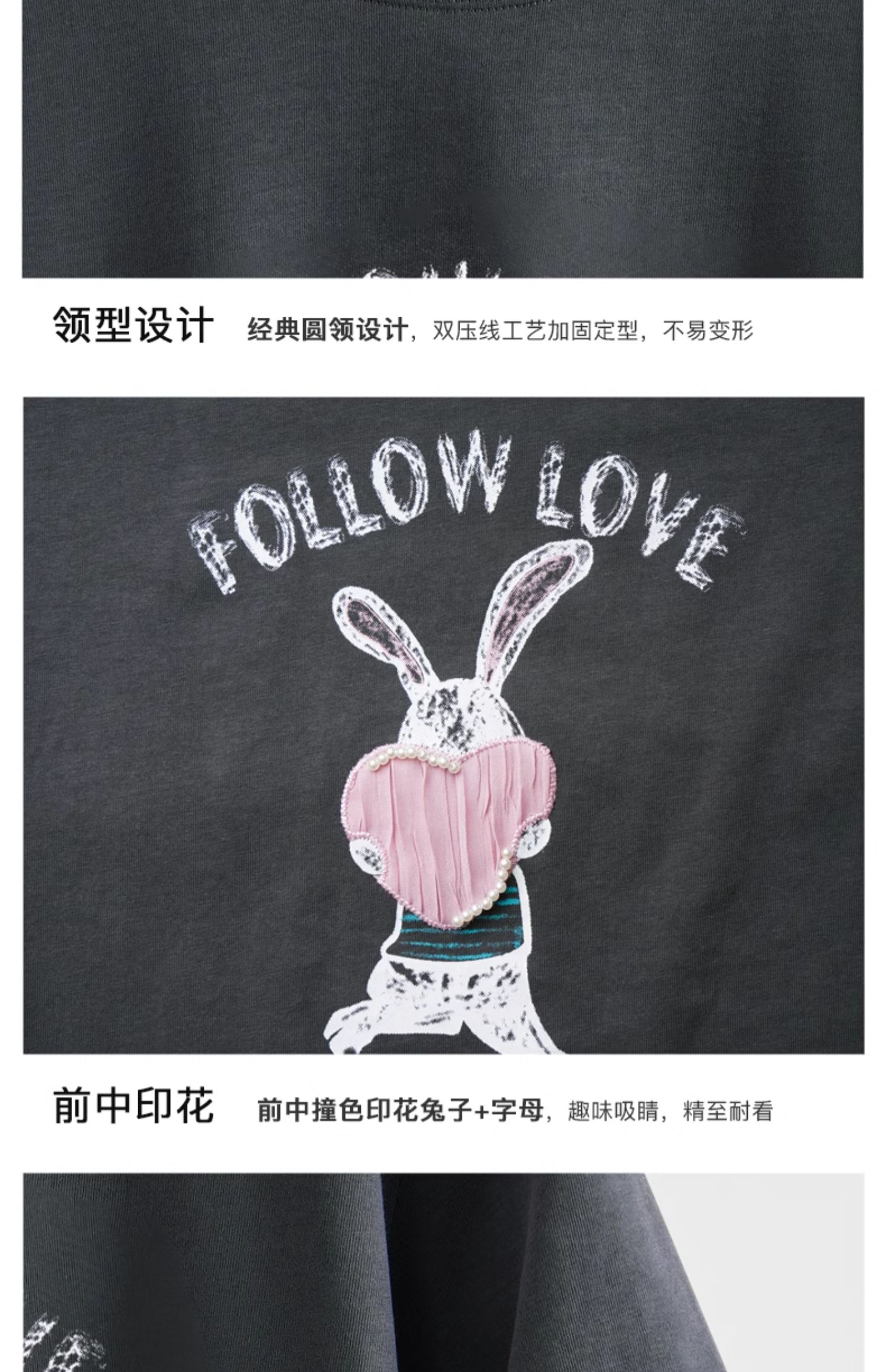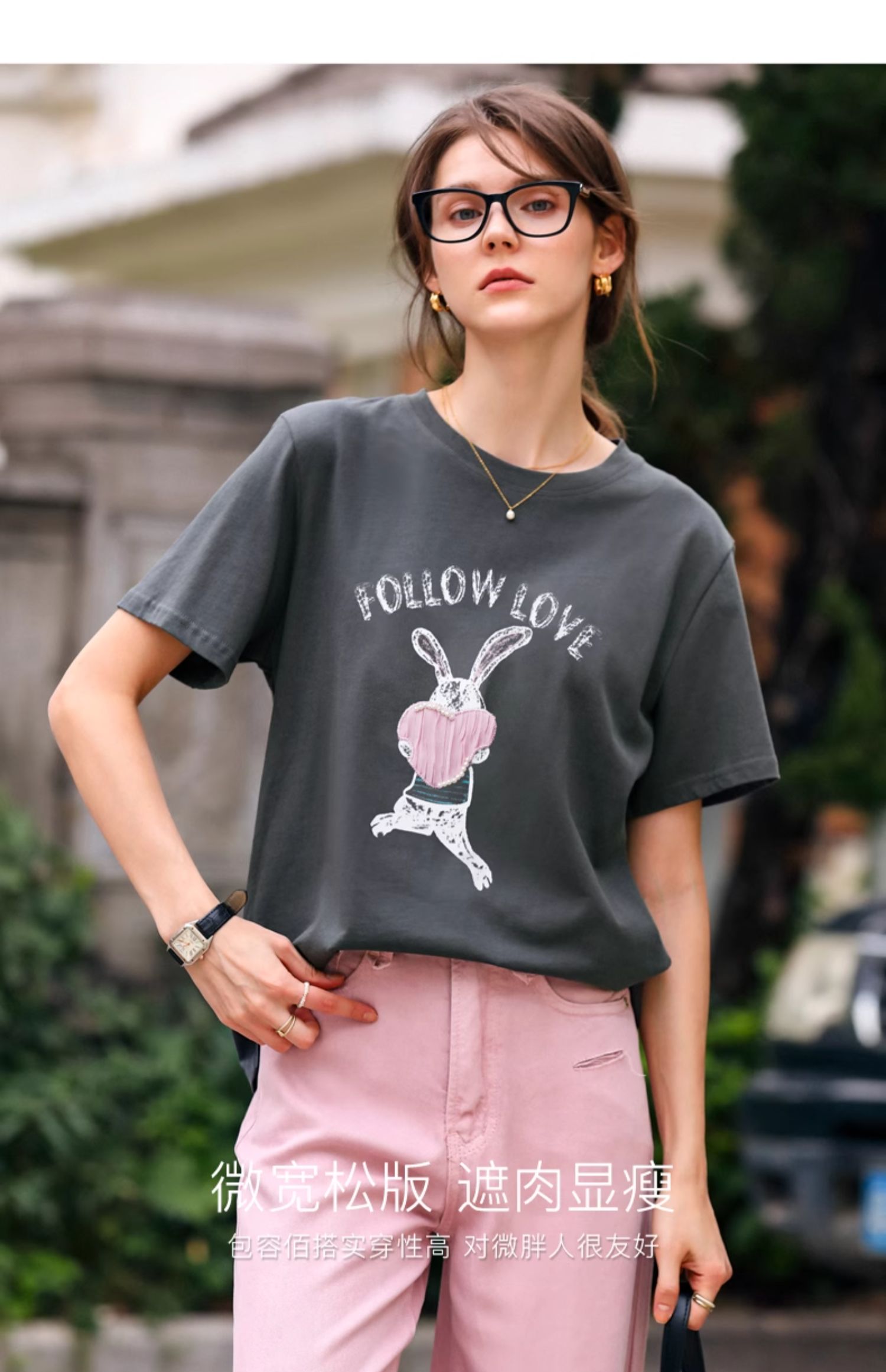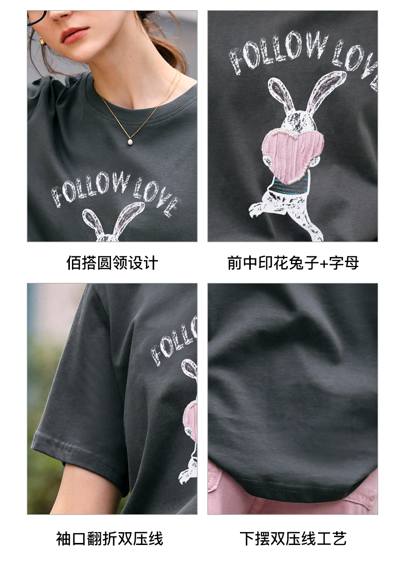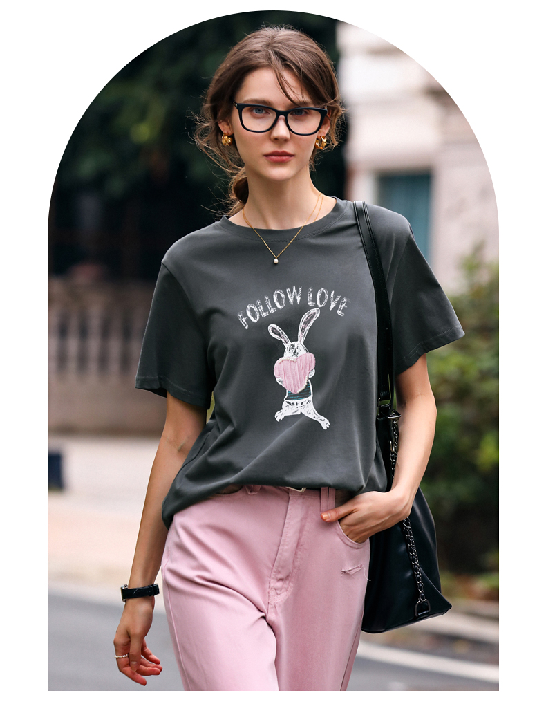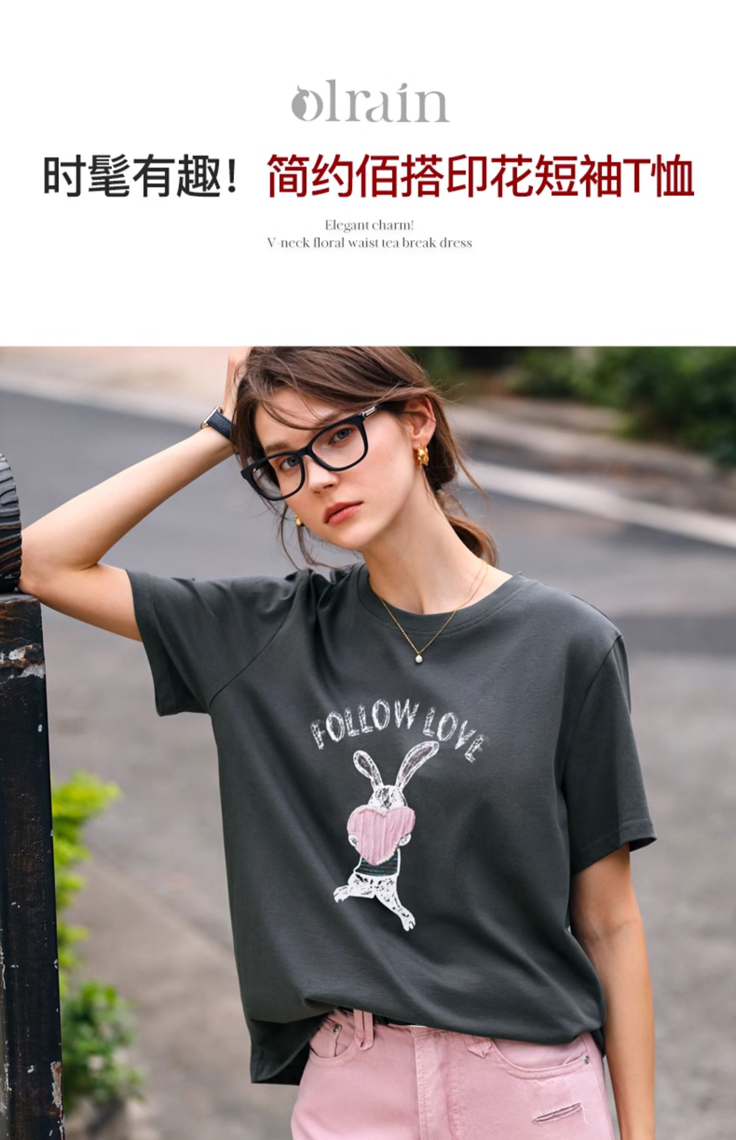 OLrain欧芮儿灰色T恤女春季2024年新款简约百搭宽松印花短袖上衣