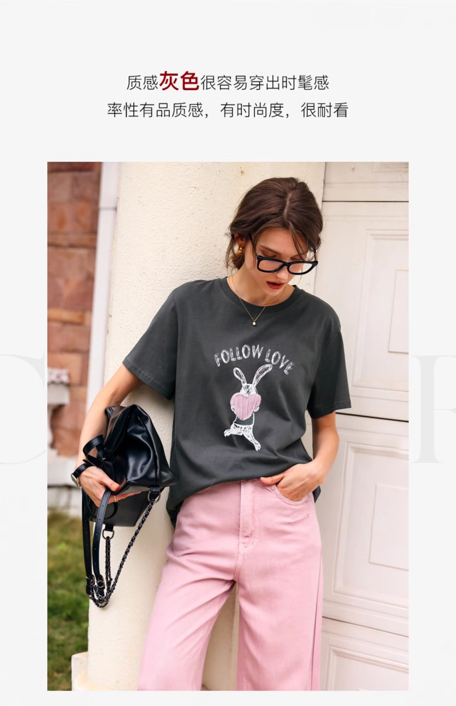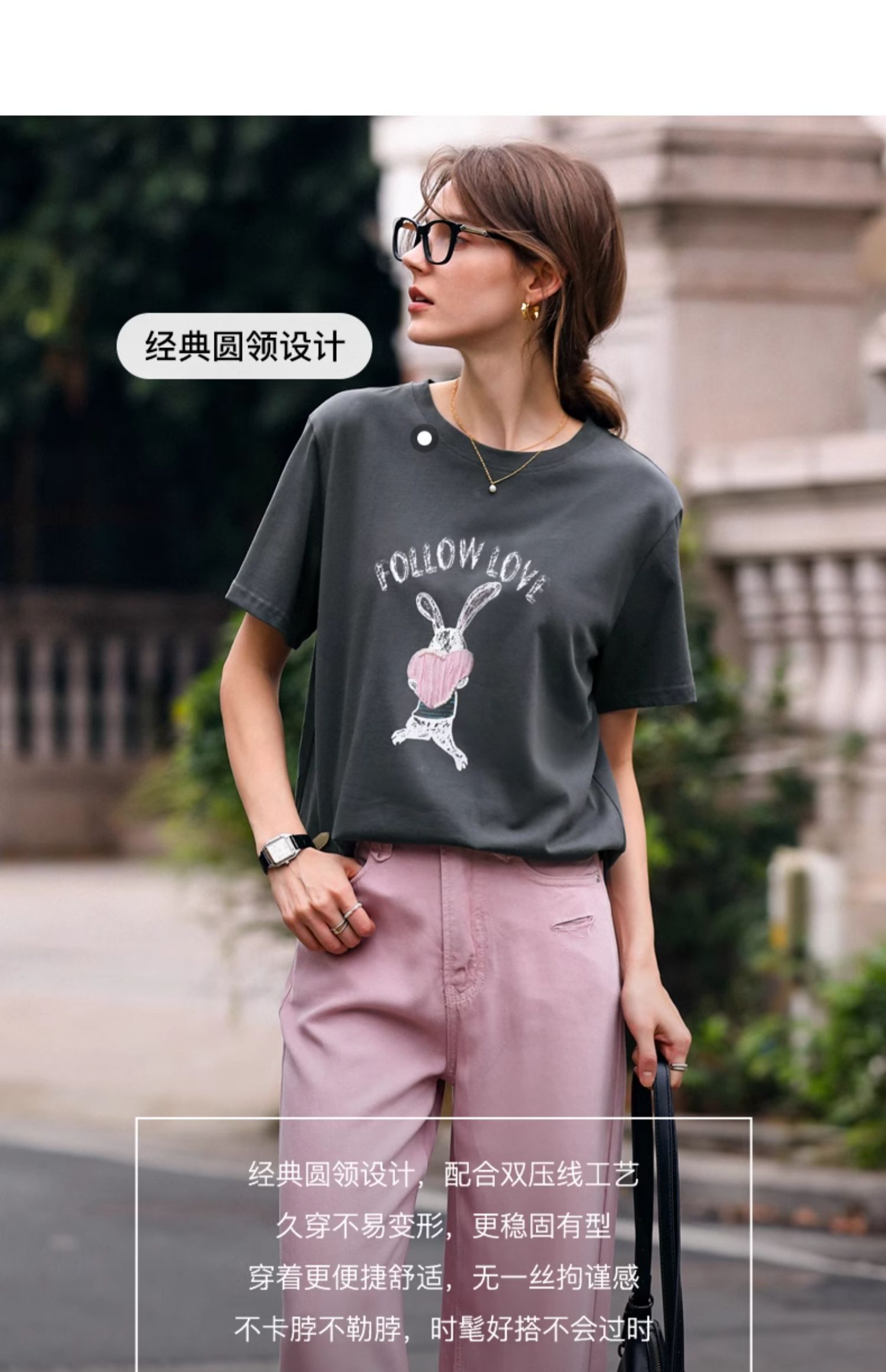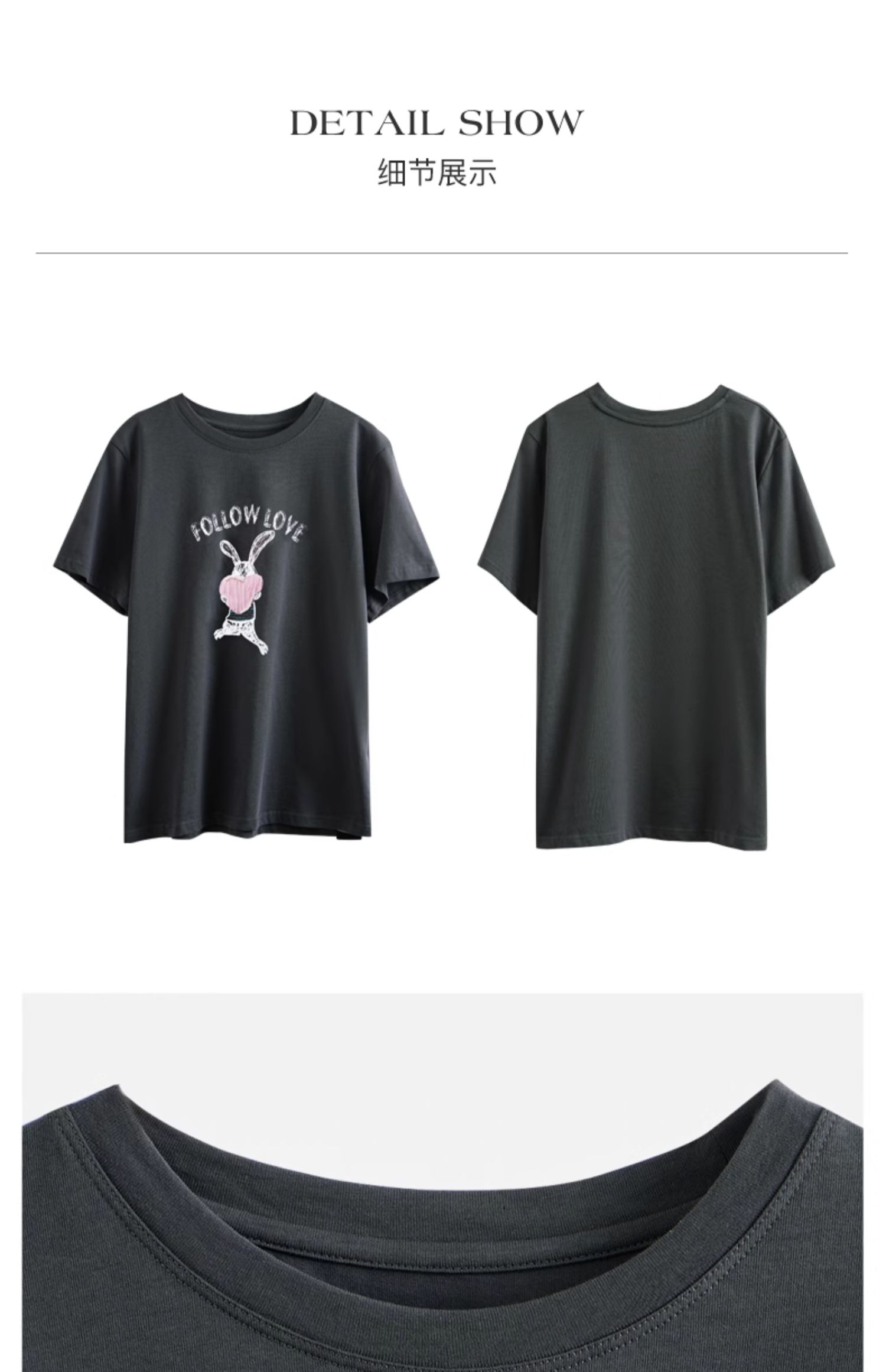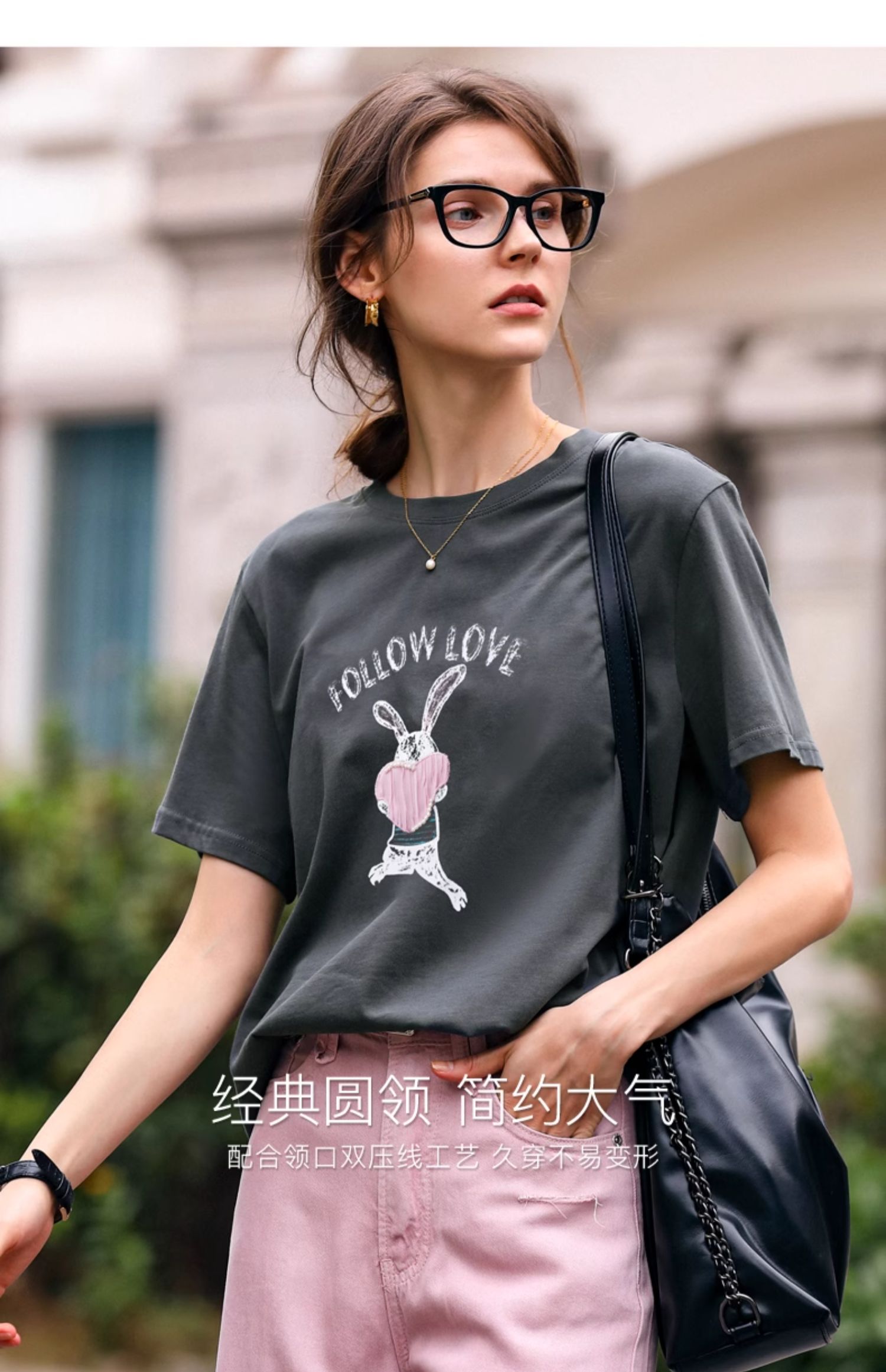 OLrain欧芮儿灰色T恤女春季2024年新款简约百搭宽松印花短袖上衣