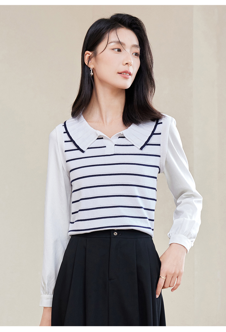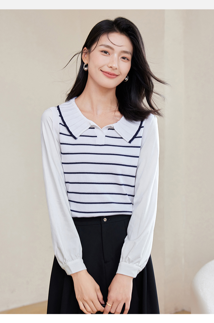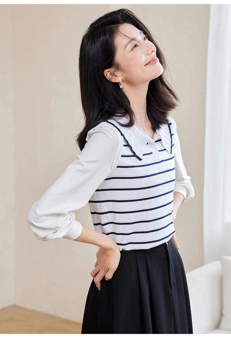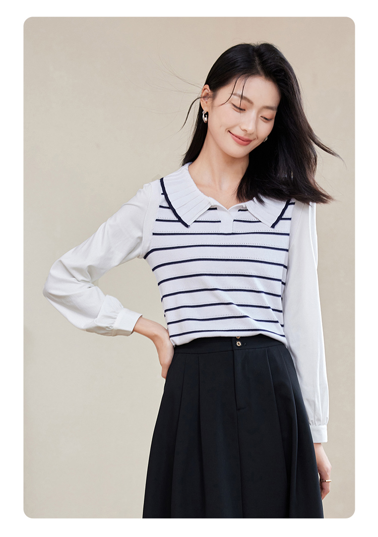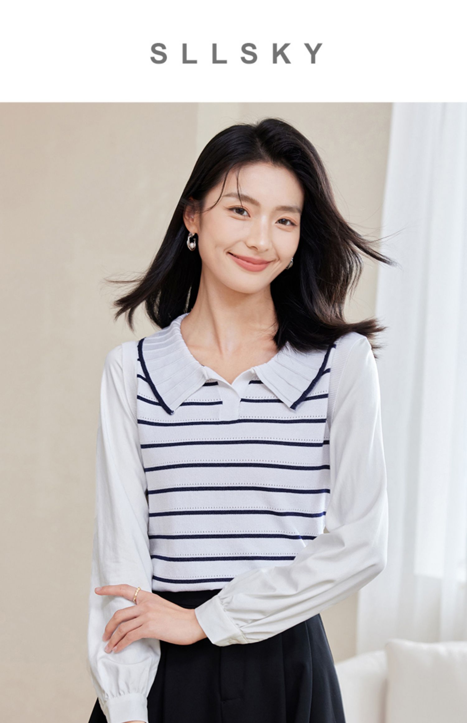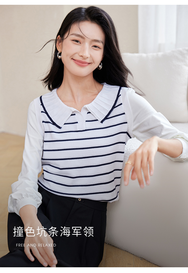 【开门红】熙世界设计感时尚条纹海军领拼接上衣假两件针织衫2025秋装新款