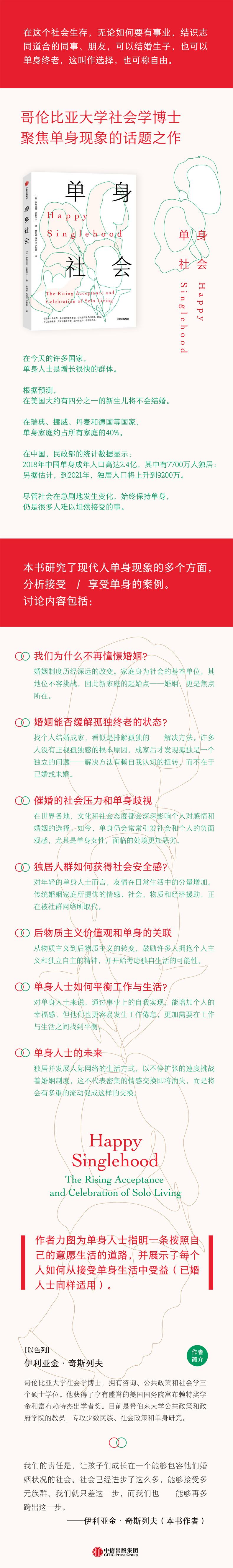 1、哥伦比亚大学社会学博士聚焦单身现象的话题之作,帮助广大单身人士建立自信,提高幸福力。作者伊利亚金本身是一位单身人士,且专攻单身方面的研究,他在书中广泛分析了当今单身现象的各个方面,如婚姻地位的变迁、单身人士所面临的社会压力和歧视、单身人士如何获得社会安全感……所讨论的,无一不是当下被广泛关注和讨论的社会热点,作者力图为单身人士指明一条按照自己的意愿生活的道路,并展示了每个人如何从接受单身生活中受益(已婚人士同样适用)。