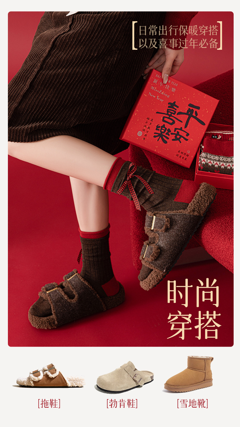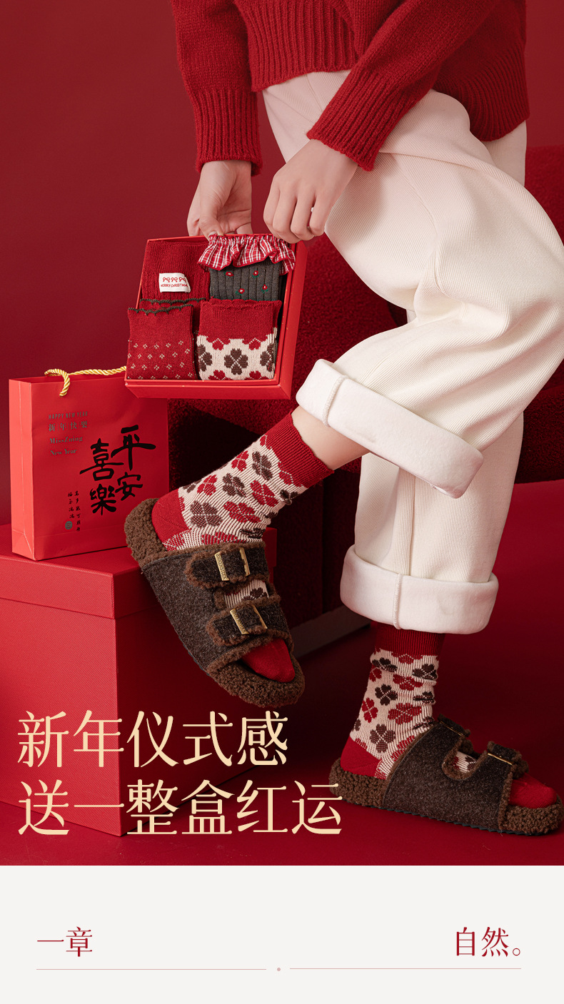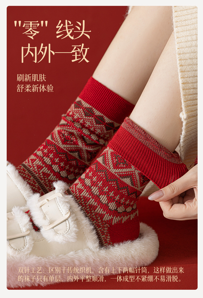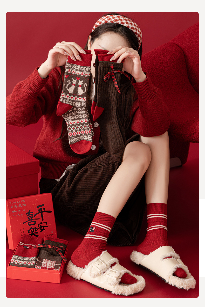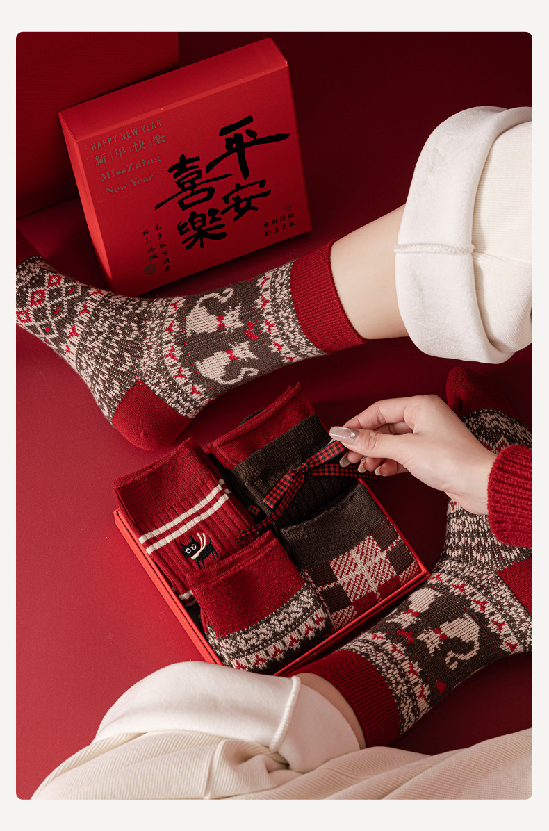 【云优选】鸿运礼盒🎁4双装羊绒袜❗️ 冬季保暖羊绒袜礼盒 大红袜双针双路无线头中筒袜子 本命年红袜 新年袜