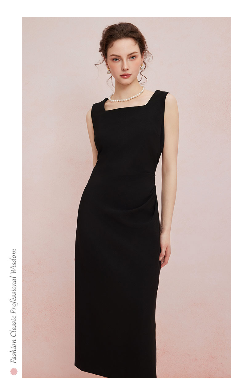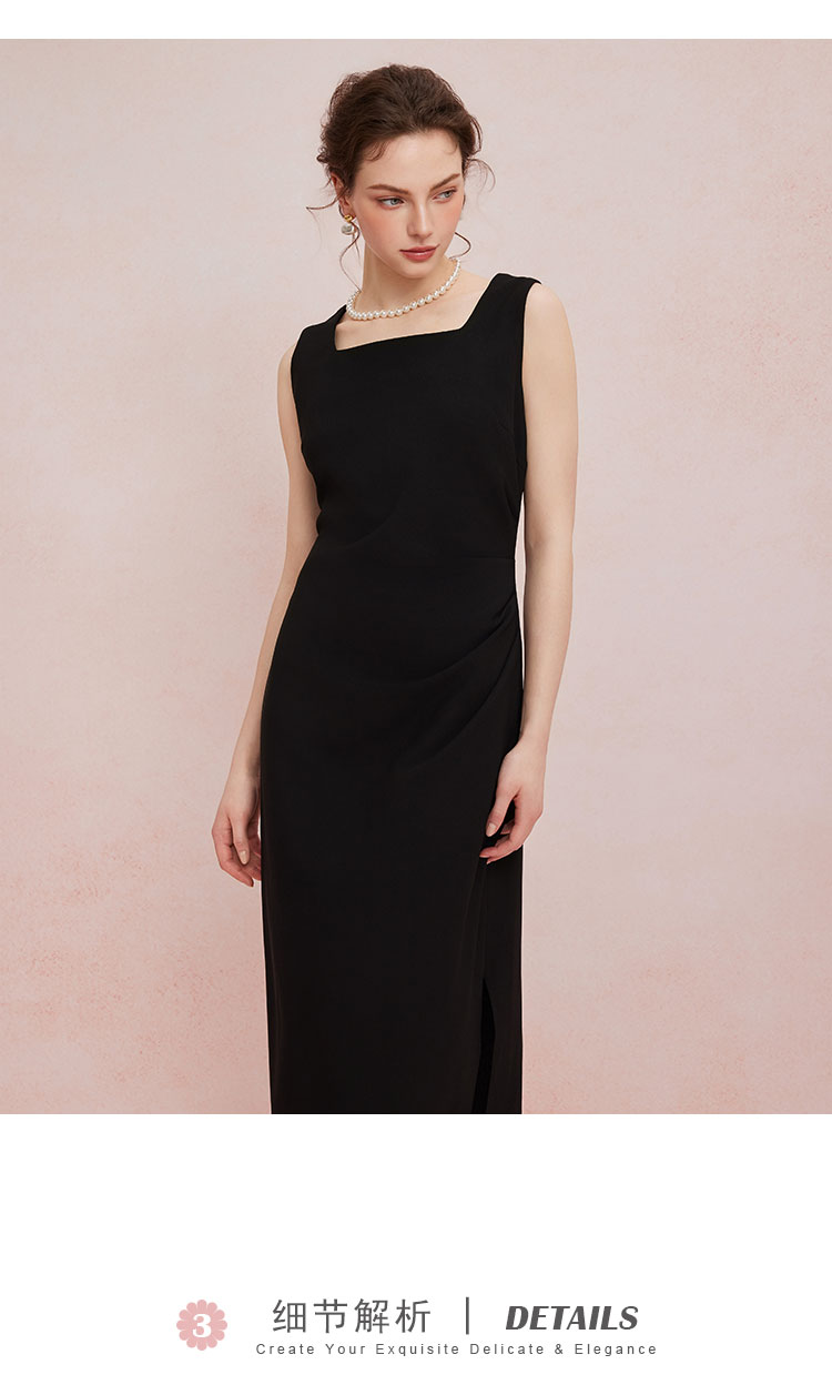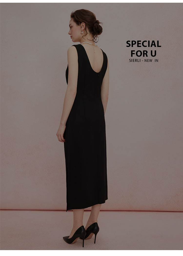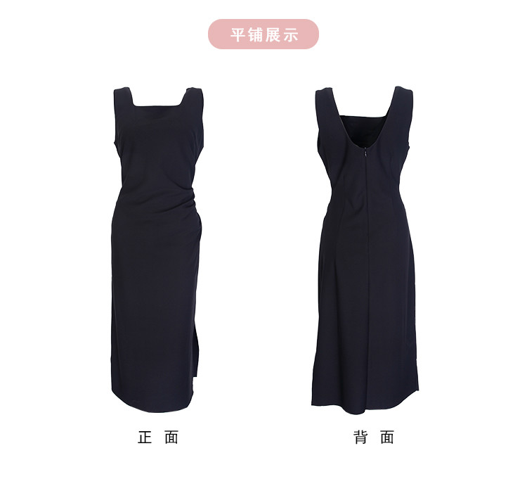 QF845斯尔丽2025新款高弹面料舒适收褶显瘦藏肚子侧边开叉背心式连衣裙