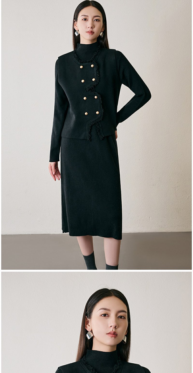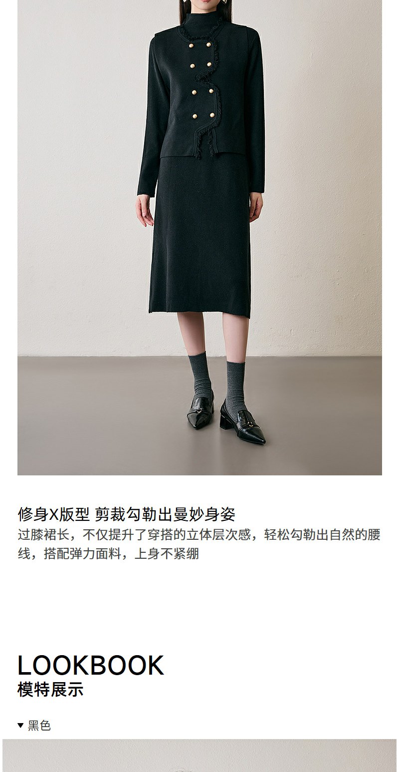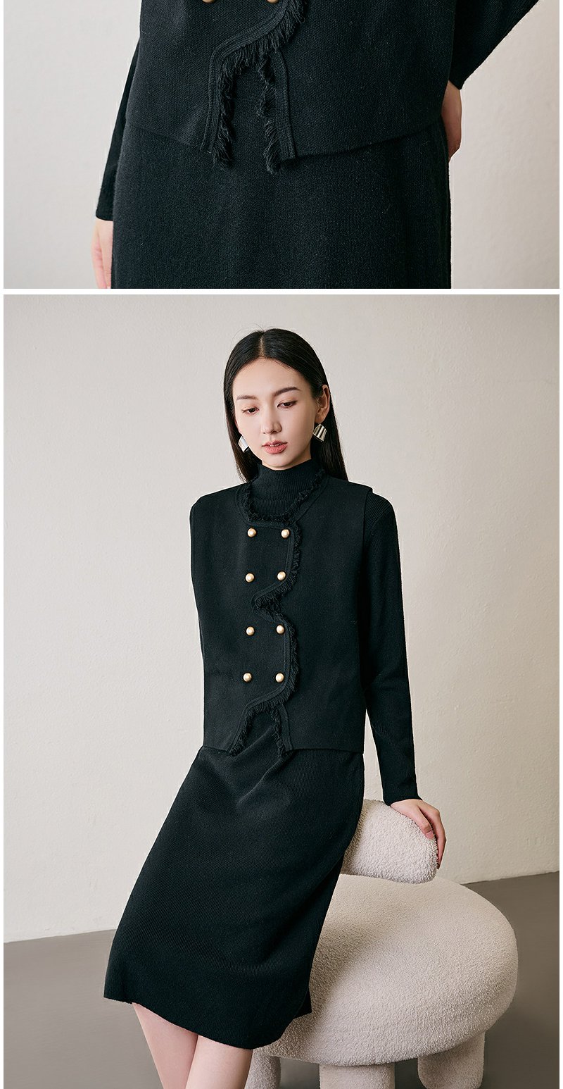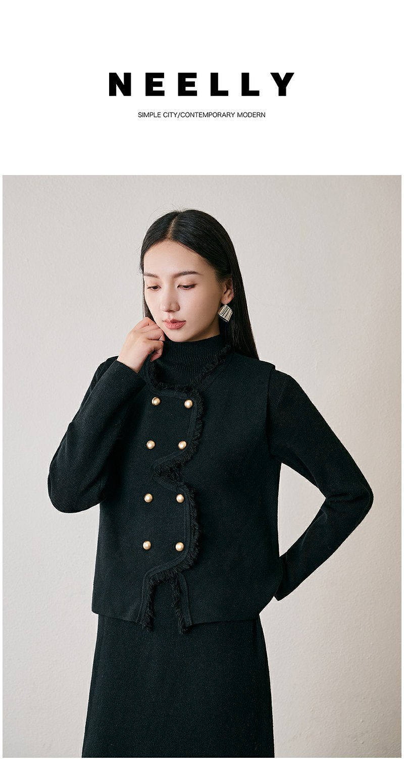 NEELLY纳俪冬季新款气质小立领黑色后开叉针织连衣裙套装女两件套N24114Y05503