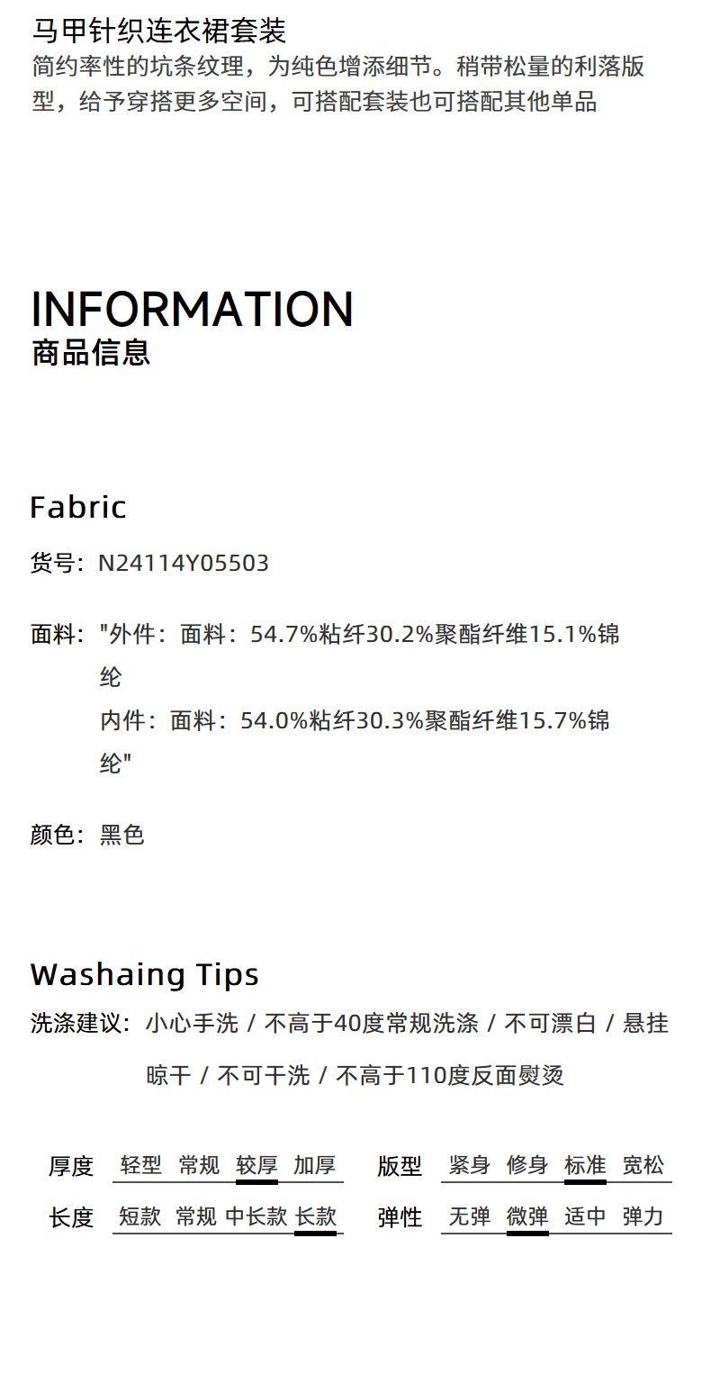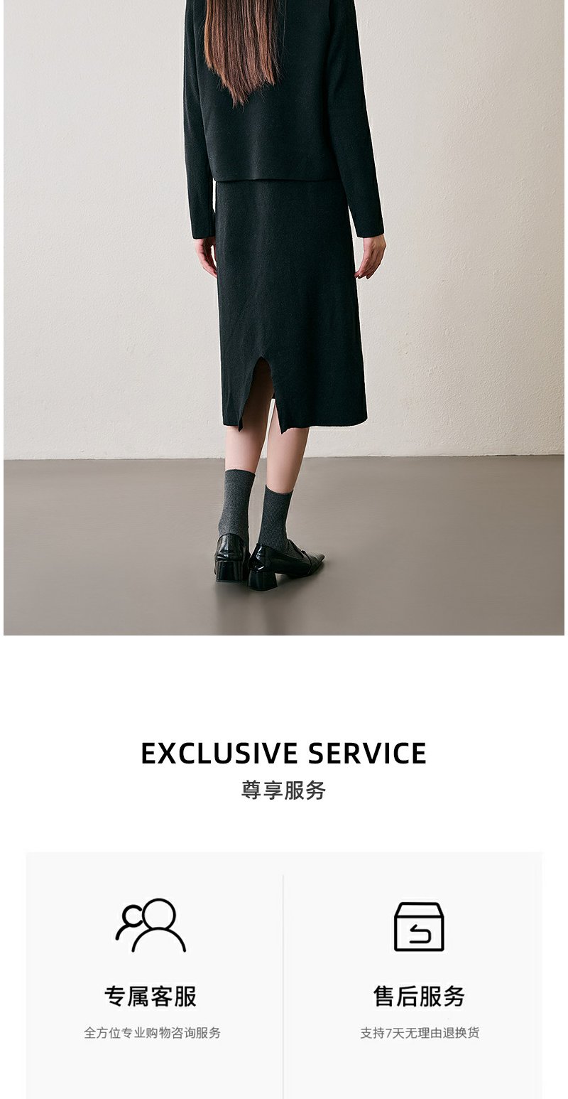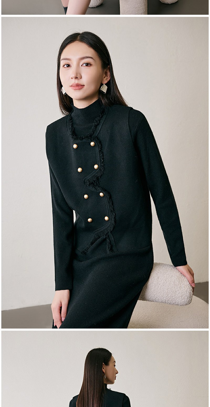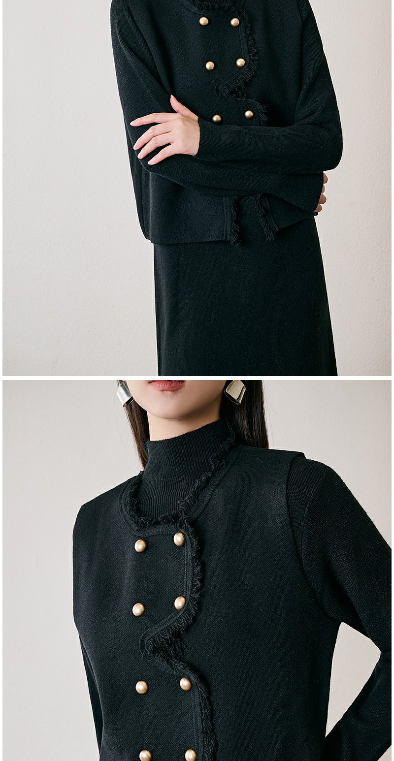 NEELLY纳俪冬季新款气质小立领黑色后开叉针织连衣裙套装女两件套N24114Y05503