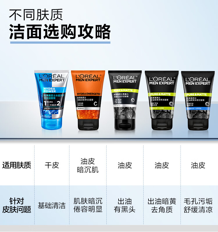欧莱雅男士水能润泽双效/控油碳爽/劲能深层/抗黑头净化/火山岩控油洁面膏100ml