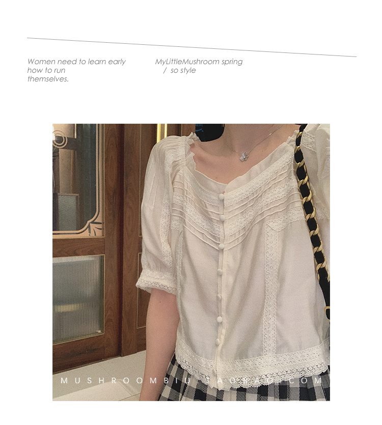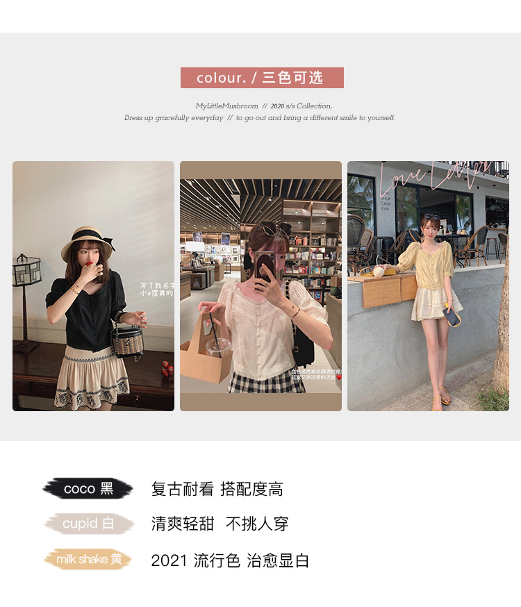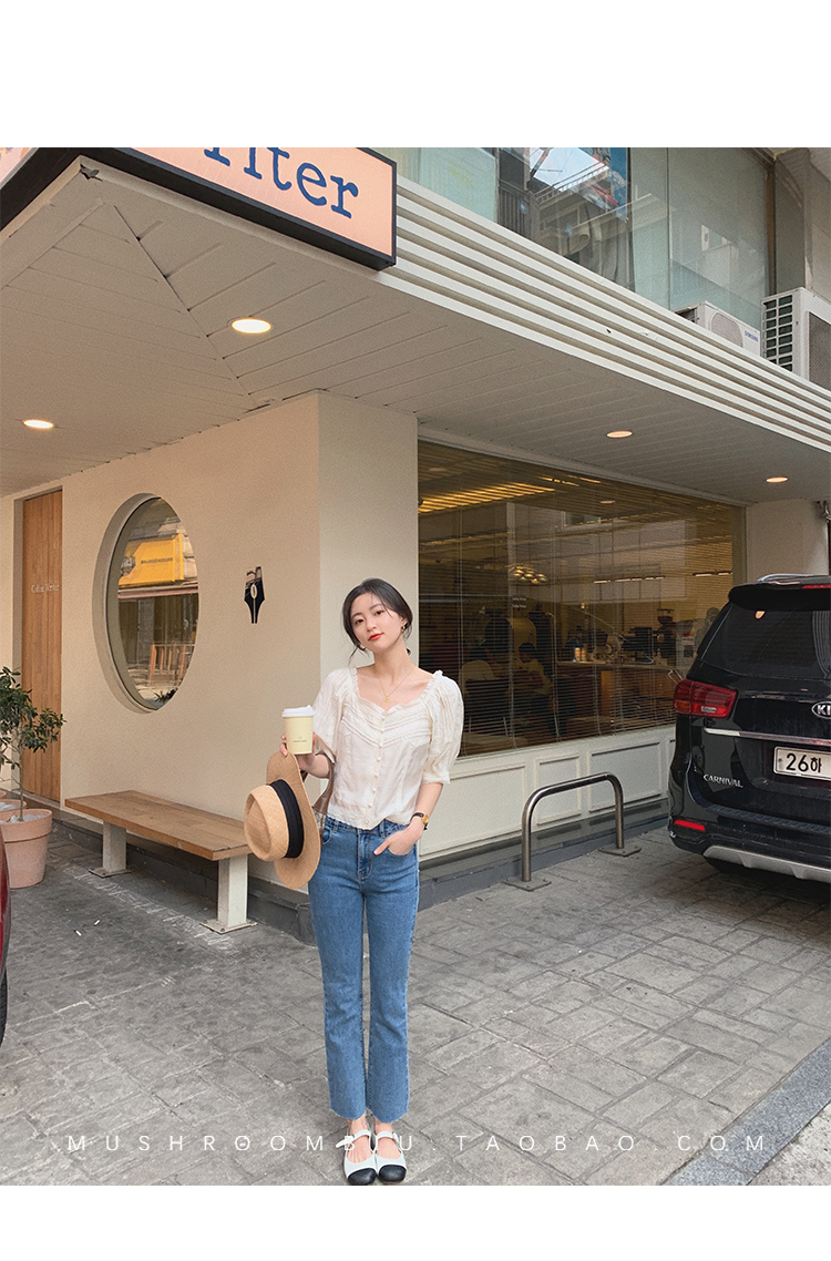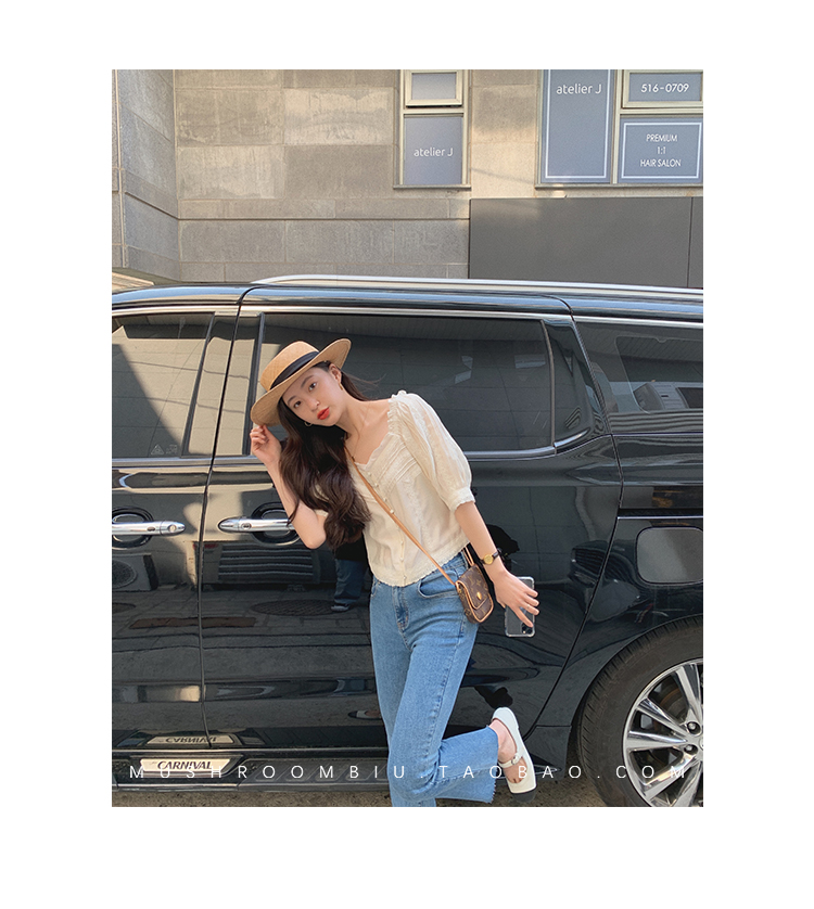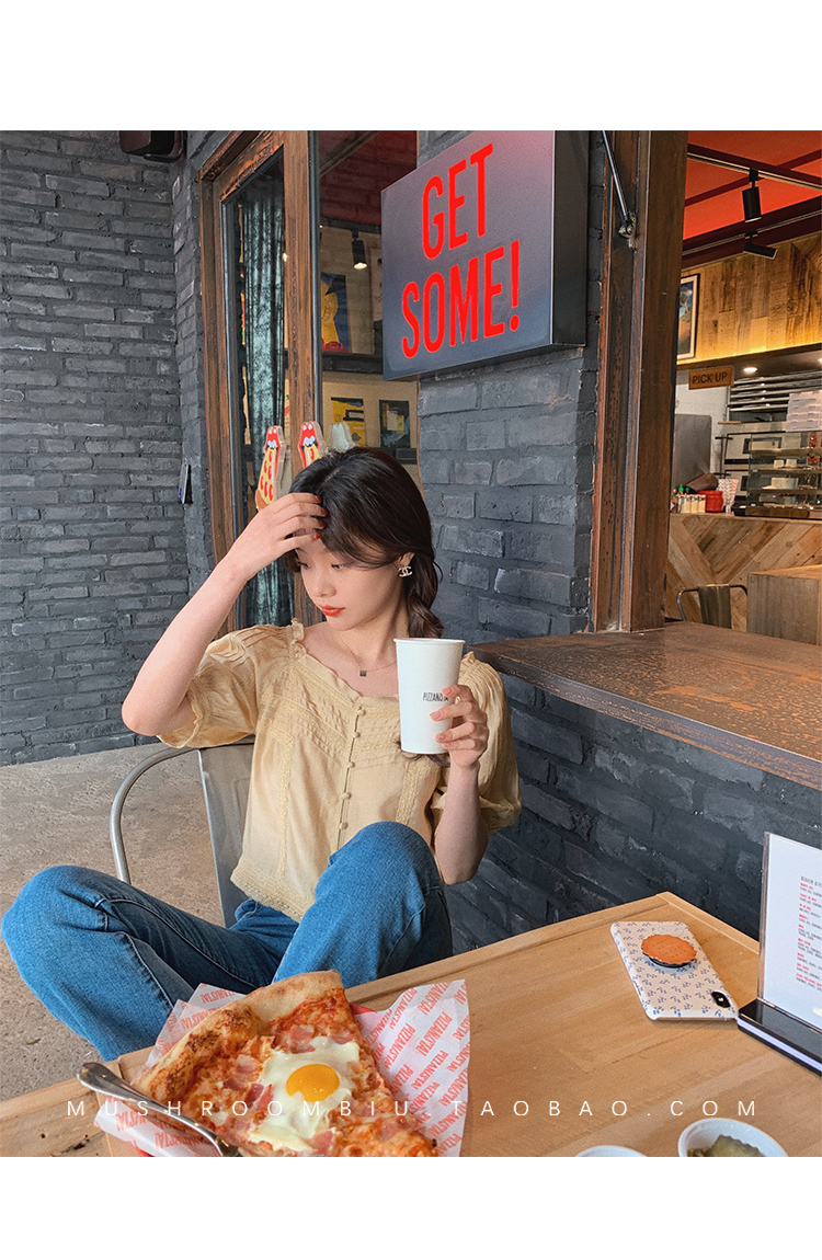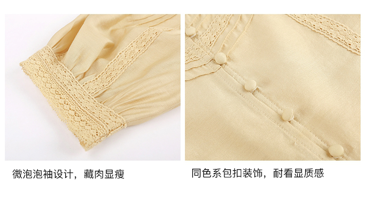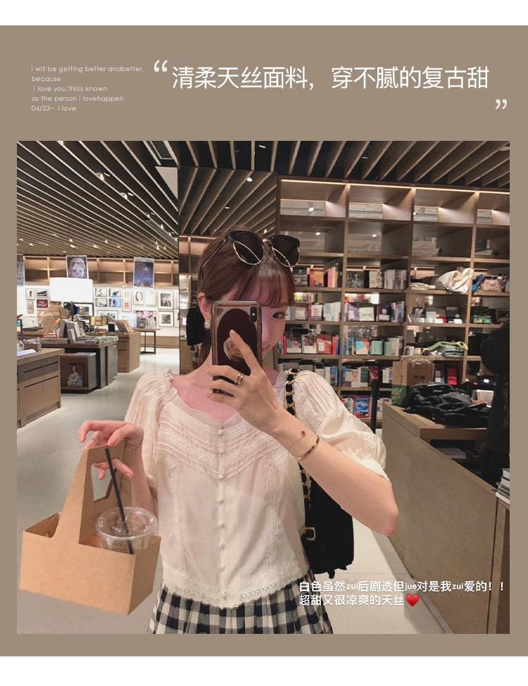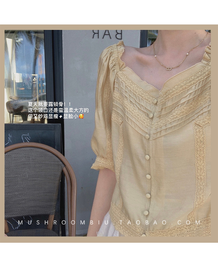 【金蘑菇菇 里斯本假日】露锁骨清柔天丝复古泡泡袖小衫短款上衣