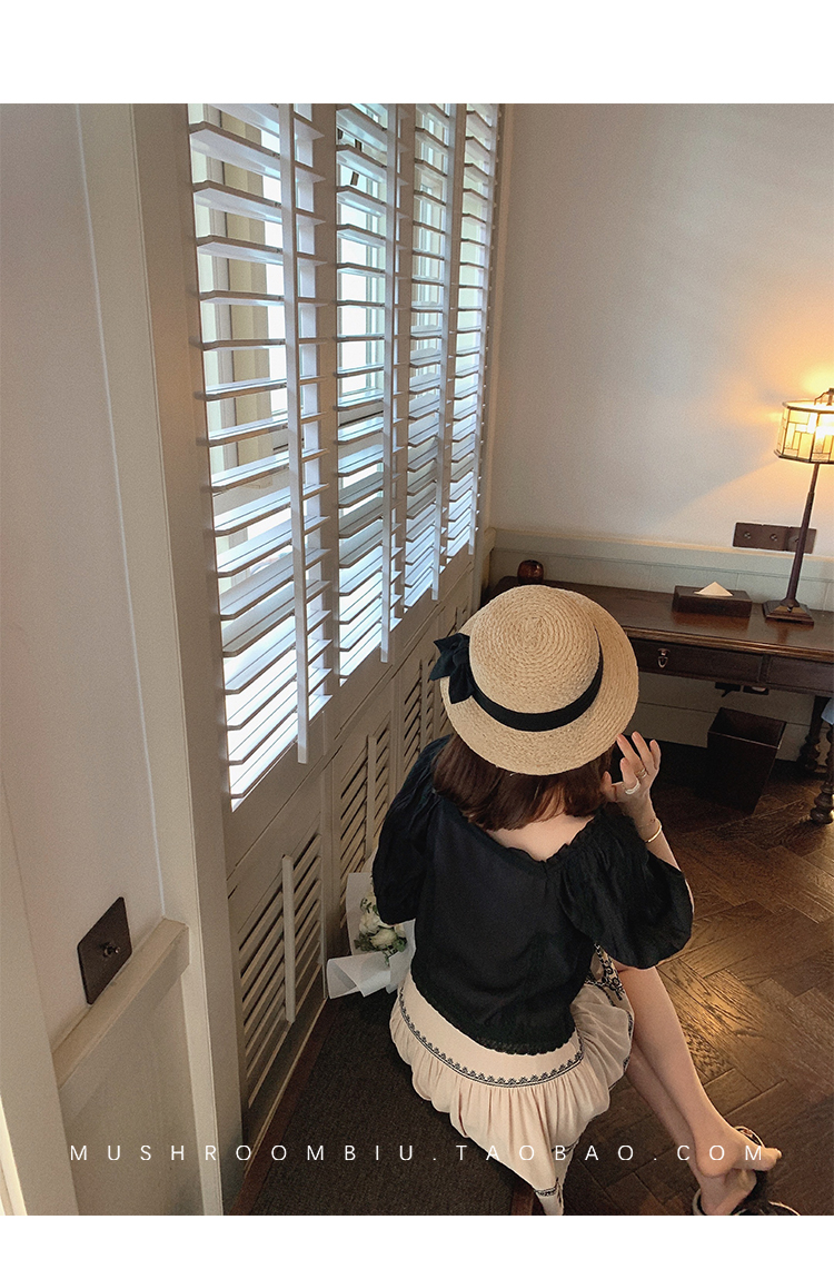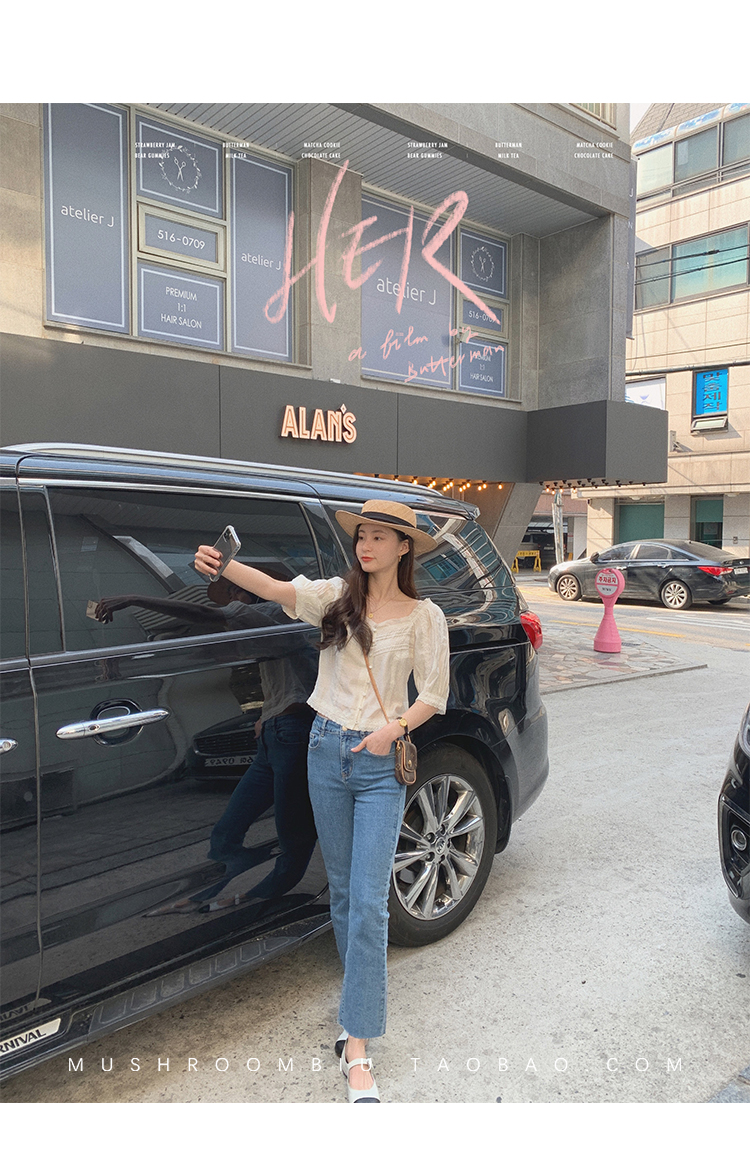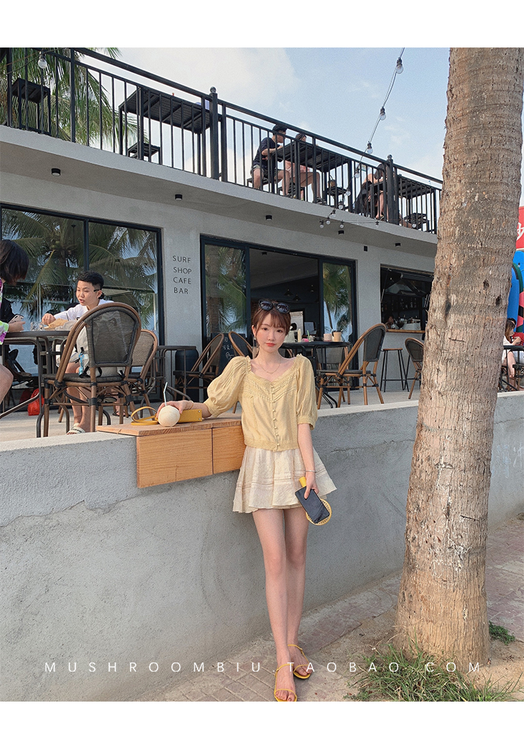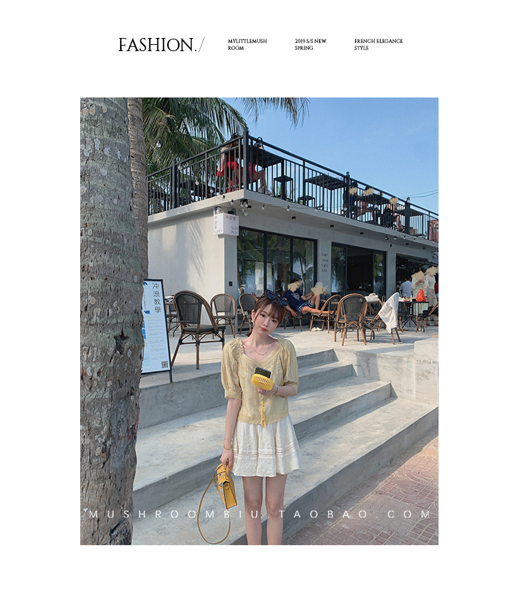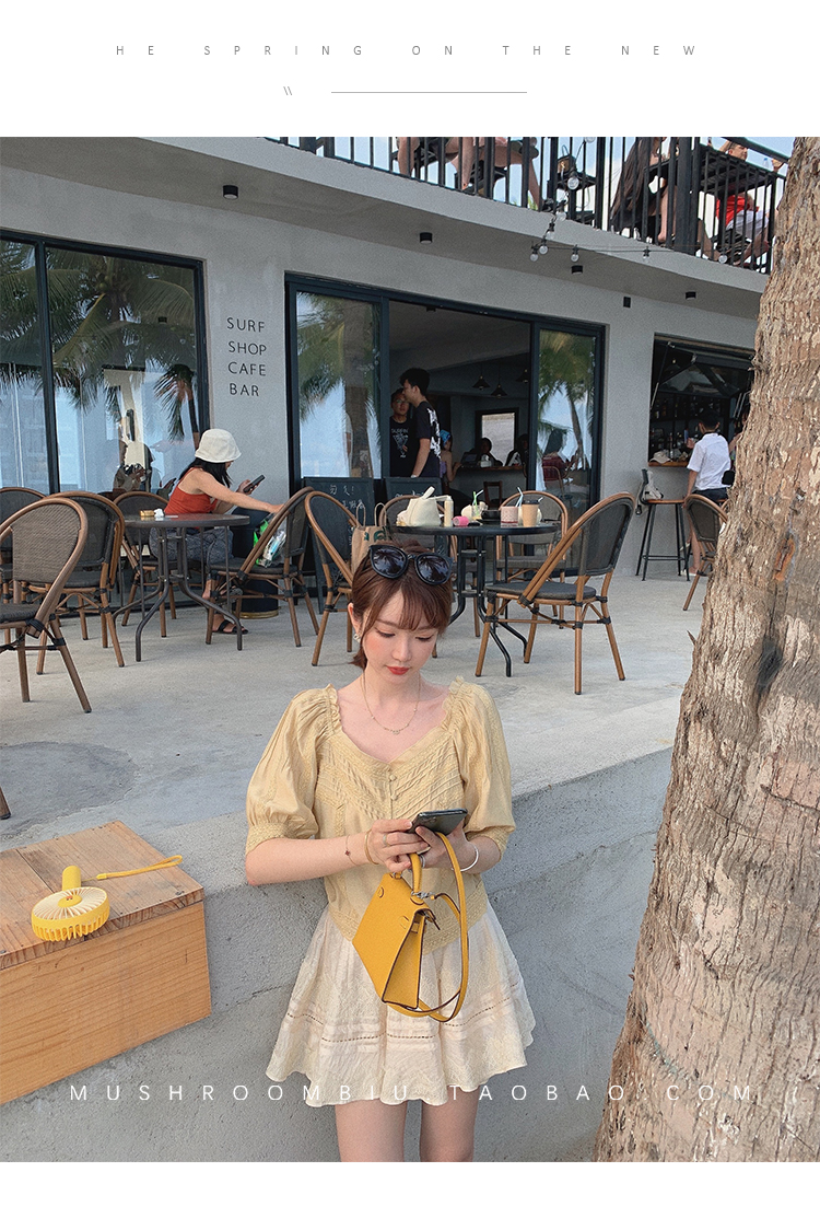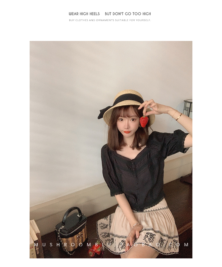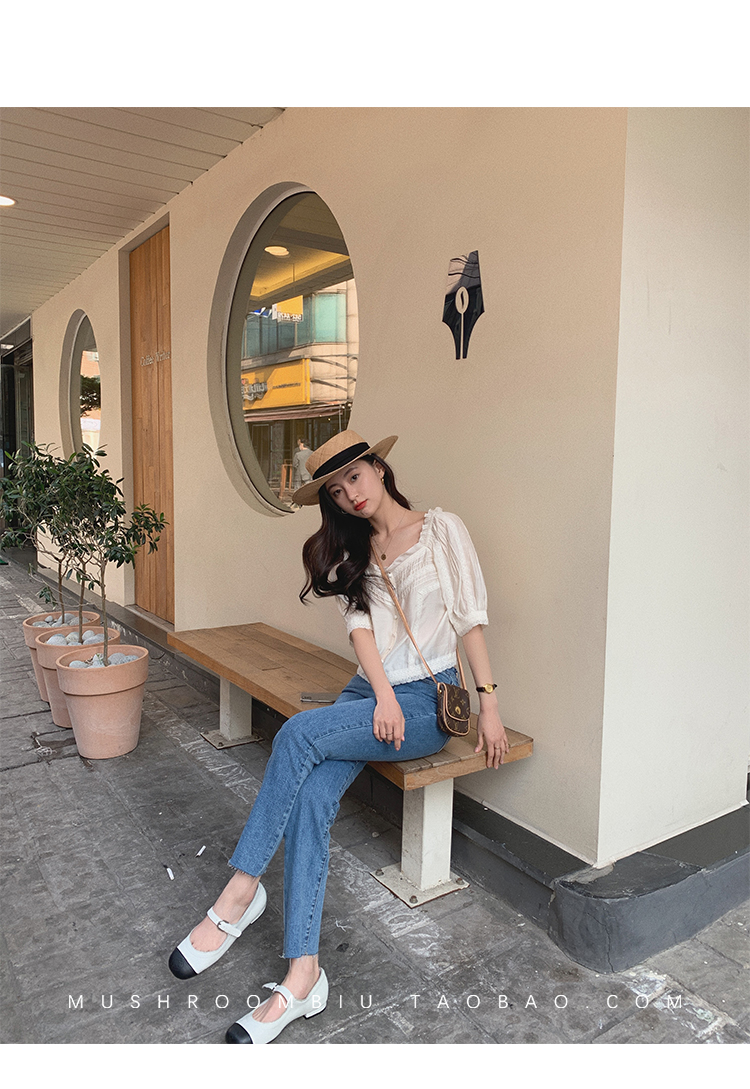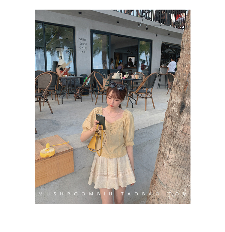 【金蘑菇菇 里斯本假日】露锁骨清柔天丝复古泡泡袖小衫短款上衣