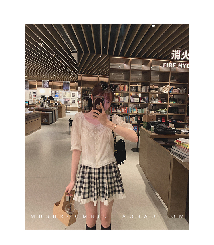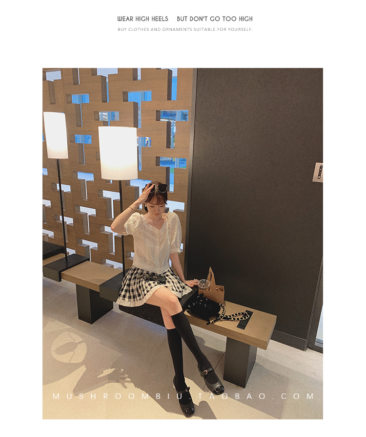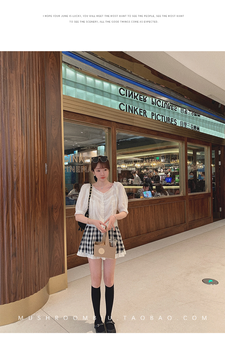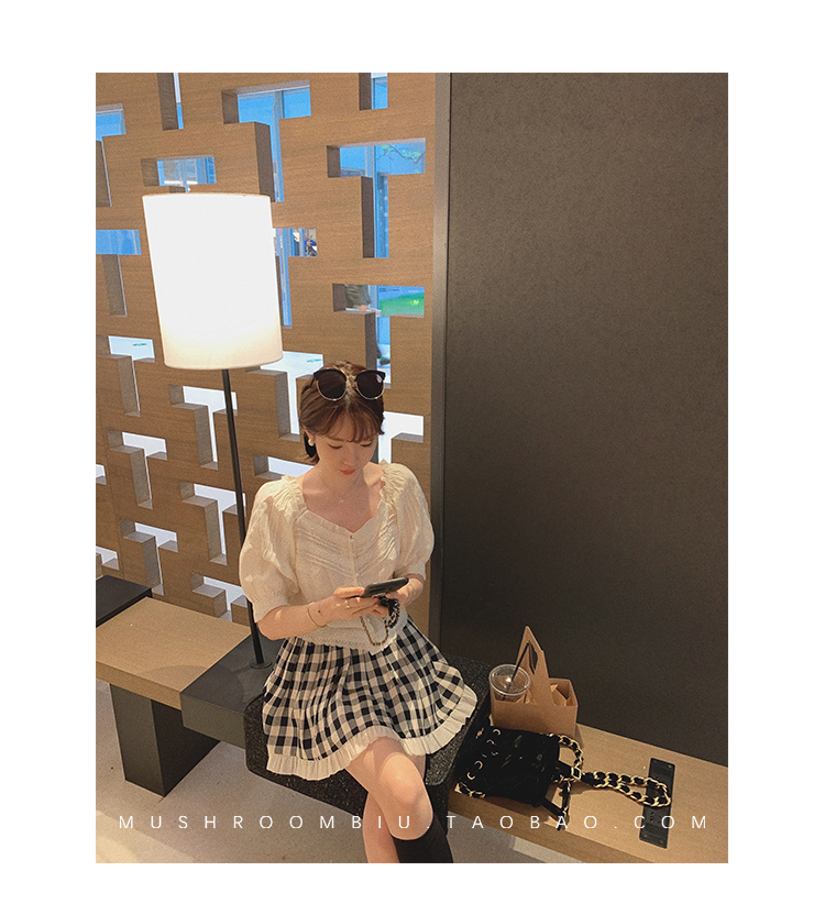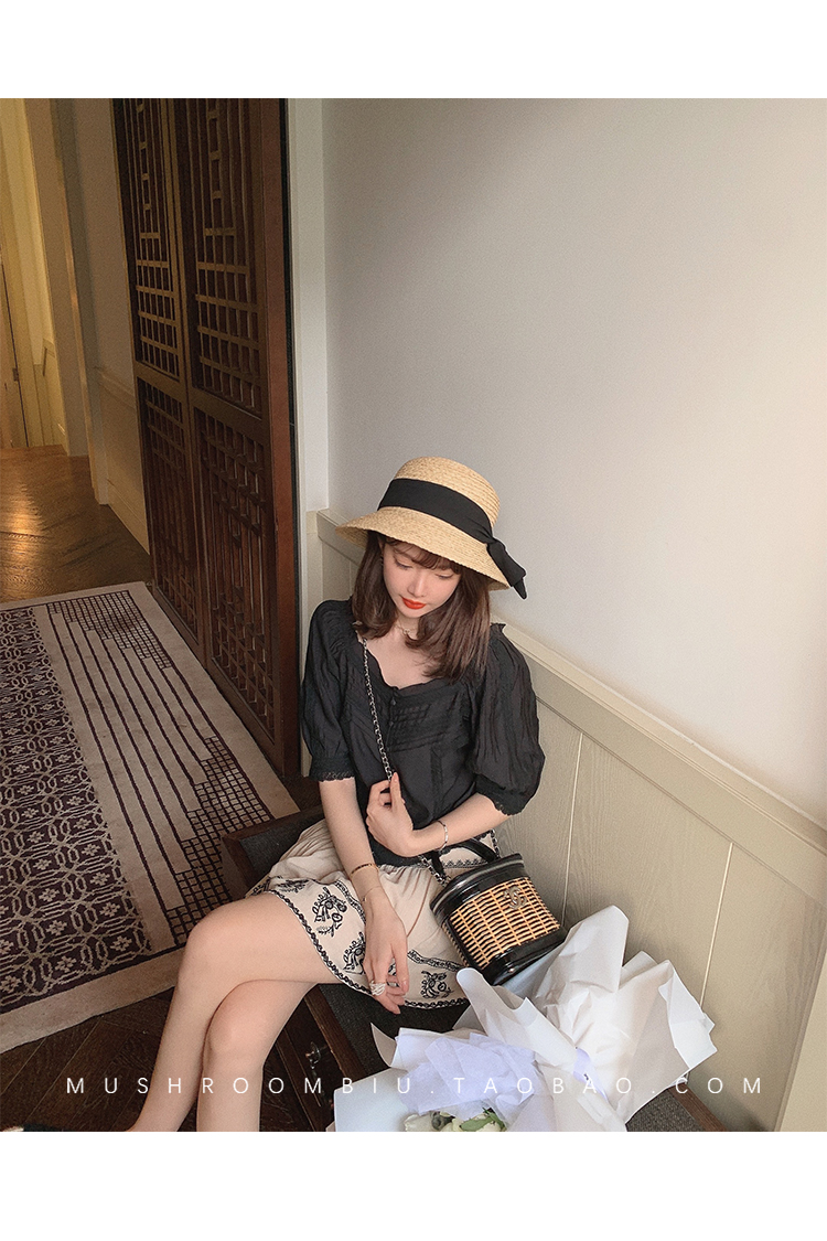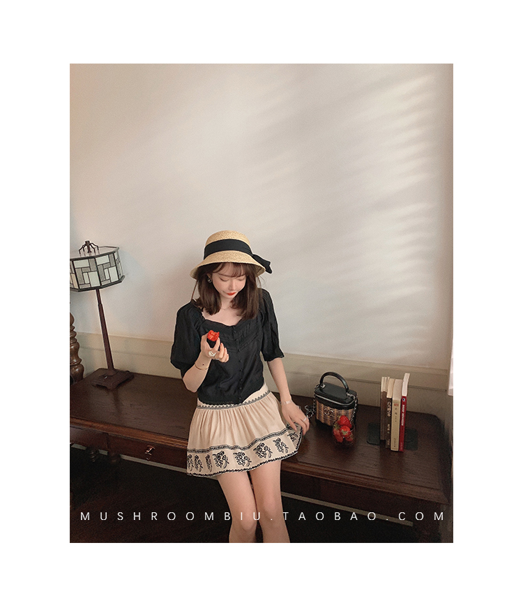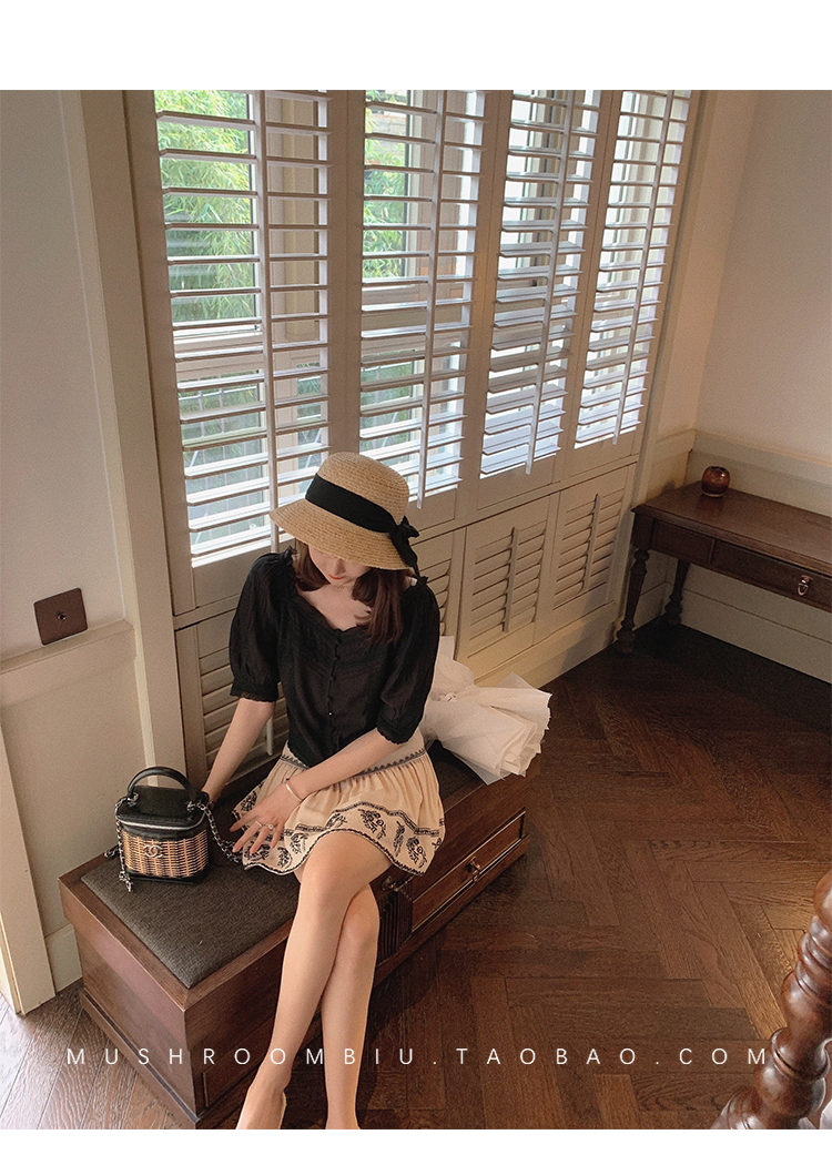 【金蘑菇菇 里斯本假日】露锁骨清柔天丝复古泡泡袖小衫短款上衣