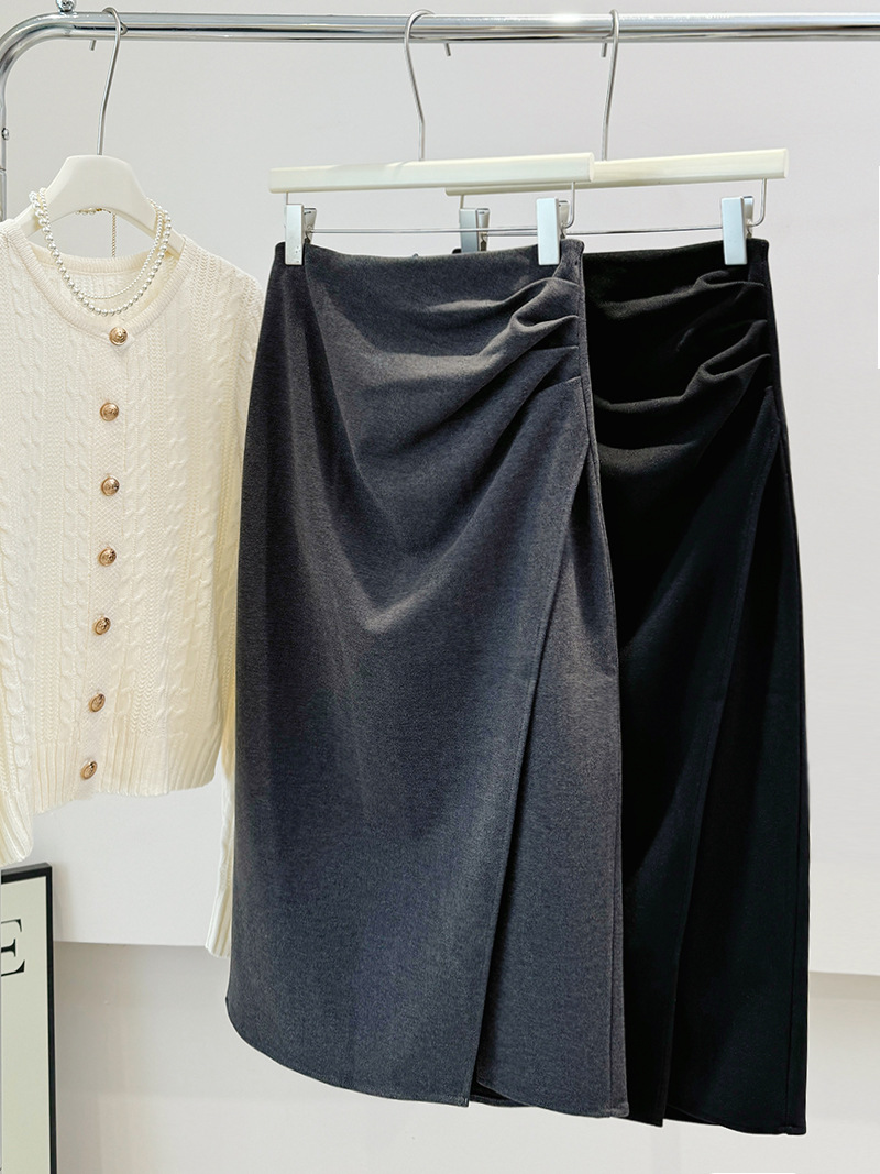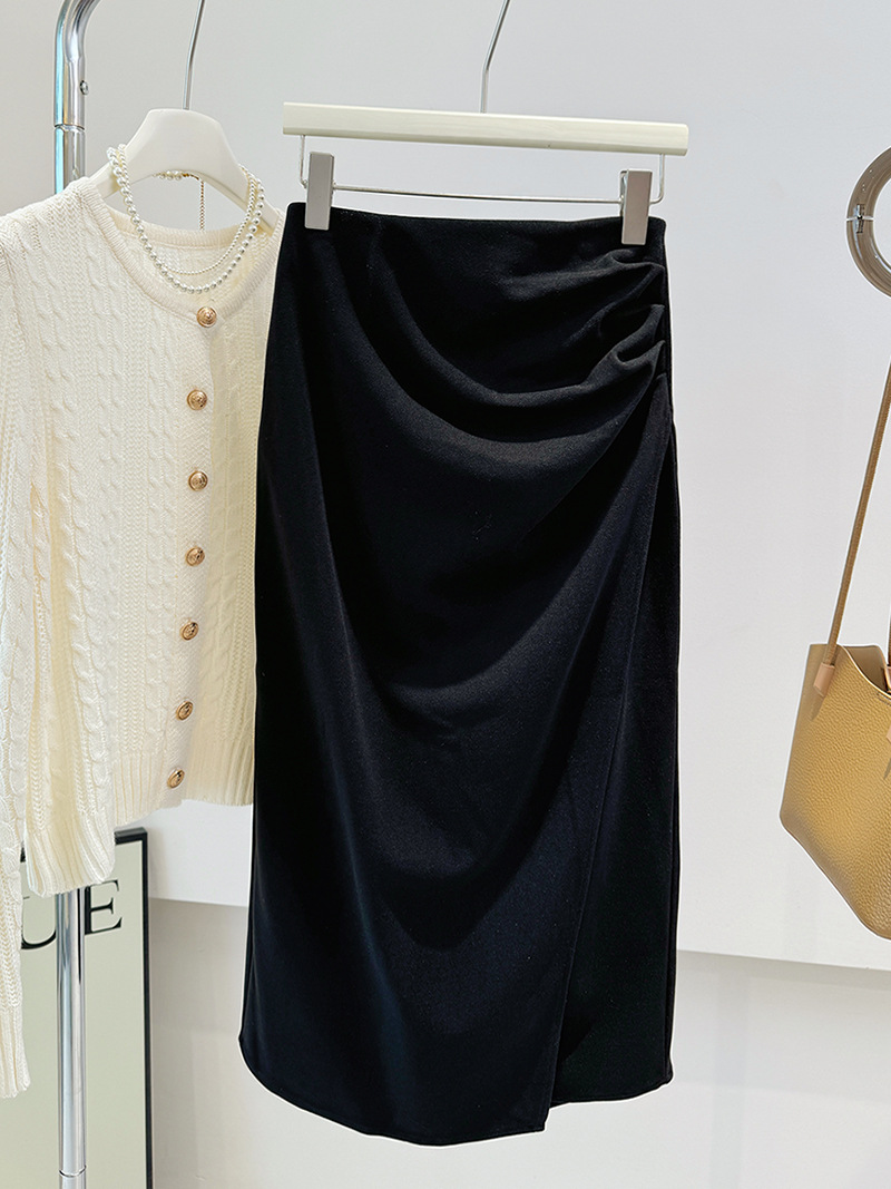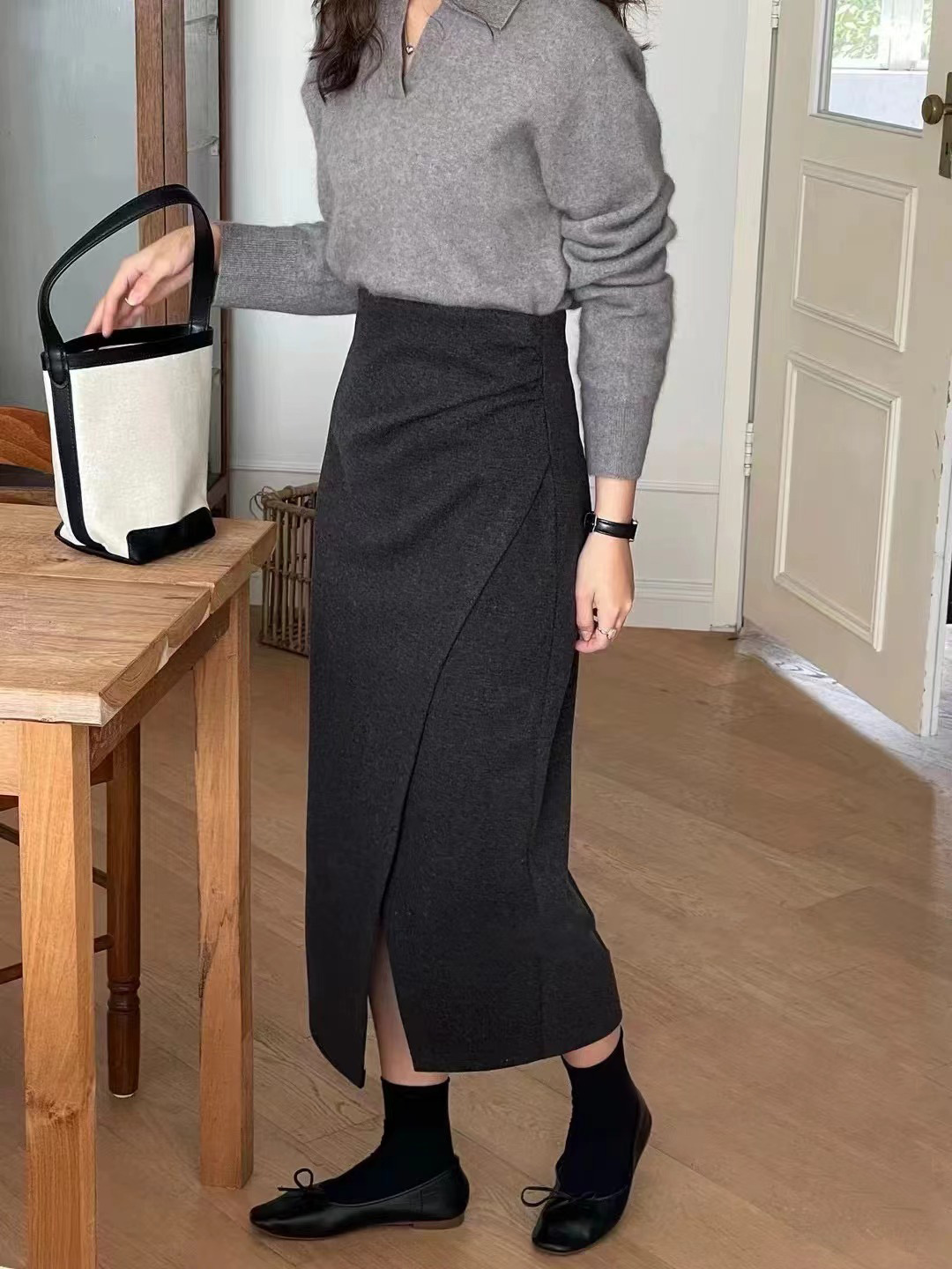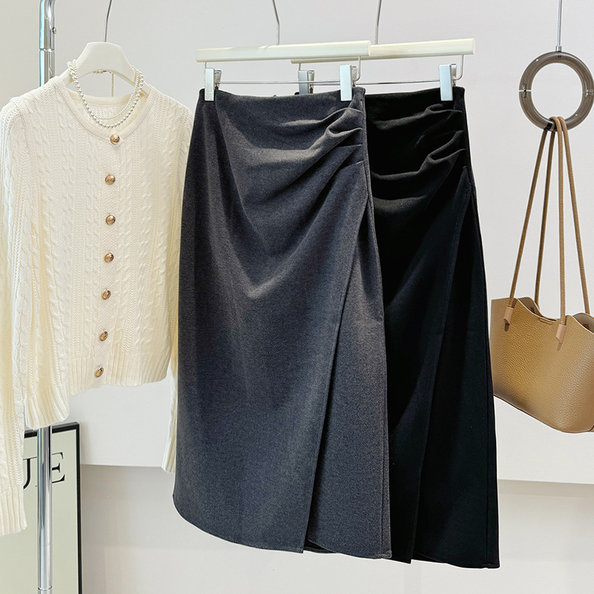 【法式褶皱包臀半身裙】高腰 秋冬新款 设计感修身显瘦 不规则开叉中长款
