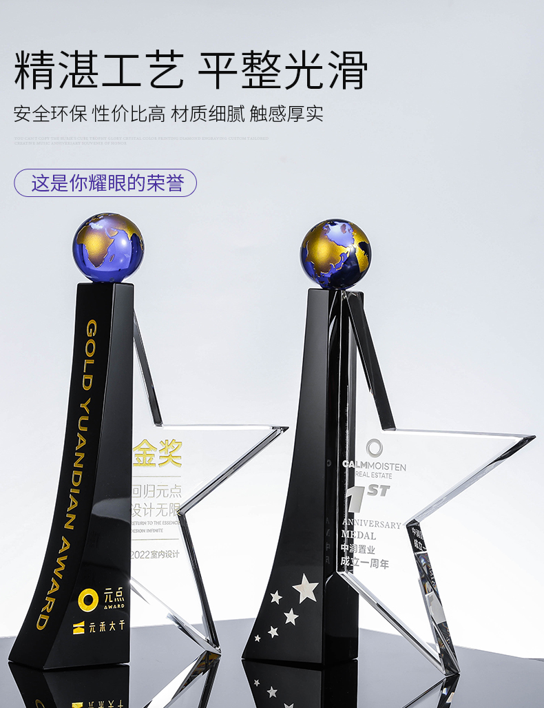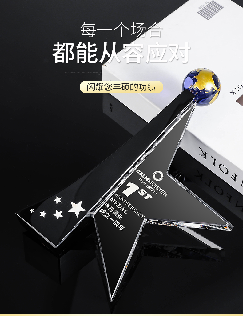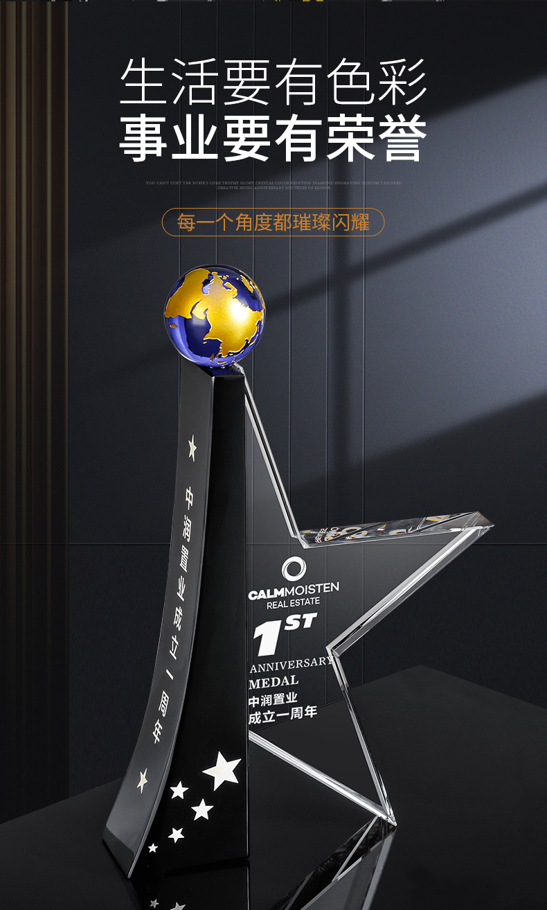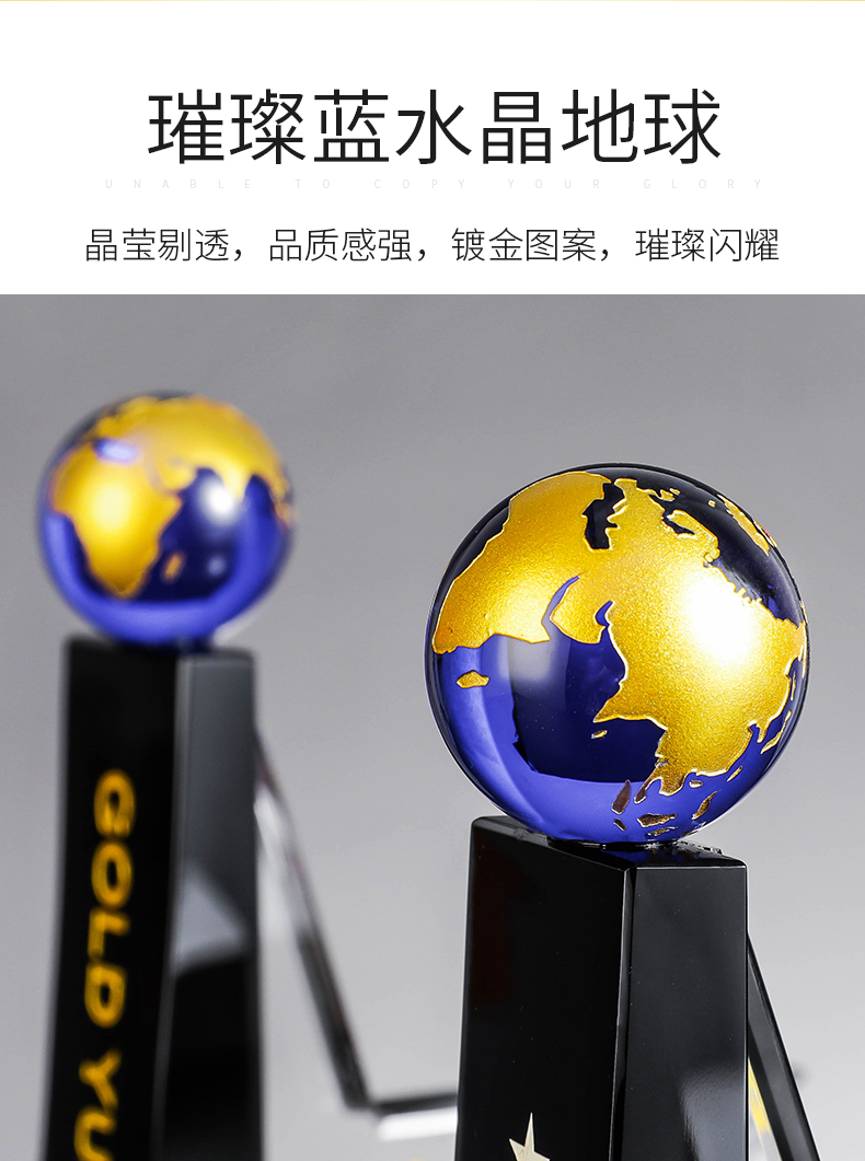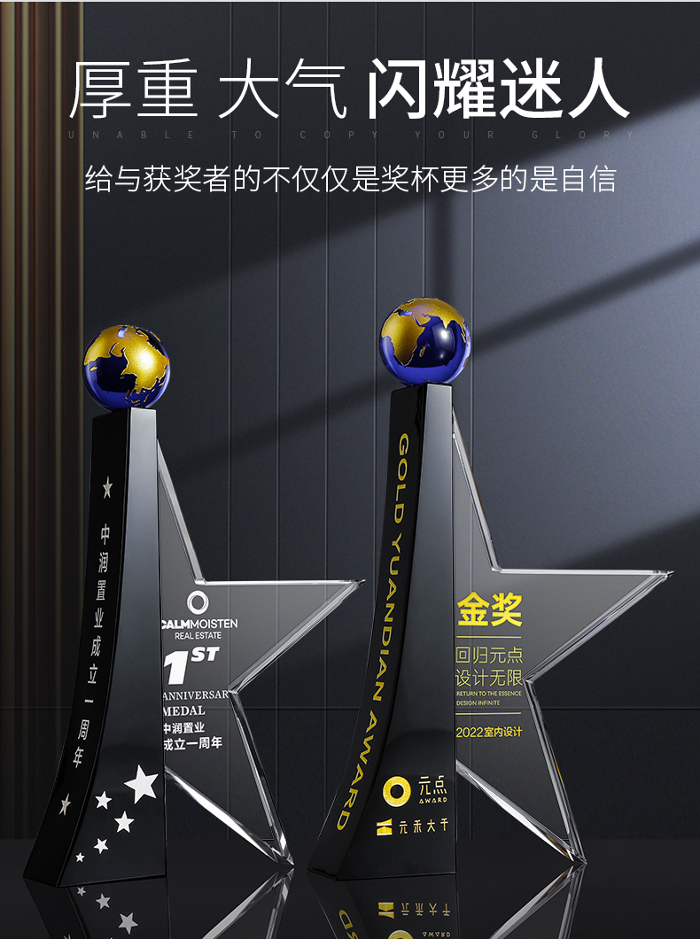 蓝色地球奖杯五角星新款2022创意奖品纪念品定制定做水晶刻字制作