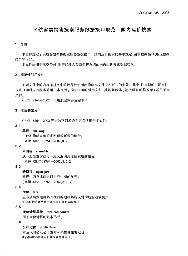 民航客票销售搜索服务数据接口规范 国内运价搜索T/CCTAS 195—2025
