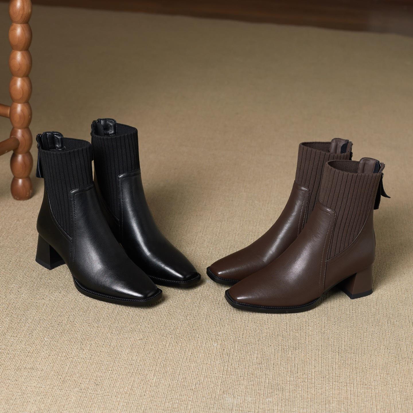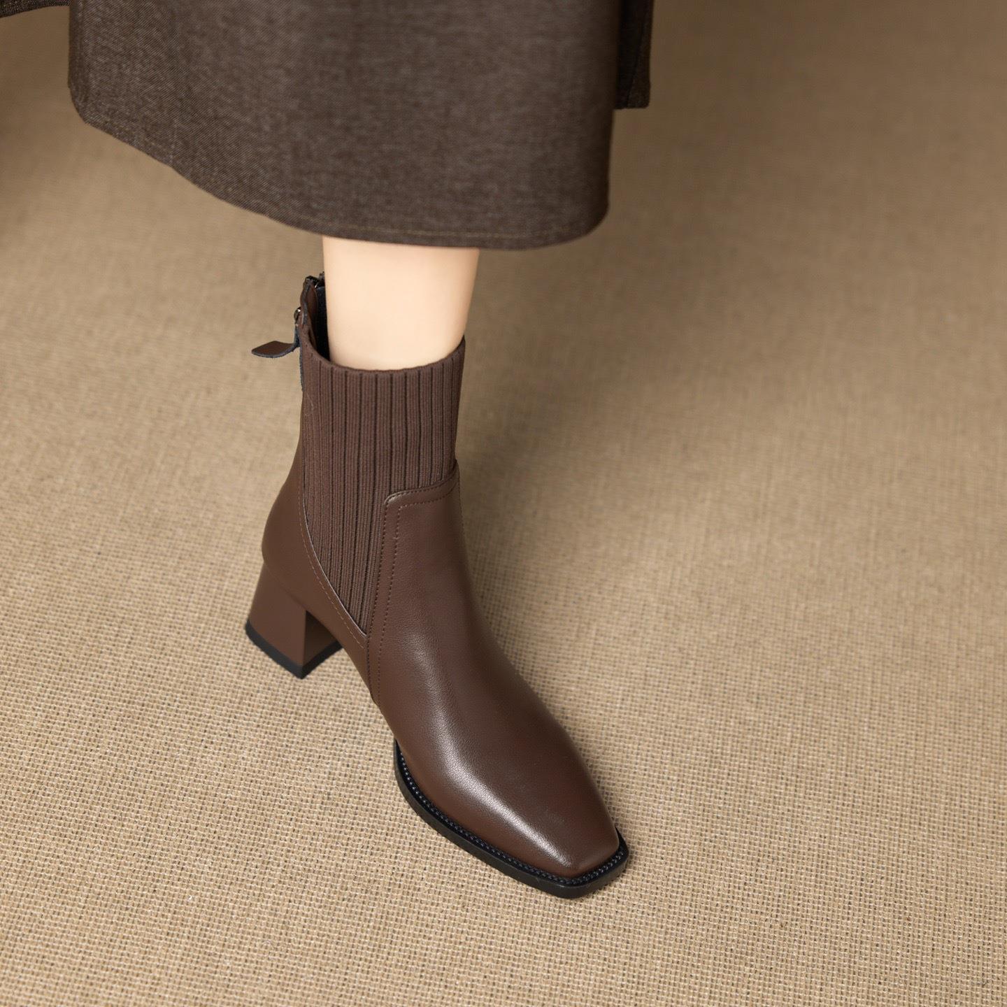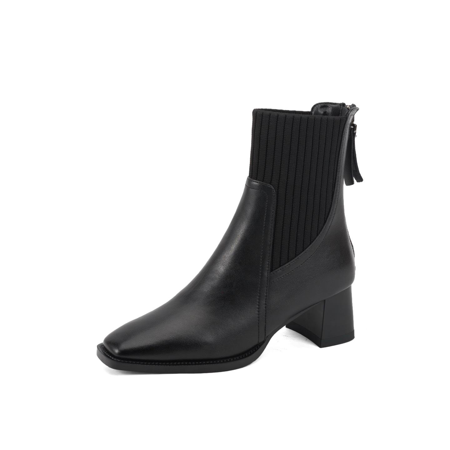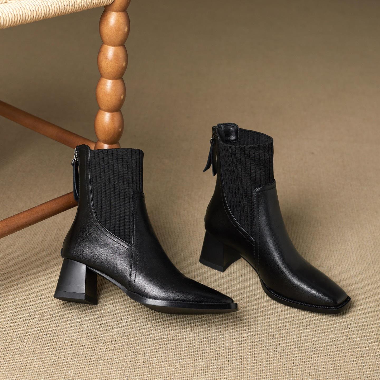 复古靴子女粗跟秋冬新款短筒马丁靴真皮方头高跟短靴时尚瘦瘦靴女