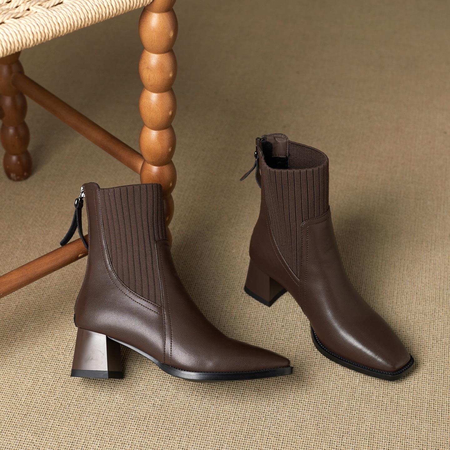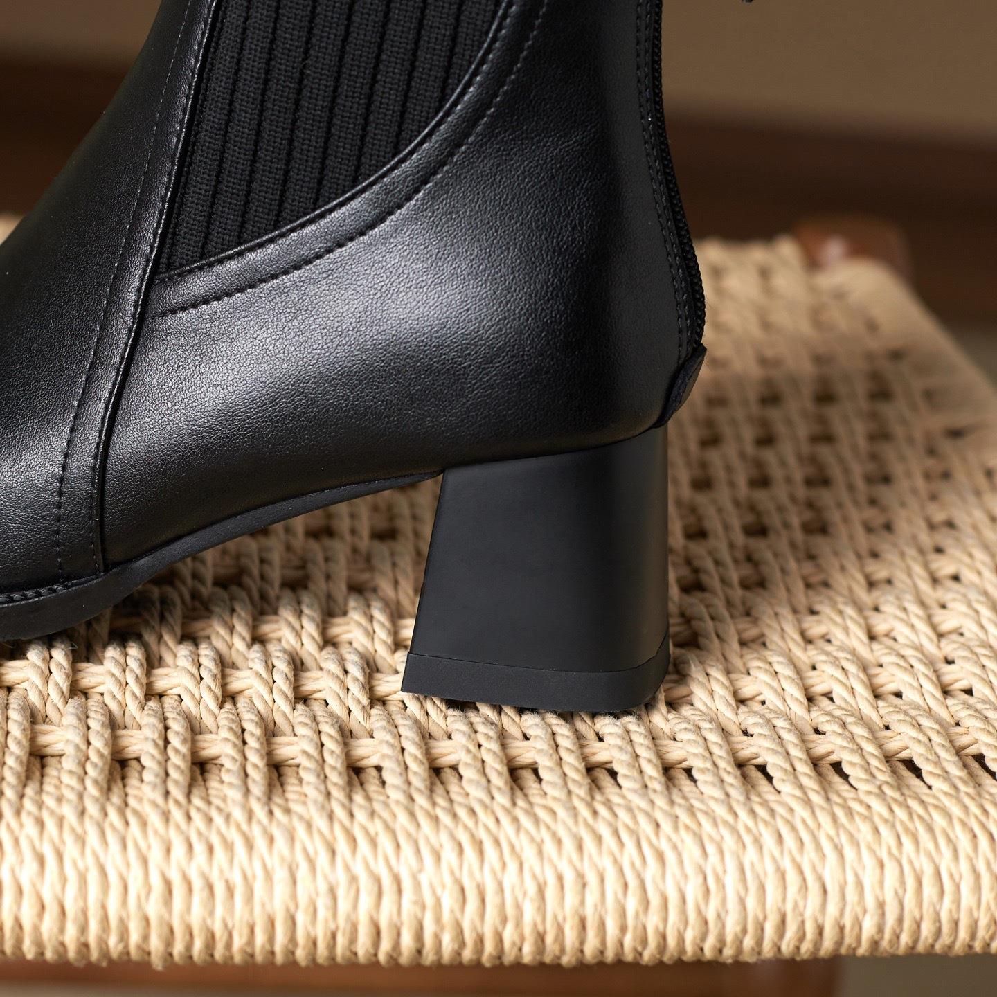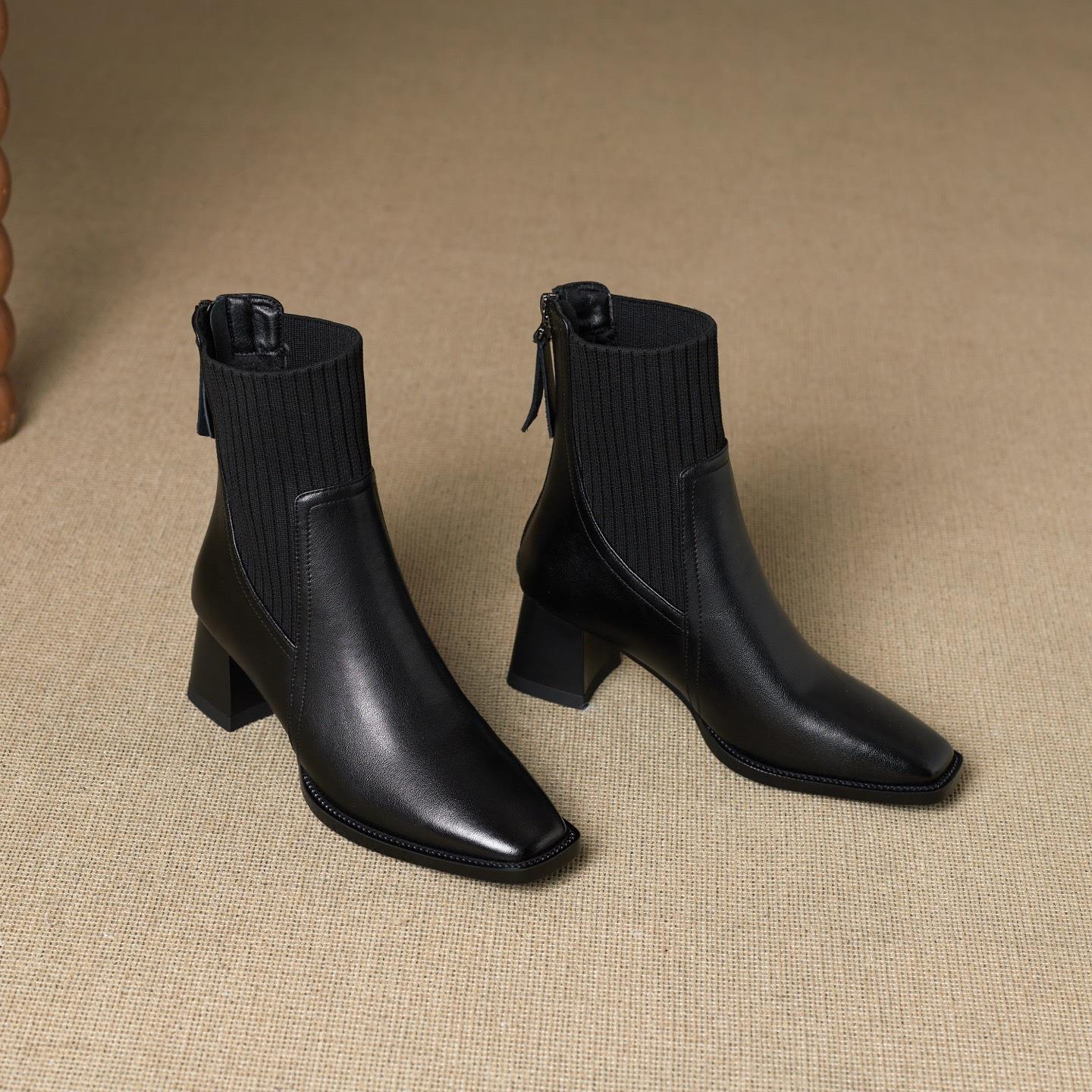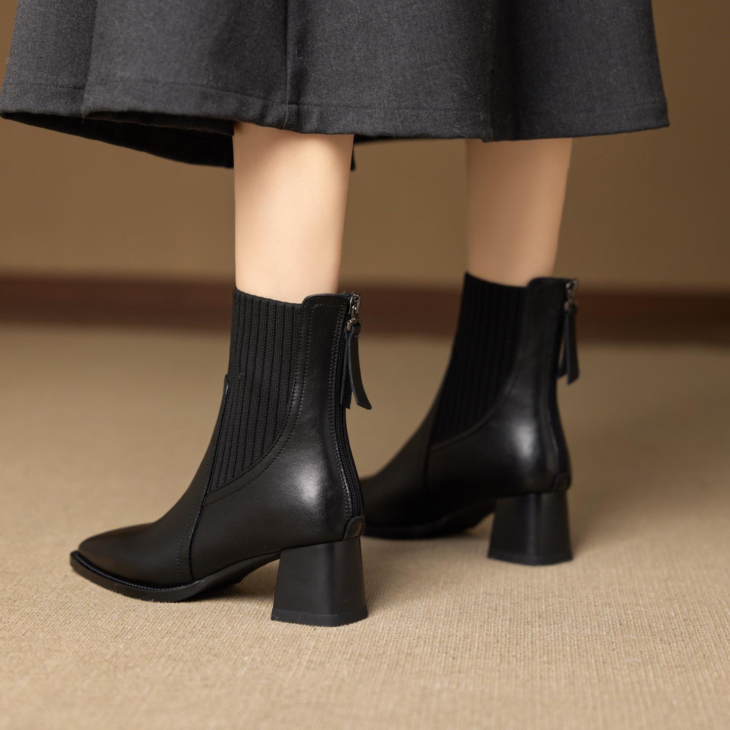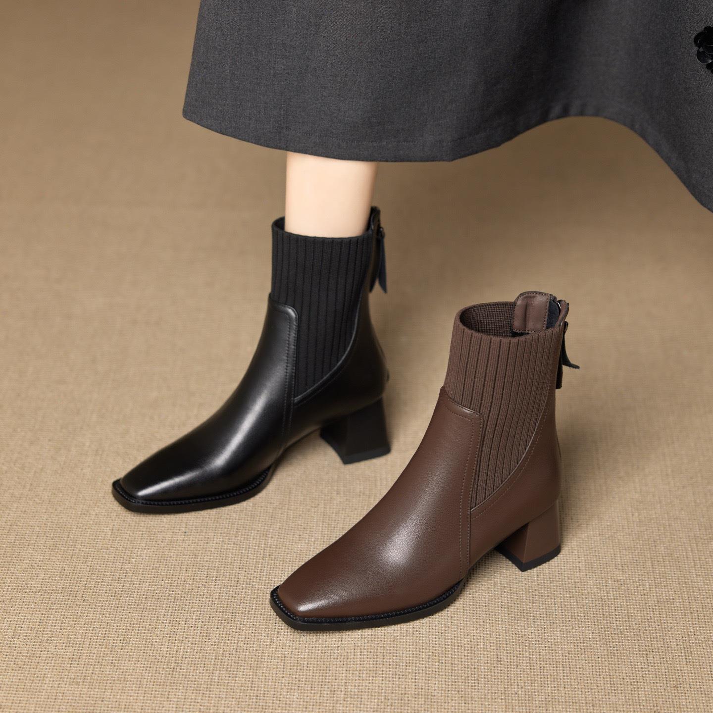 复古靴子女粗跟秋冬新款短筒马丁靴真皮方头高跟短靴时尚瘦瘦靴女
