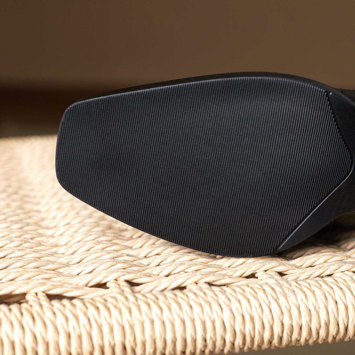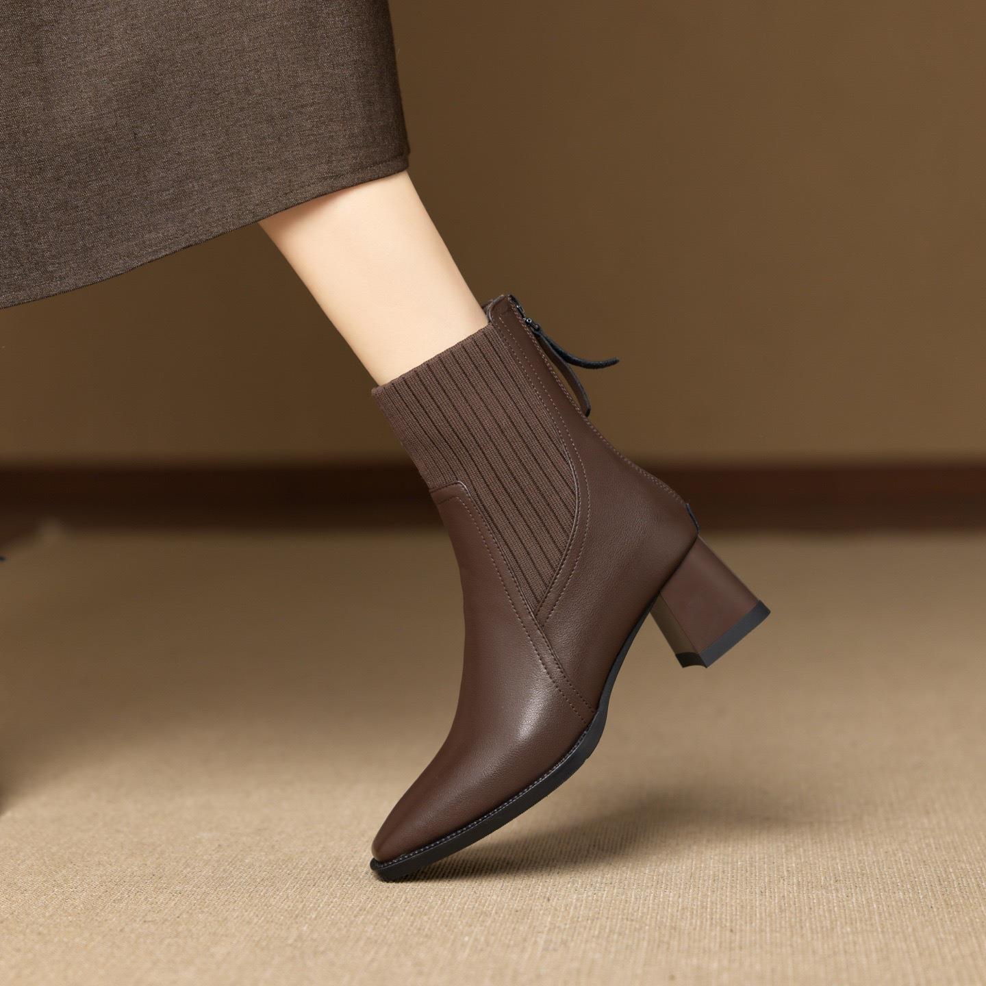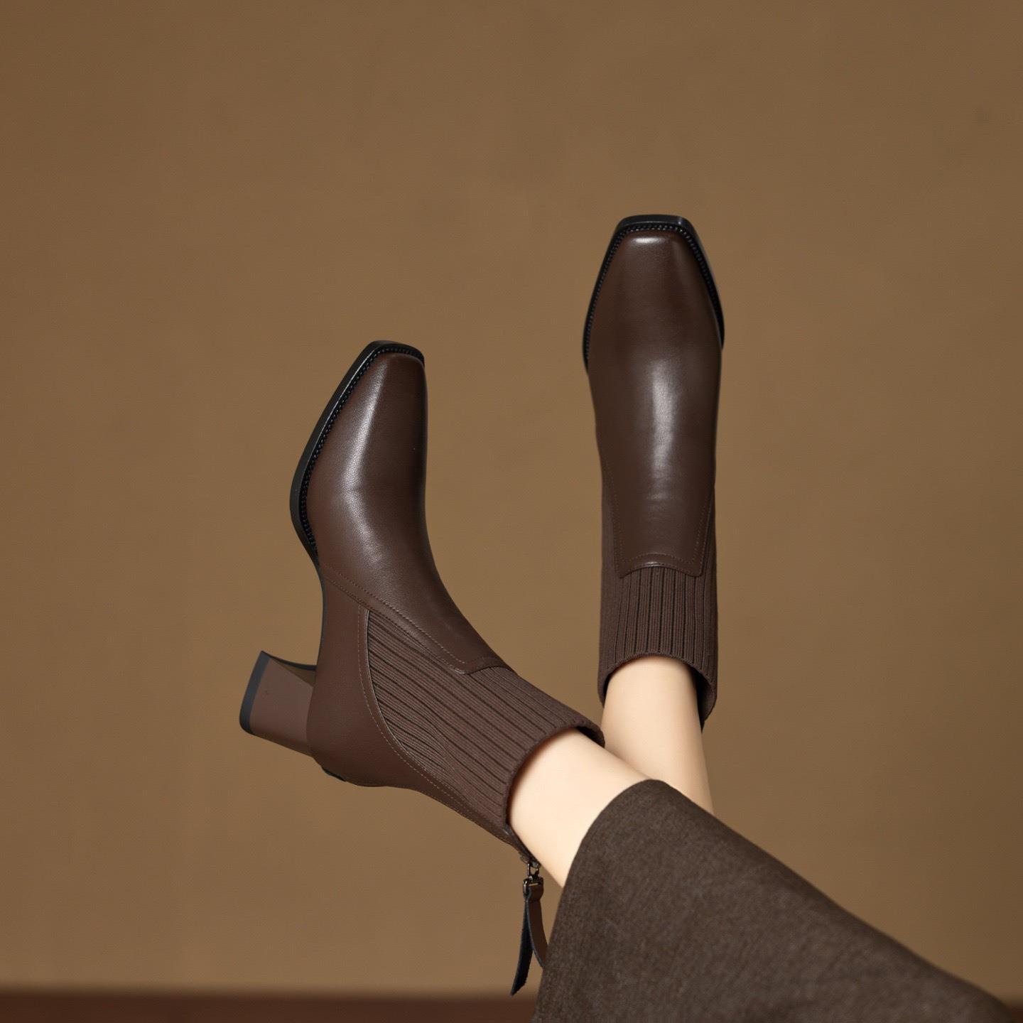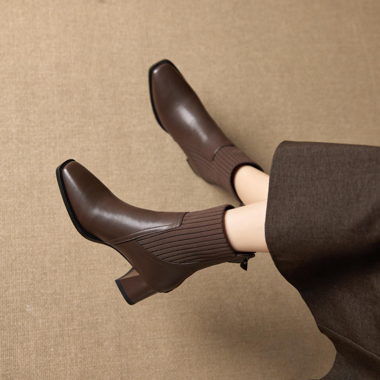 复古靴子女粗跟秋冬新款短筒马丁靴真皮方头高跟短靴时尚瘦瘦靴女