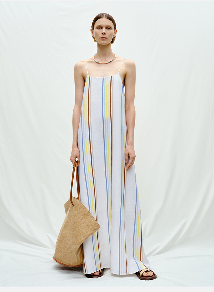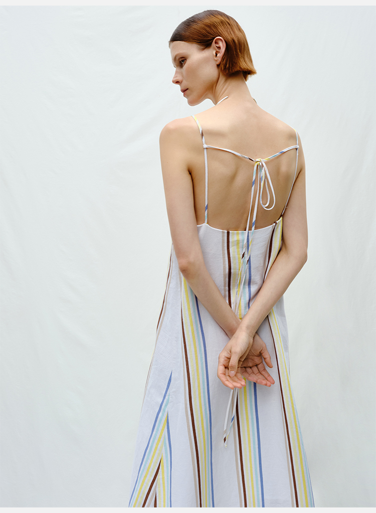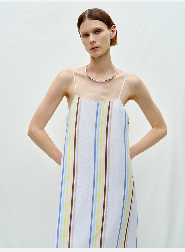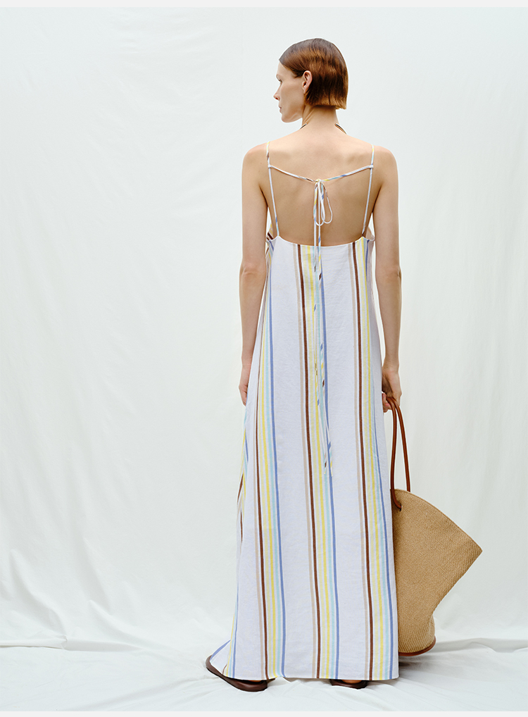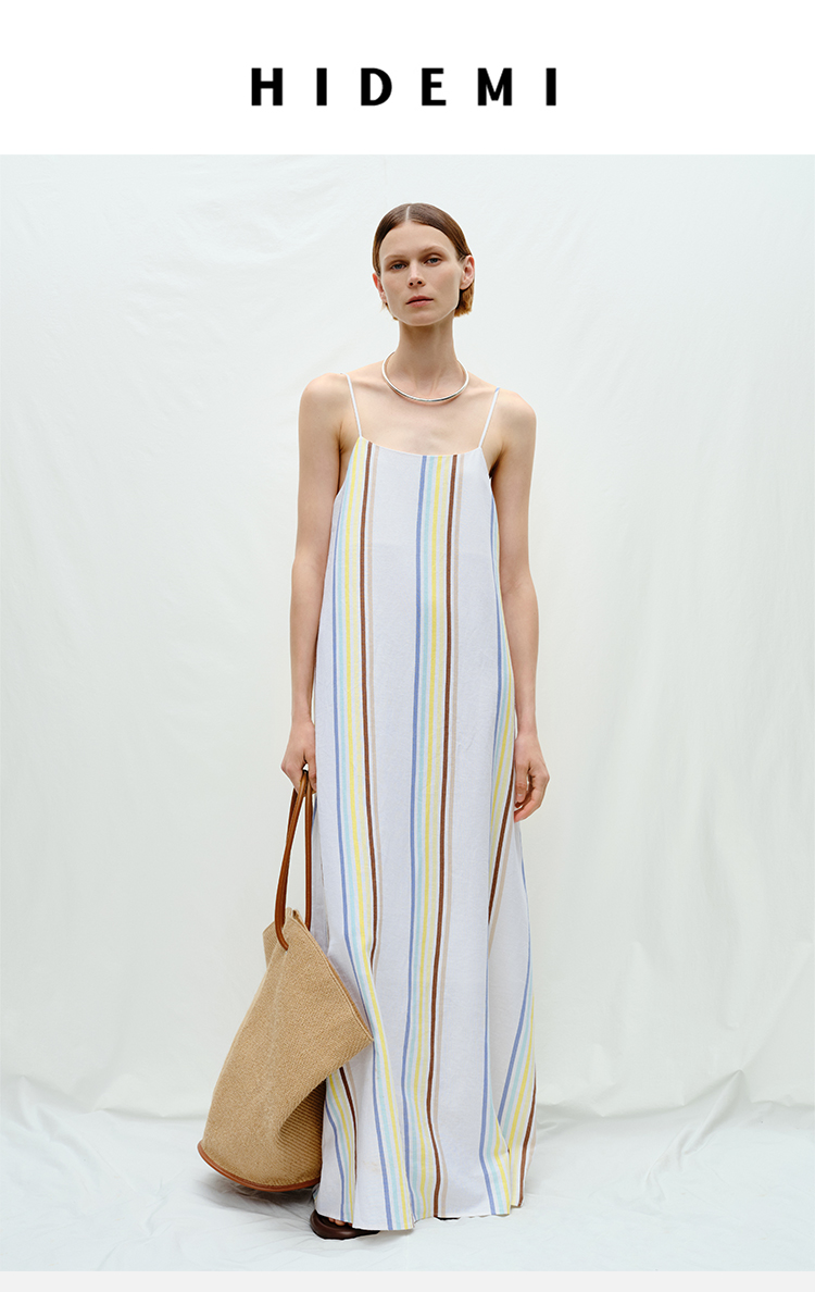 HIDEMI度假系列水洗阳光彩色条纹亚麻吊带连衣裙