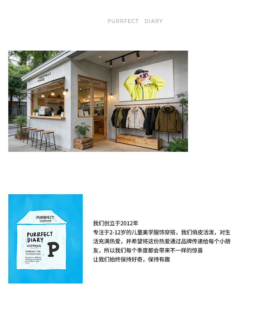 - Purrfect-Diary专注于贴近自然随性的穿着概念,轻奢平价的童装文化传播,在产品设计上更加注重婴童穿着的舒适性、安全性、更出众的国际化品牌,将欧美的育婴文化在中国进行深入的传播与推广。